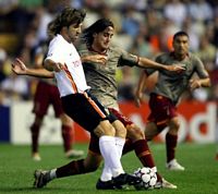 5 tifosi romanisti arrestati a Valencia e cariche della polizia nel settore giallorosso prima della partita. Per protesta i tifosi della Roma hanno ritirato tutti gli striscioni e non hanno fatto il tifo. GAZZETTA.IT VALENCIA, 27 settembre 2006 - Al Valencia nel primo tempo bastano due affondi per realizzare due gol, nella ripresa la Roma cala e il gioco spagnolo è fatto: al Mestalla finisce 2-1, nonostante la buona prova offerta dalla squadra di Spalletti, soprattutto nei primi 45'. Gli spagnoli staccano così i giallorossi nella classifica del gruppo D, e si portano a quota 6, mentre Olympiakos e Shakhtar pareggiano e chiudono il girone con un punto a testa. Spalletti gioca la mossa della prudenza rinunciando a una punta, Montella, per rinforzare il centrocampo: dentro Aquilani e Cassetti, con anche Rosi in panca. Il Valencia invece si affida a Morientes e Villa in avanti, e proprio da quest'ultimo nascono gli spunti migliori. Per il resto è una Roma che, al solito, non offre punti di riferimento all'avversaria, con Perrotta che gioca fra le linee, coprendo un'ampiezza di campo notevole. Totti è statico e poco ispirato, l'ex del Chievo lavora per tre ed è di gran lunga il giallorosso più presente e pericoloso davanti, ben supportato dalle discese di Cassetti e Tonetto in fascia. La Roma si distingue per personalità e intraprendenza, con tre occasioni di Perrotta nei primi 12': nella prima sbaglia la mira di un soffio, poi è Canizares ad opporsi, in presa e di piede. Ma è il Valencia a passare, al primo affondo. Moretti scodella in mezzo, Villa tocca il pallone in precario equilibrio, Angulo fa partire un destro di prepotenza che non lascia scampo a Doni. La Roma incassa ma non si ferma. E ristabilisce la parità in sei minuti. Moretti commette fallo su Cassetti in area, Fandel lascerebbe correre ma un guardalinee segnala che si tratta di rigore: batte Totti, il suo destro vale l'1-1 al 18'. I giallorossi spingono con fluidità e buoni fraseggi, anche se vedono poco la porta di Canizares. Ma soprattutto si macchiano di una grave disattenzione in difesa, e consentono a Villa, tutto solo al limite, di ricevere dal solito Moretti e di battere di destro realizzando il 2-1. Due minuti dopo Pizarro potrebbe firmare la rimonta, ma è ancora Canizares a dire di no. Nella ripresa la Roma riparte da Montella, subentrato ad Aquilani. Ma la squadra ha perso lo slancio iniziale, non riesce a farsi pericolosa, l'attacco non punge. Il Valencia si limita a un controllo poco più che ordinario della gara, ma tanto le basta per tenerla in pugno. E visto che la situazione non si sblocca, Spalletti gioca anche la carta Okaka (per Cassetti) dal 20'. Ma non cambia un granché, mentre il Valencia si fa insidioso con folate offensive veloci e ficcanti che scuotono una difesa sicura solo con Chivu. Poi Sanchez Flores toglie Villa (27'), il pubblico gli dedica una standing ovation, la Roma ringrazia e sembra trarre coraggio dalla sostituzione. Ma è un fuoco di paglia, perchè la Roma è stanca e non riesce più a giocare in velocità, e quindi diventa prevedibile ed arginabile. Il resto lo fa l'ottima organizzazione spagnola, che chiude il match in scioltezza e legittima così i due gol di vantaggio. |