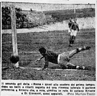 ![]() L’On. Baldassarre, Commissario della Roma, offre al Commissario del Napoli una Coppa. Riconoscibili i giocatori Krieziu, Forlivesi e Jacobini |