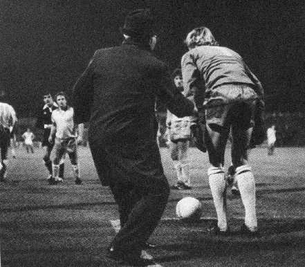 I tifosi invadono il "pitch", il terreno di gioco per andare verso i rivali: anche questa è una forma rituale di provocazione che raramente va oltre i lancio di oggetti |