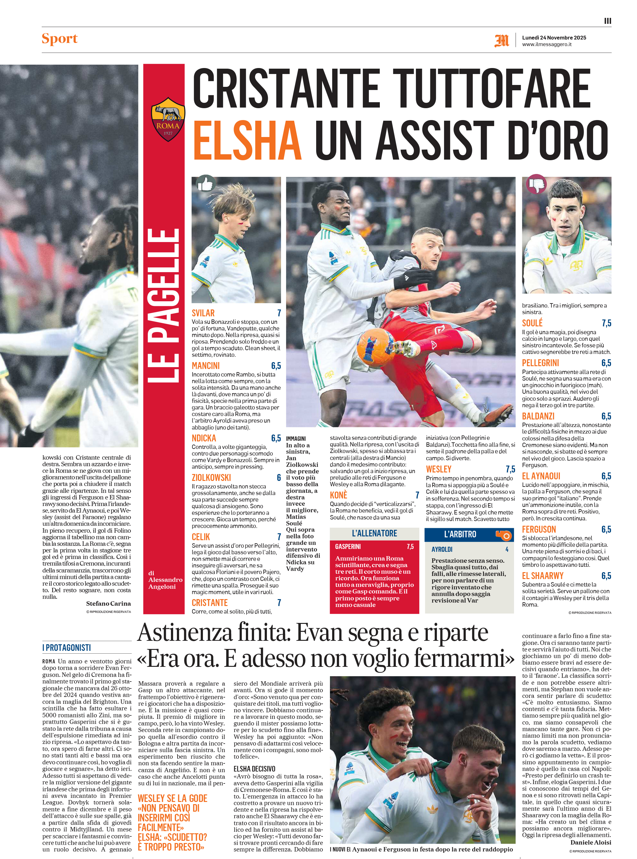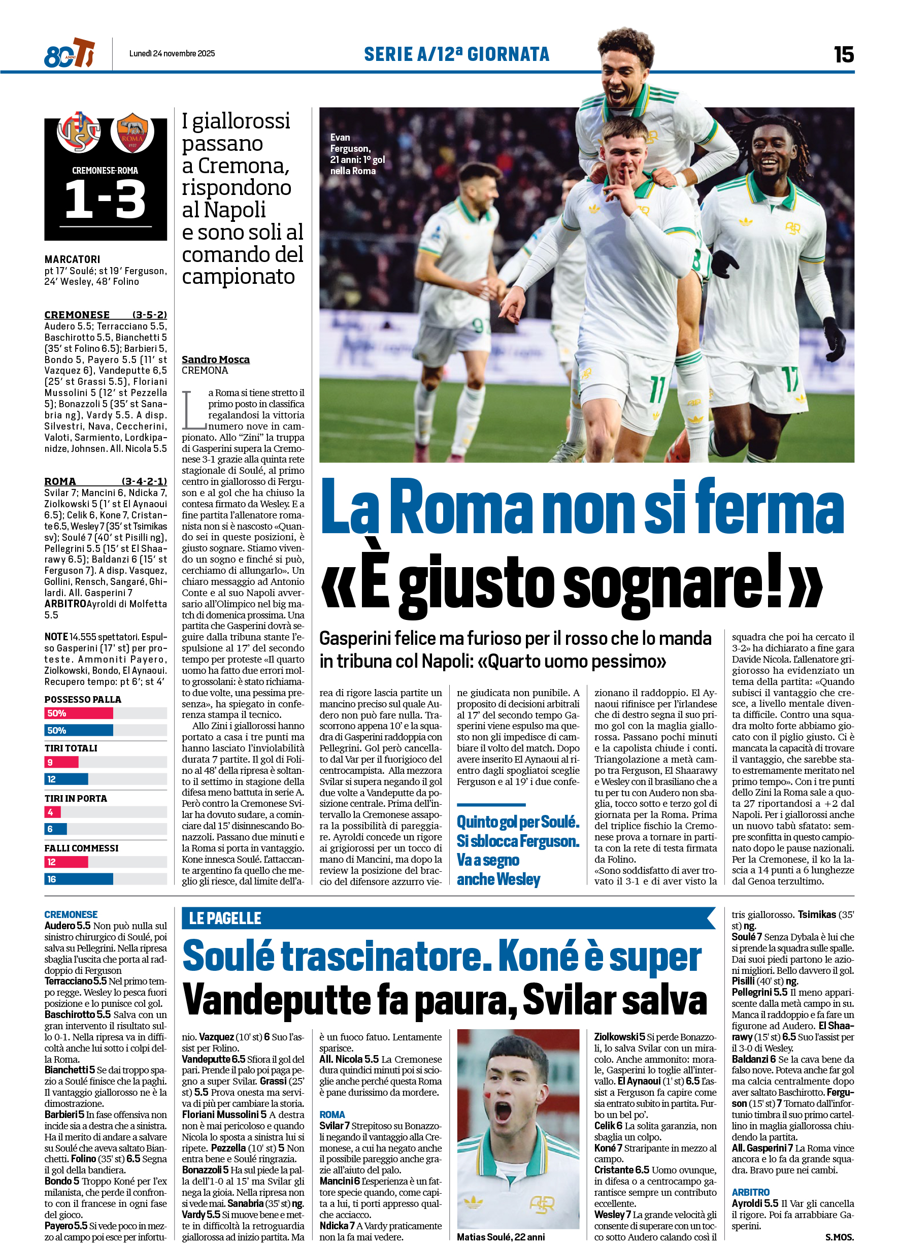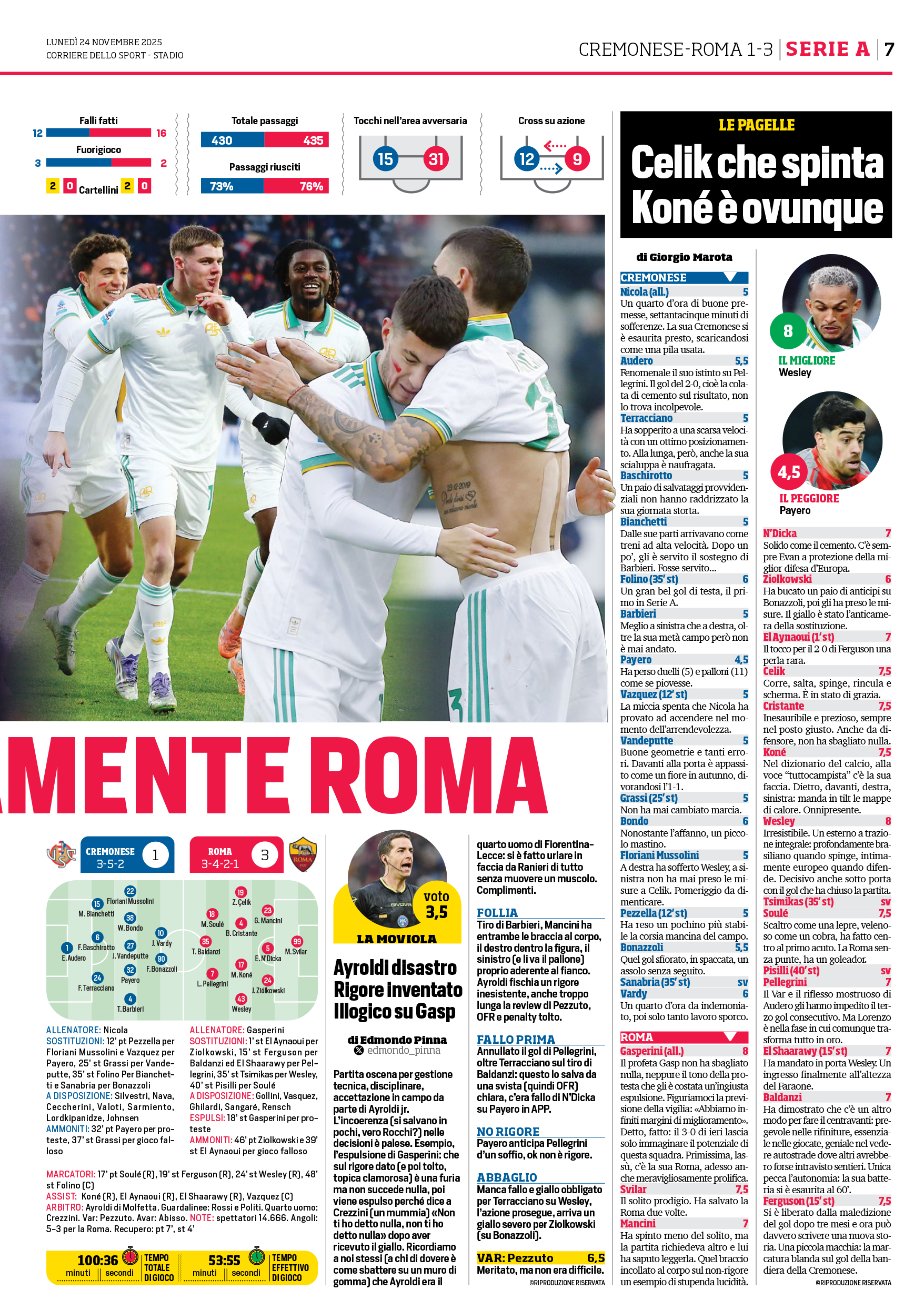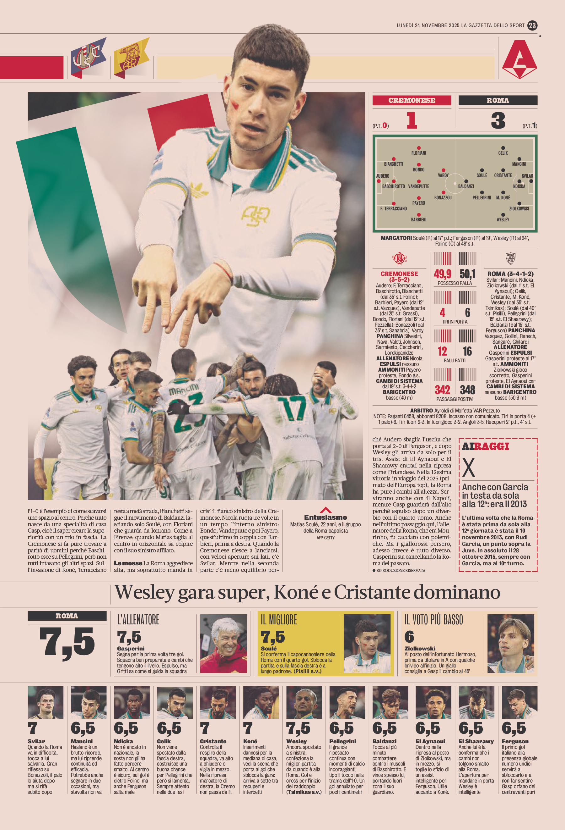 Cristante, Koné, Wesley (80′ Tsimikas); Soulé (85′