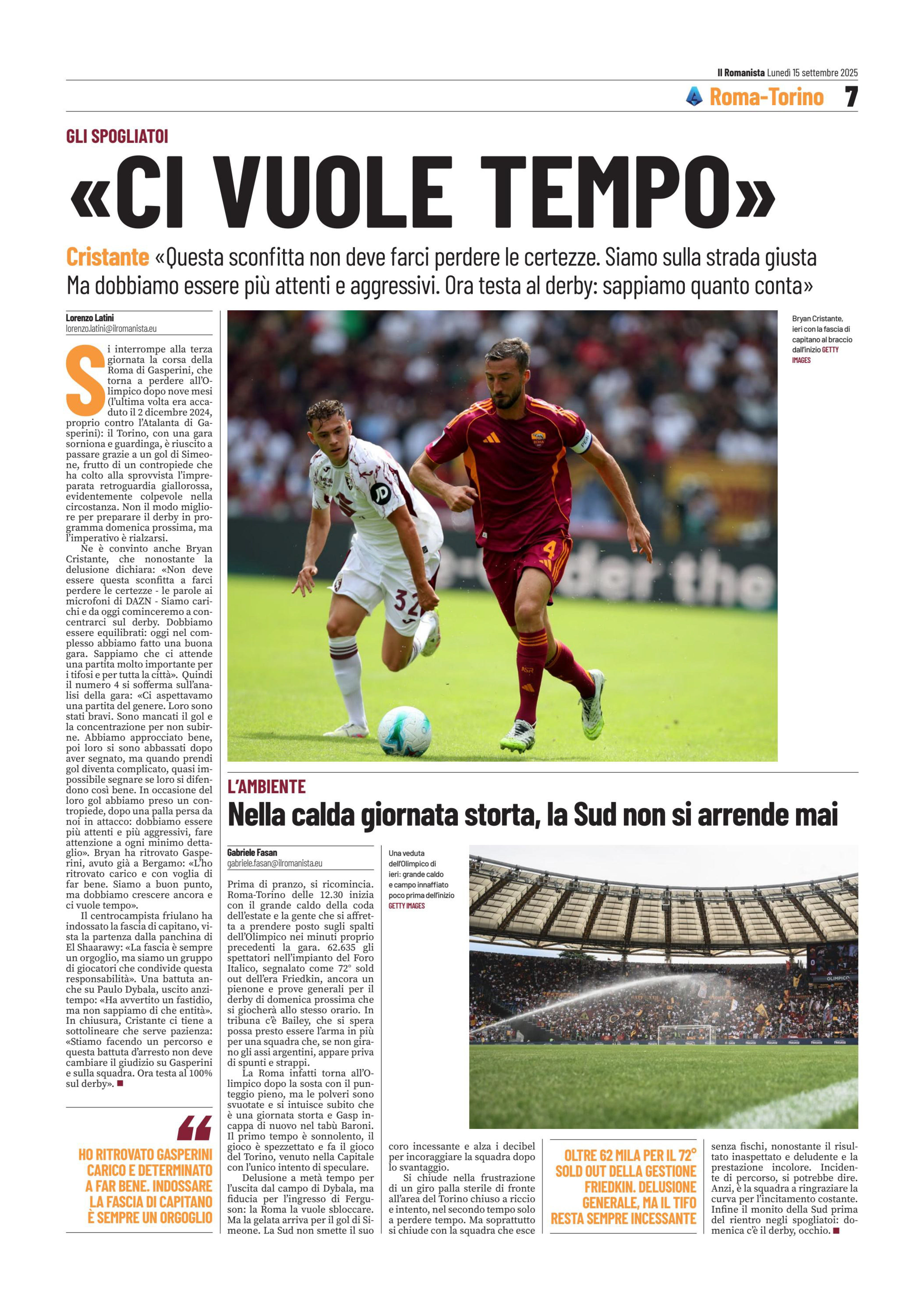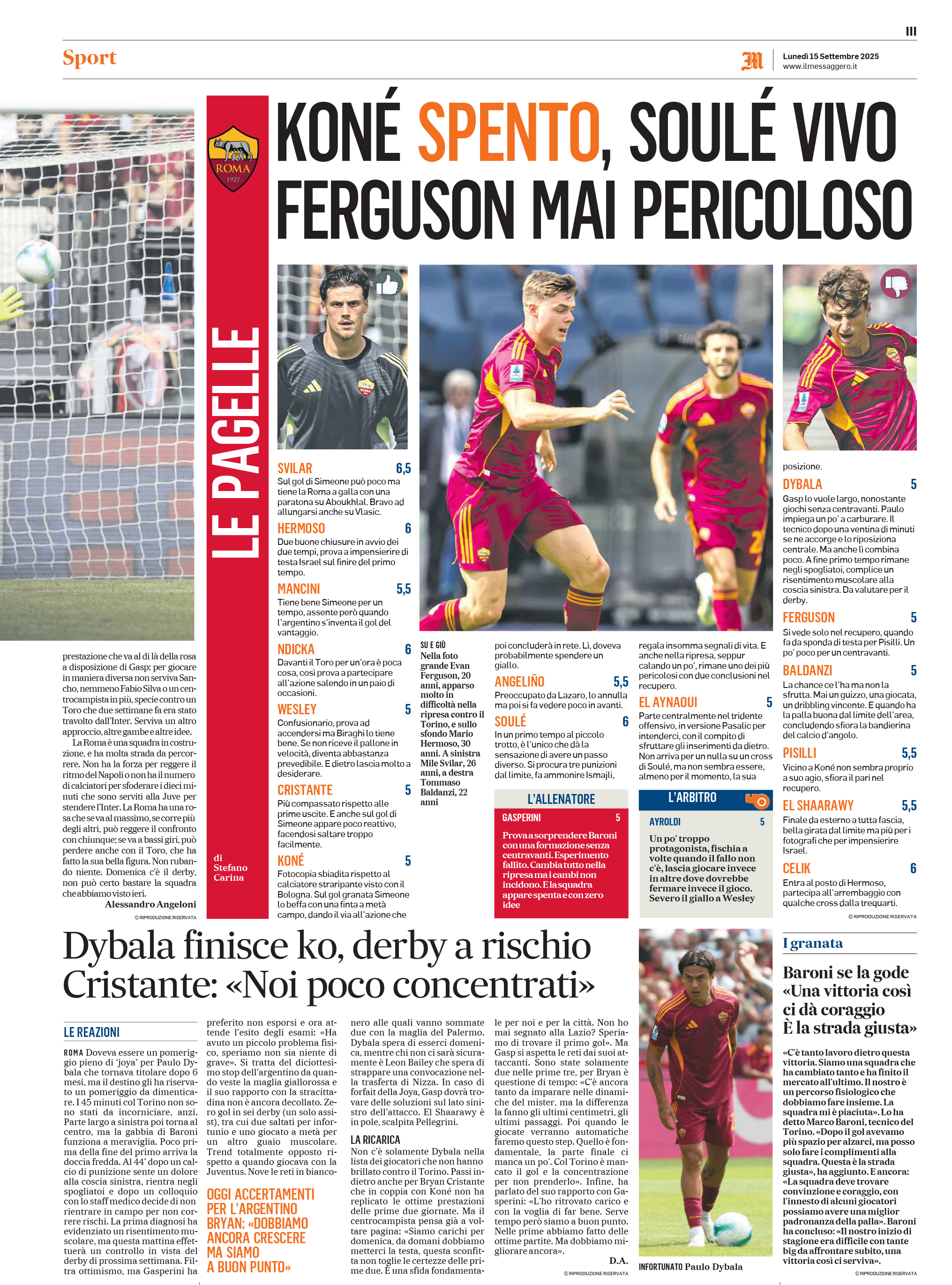 Koné 5.5, Cristante 6 (65' Pisilli 6), Angelino 5.5