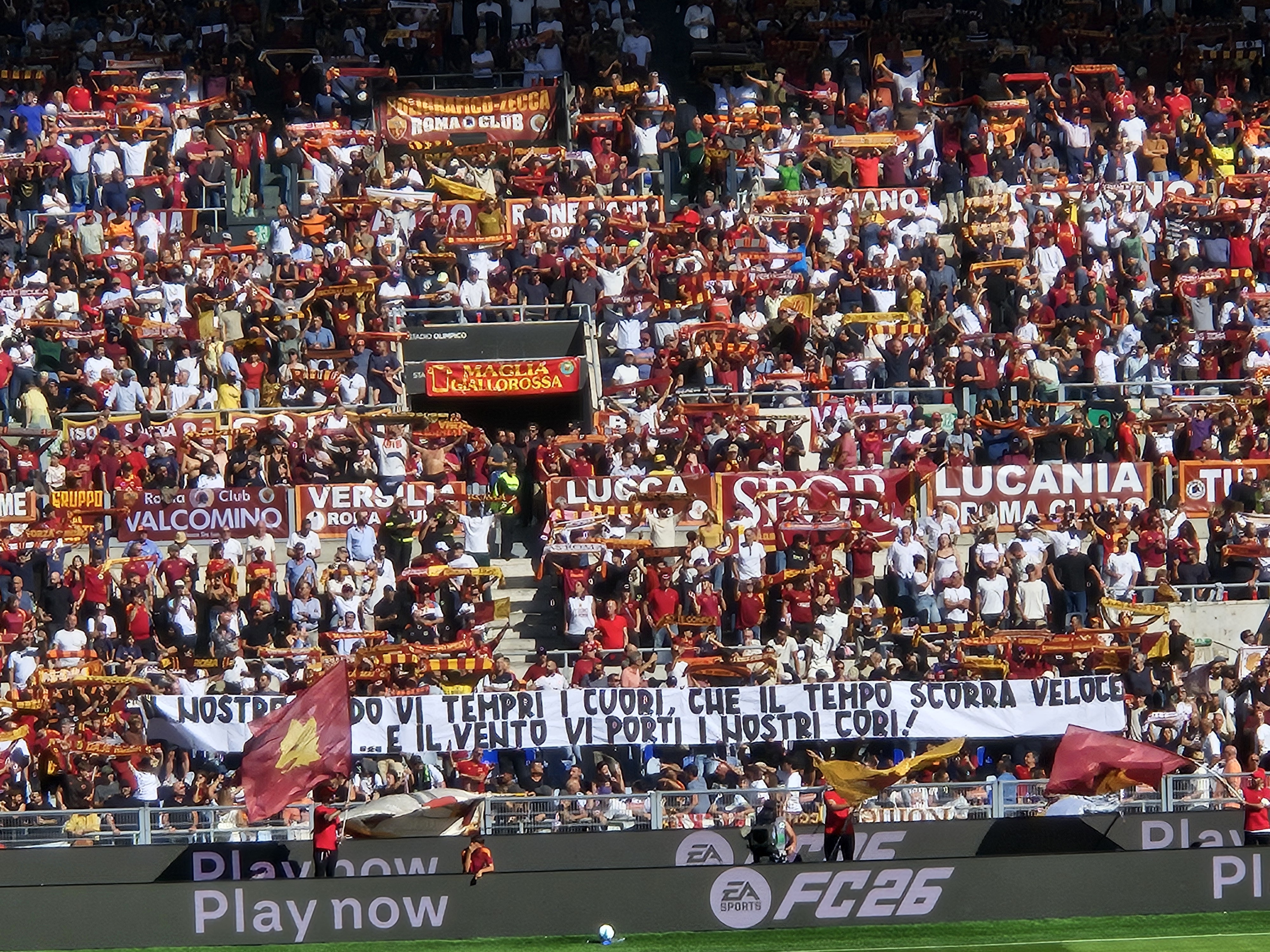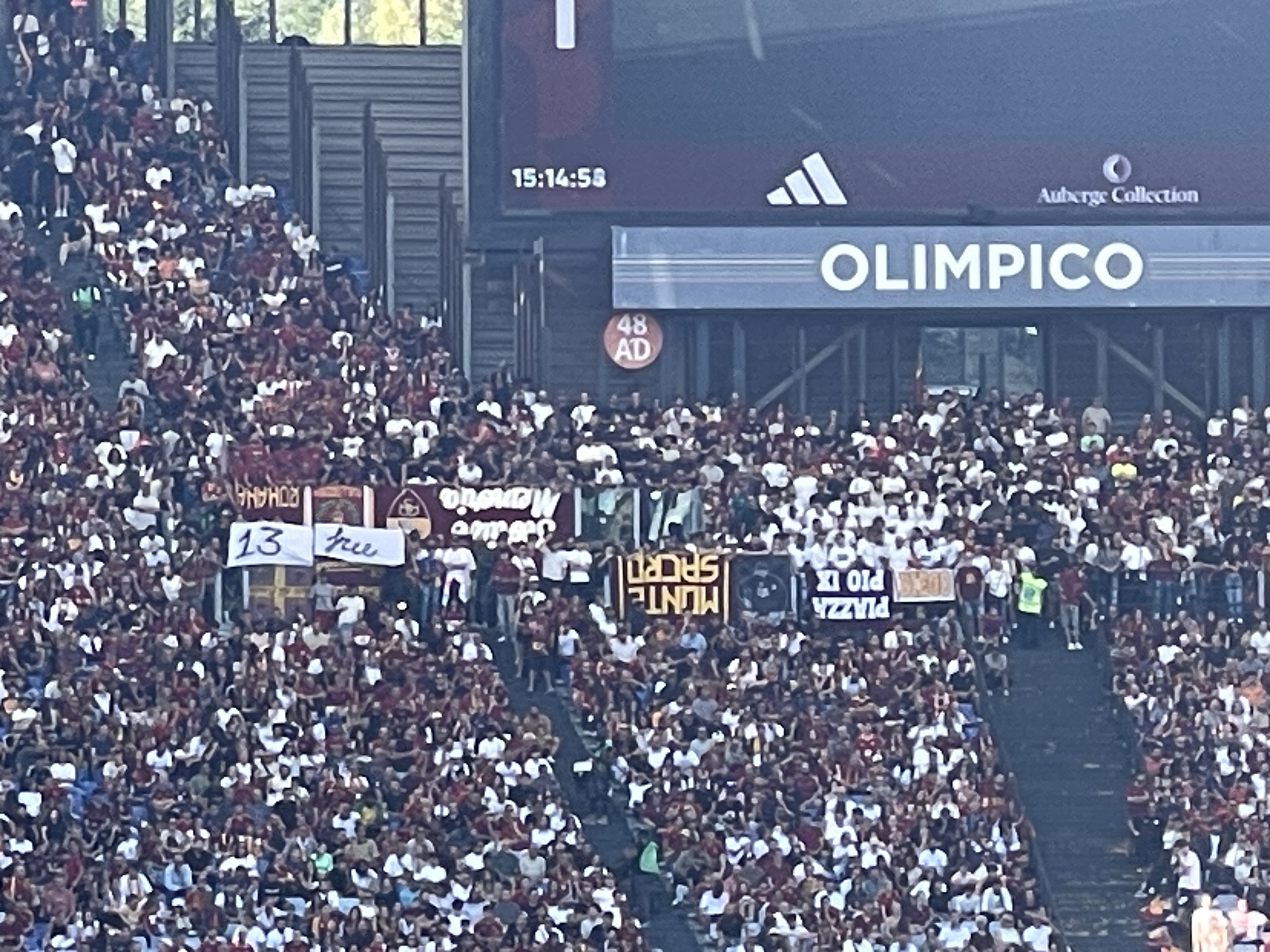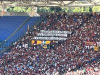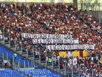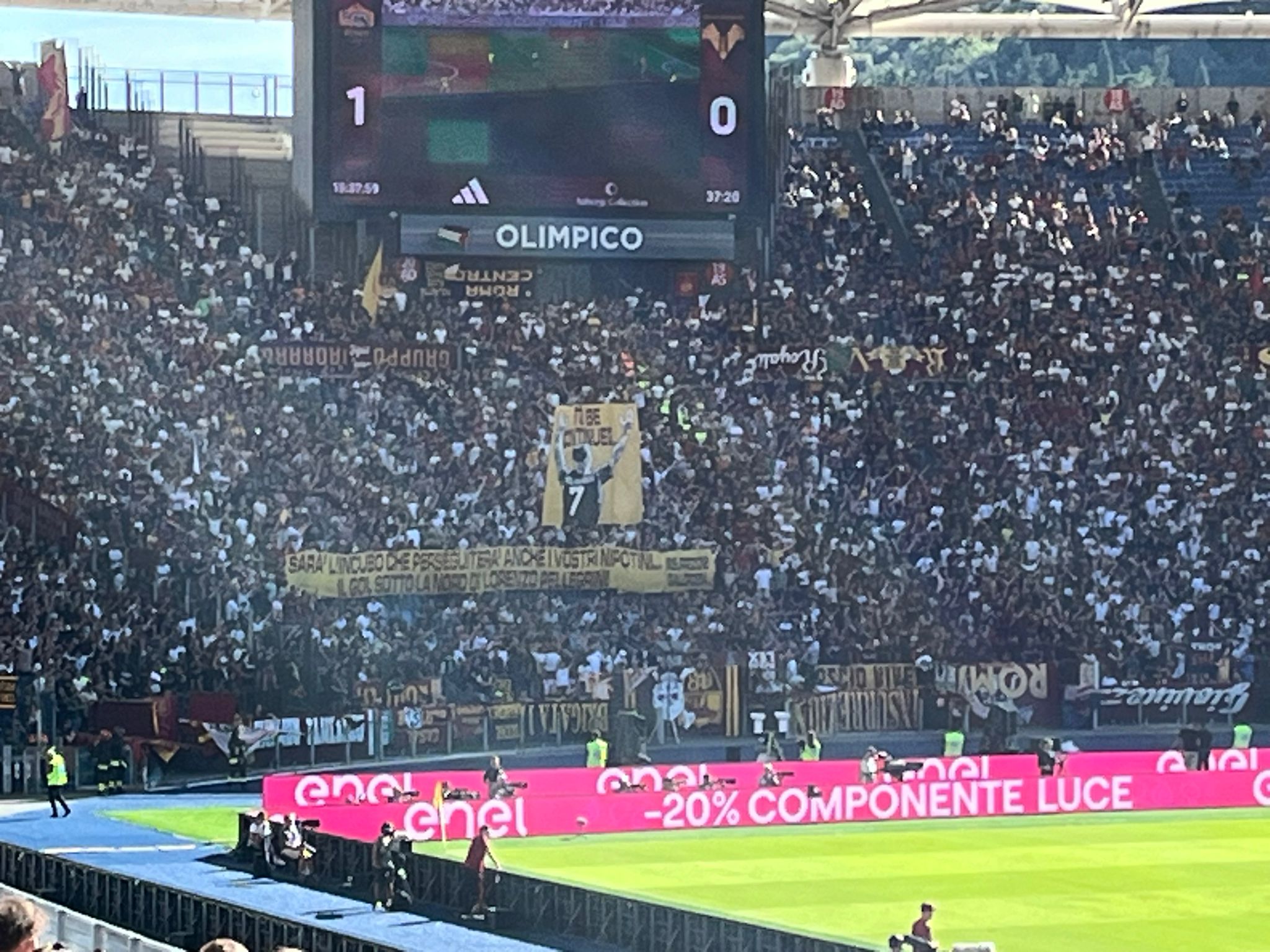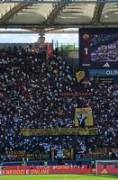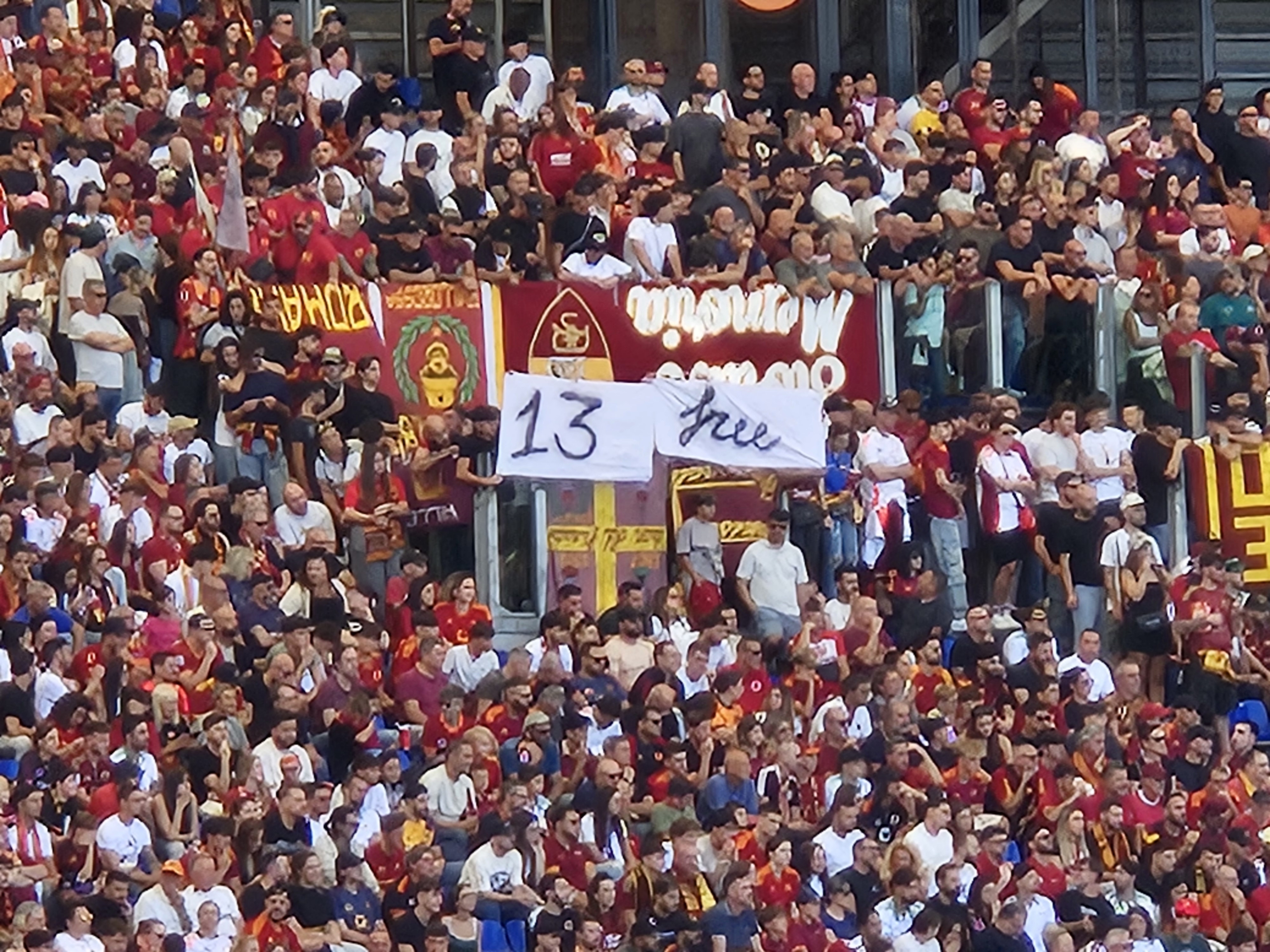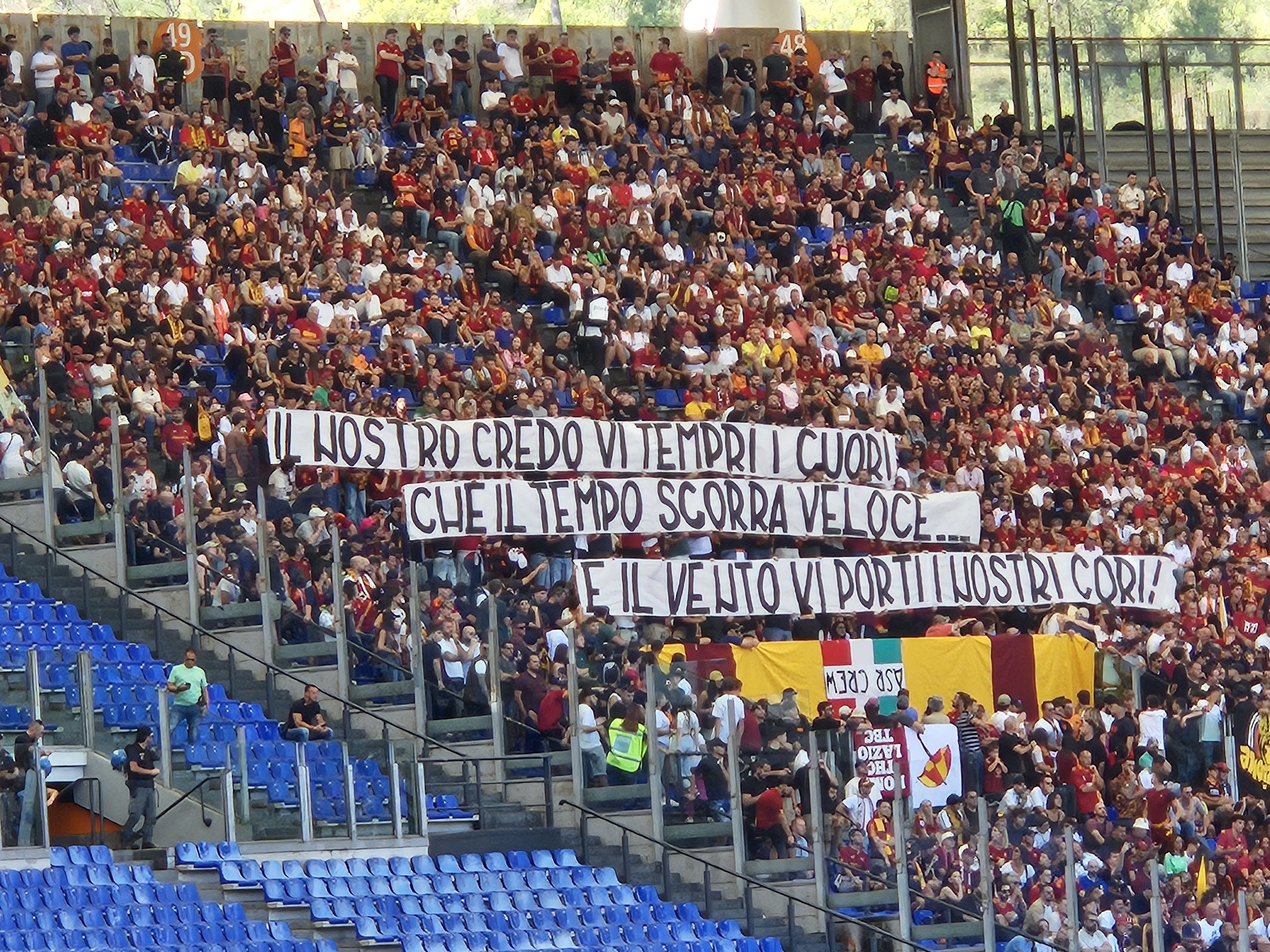 Tutta la parte più calda del tifo della Roma mostra solidarietà ai tredici tifosi arrestati a Nizza, e quindi in tutto lo Stadio Olimpico, dalla Curva Nord, alla Tribuna Tevere, alla Curva Sud gli striscioni sono girati al contrario e i primi 15 minuti si giocano nel silenzio. Poi vengono aperti nei tre settori citati degli striscioni di identico tenore e si inizia a tifare per la Roma. Così sarà per tutti i 90 minuti. Tifo in generale buono, lieve calo nel secondo tempo, finale in ripresa con dei cori azzeccati. Il tutto intervallato da "Liberate i nostri fratelli" e "Fuori gli ultras dalle galere", scandito all'unisono da tutti. |