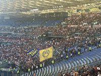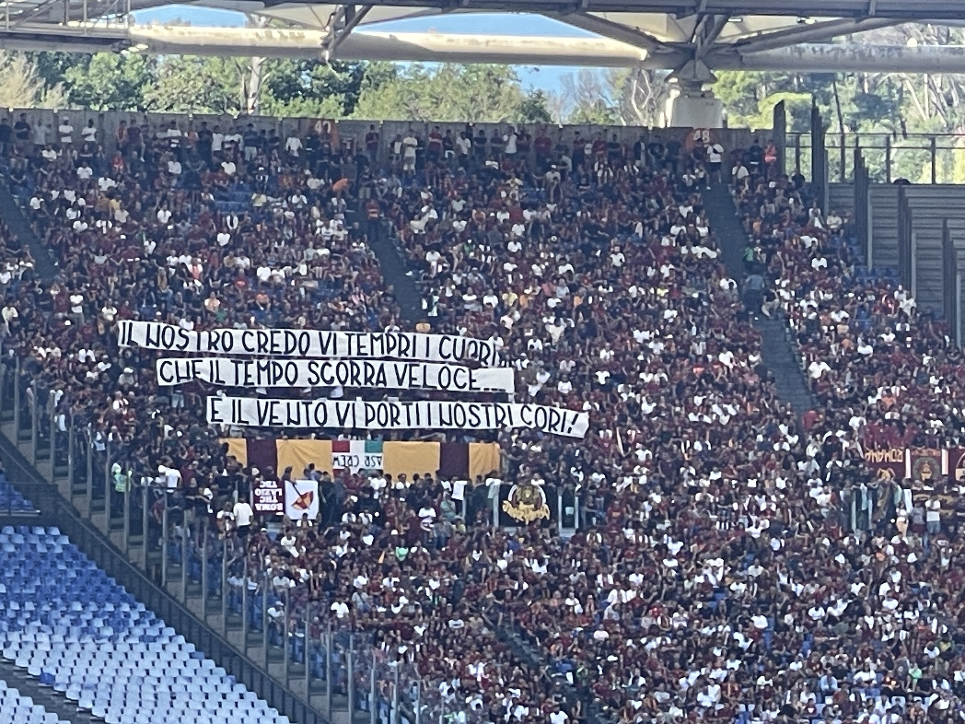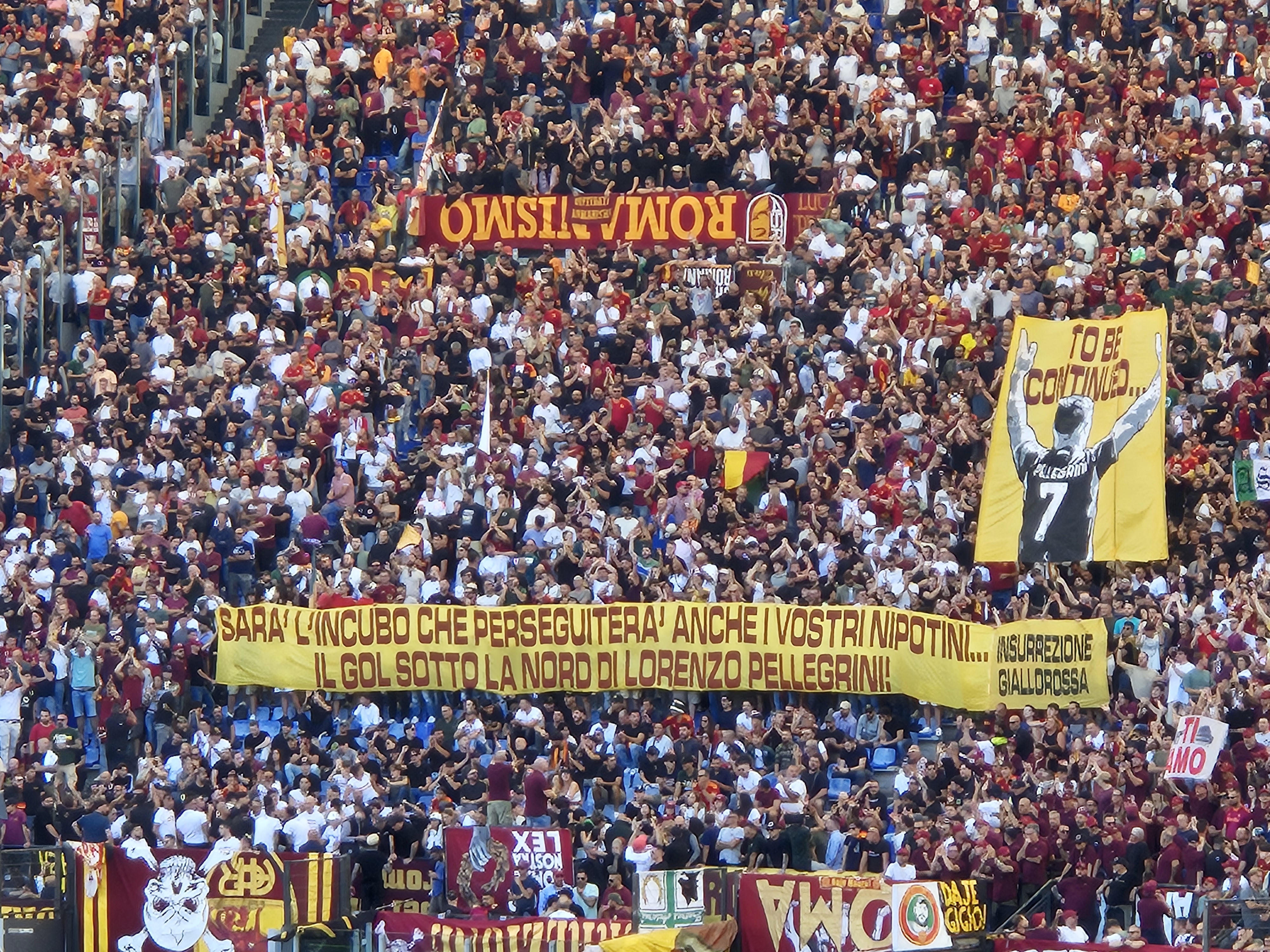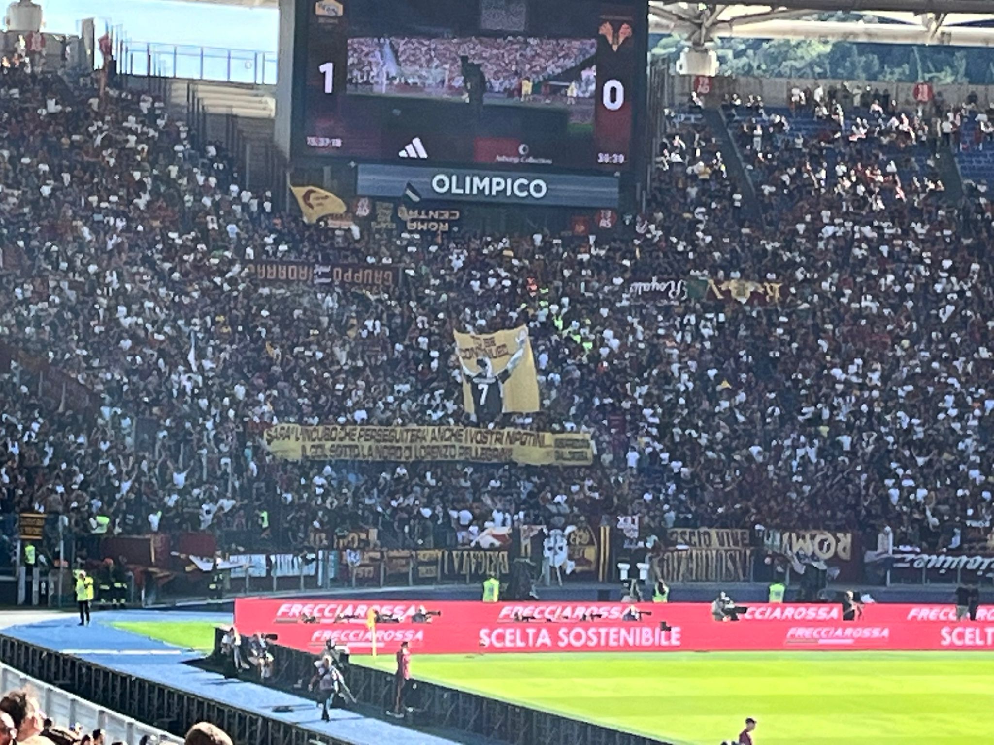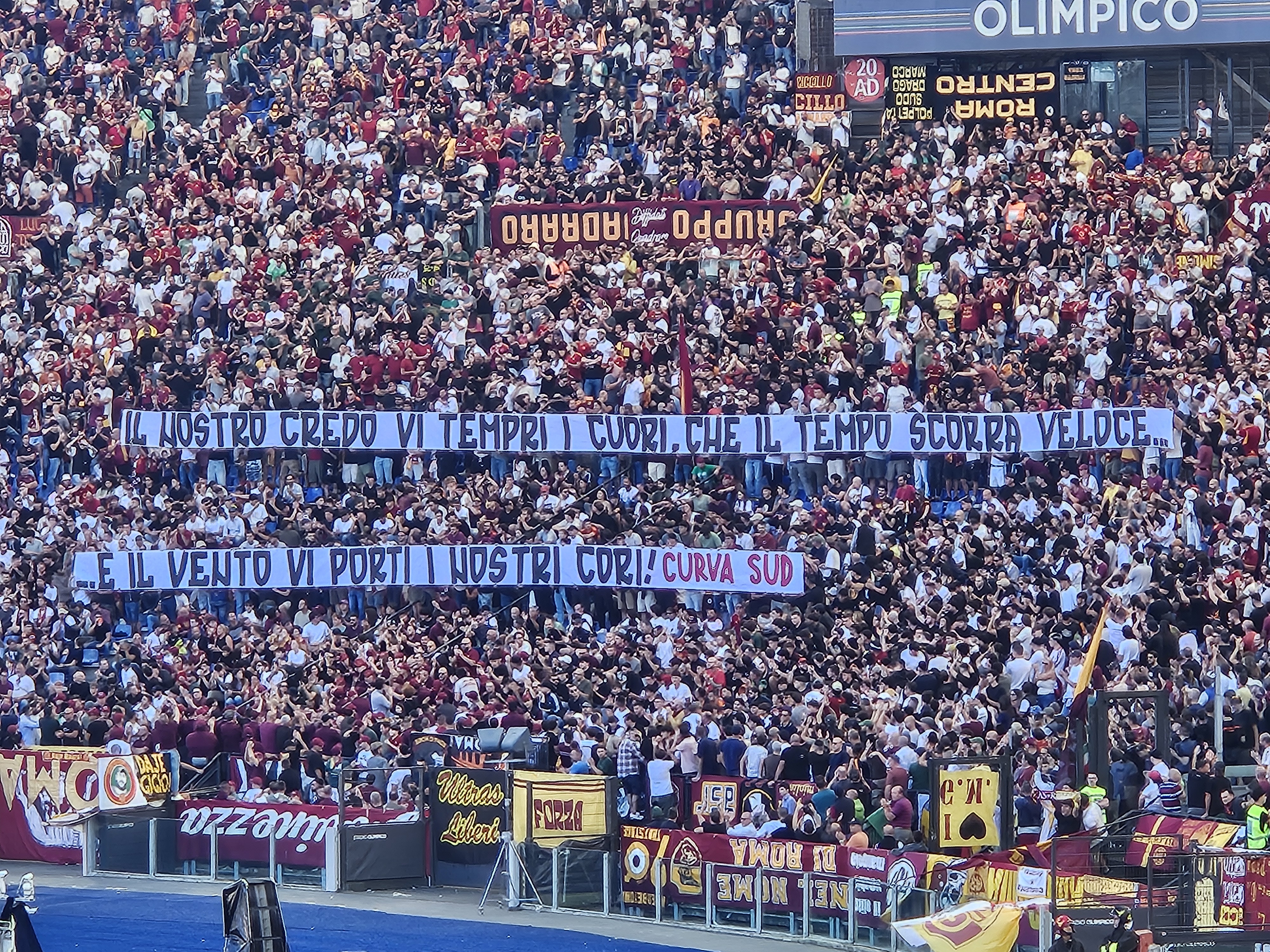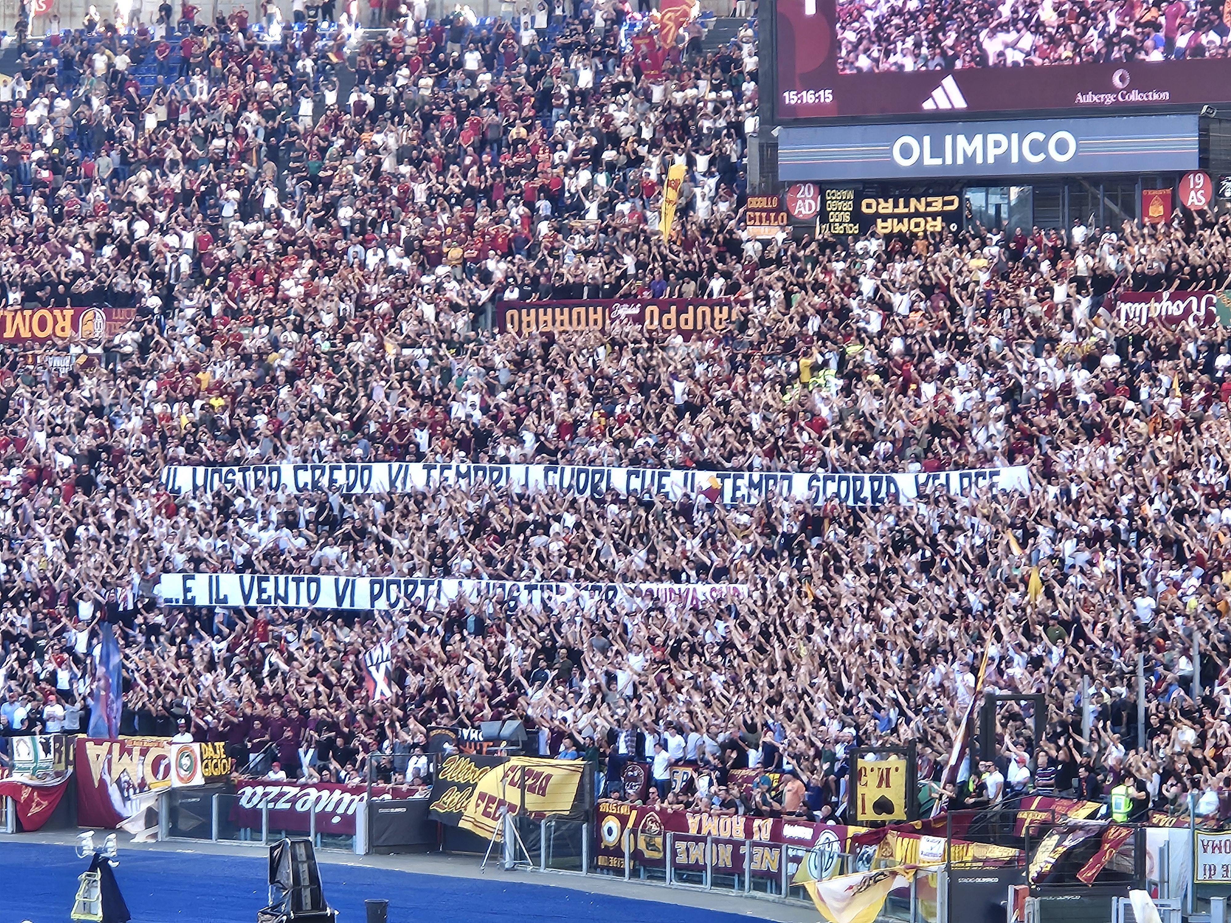 Tutta la parte più calda del tifo della Roma mostra solidarietà ai tredici tifosi arrestati a Nizza, e quindi in tutto lo Stadio Olimpico, dalla Curva Nord, alla Tribuna Tevere, alla Curva Sud gli striscioni sono girati al contrario e i primi 15 minuti si giocano nel silenzio. Poi vengono aperti nei tre settori citati degli striscioni di identico tenore e si inizia a tifare per la Roma. Così sarà per tutti i 90 minuti. Tifo in generale buono, lieve calo nel secondo tempo, finale in ripresa con dei cori azzeccati. Il tutto intervallato da "Liberate i nostri fratelli" e "Fuori gli ultras dalle galere", scandito all'unisono da tutti. |