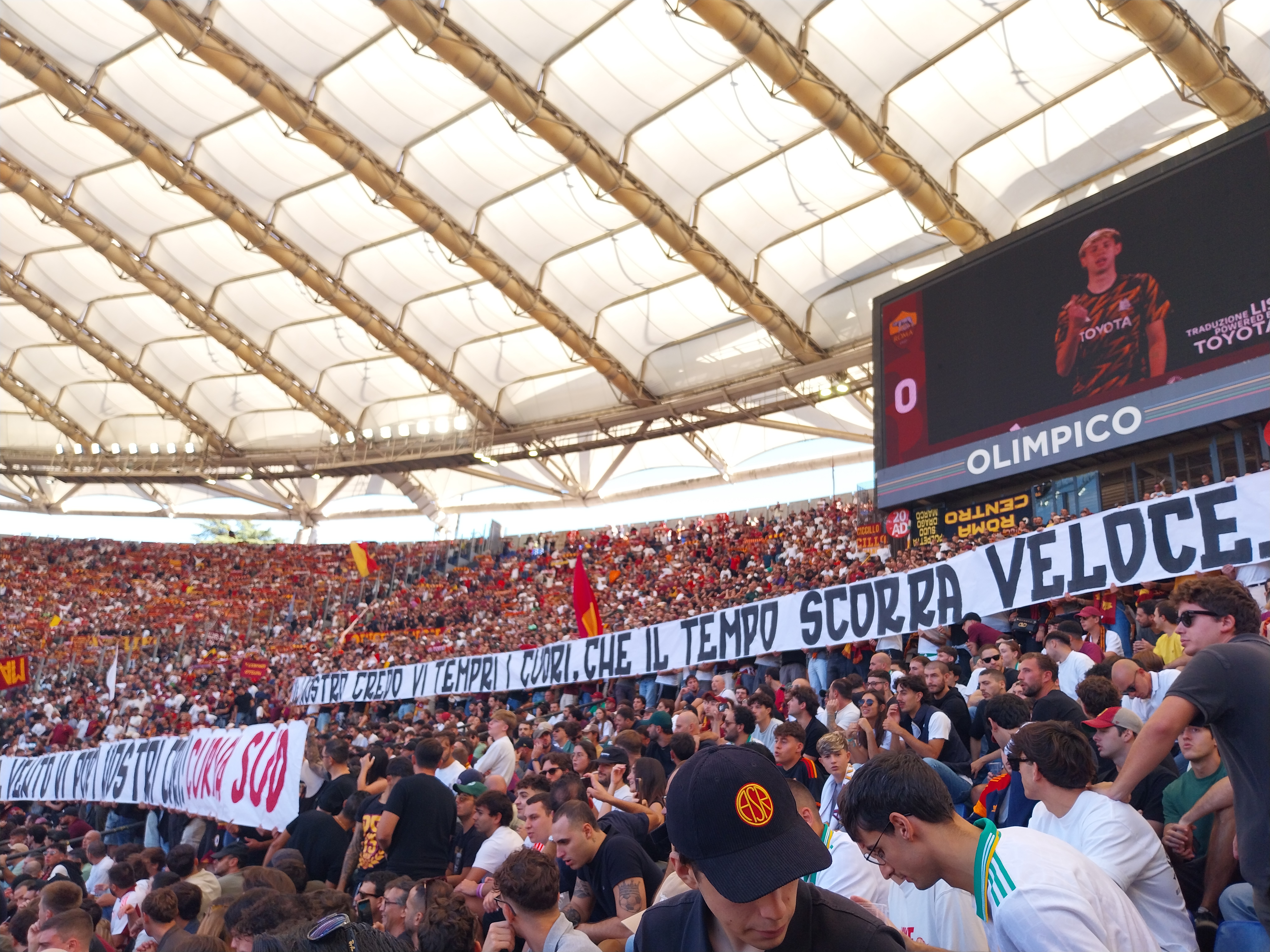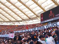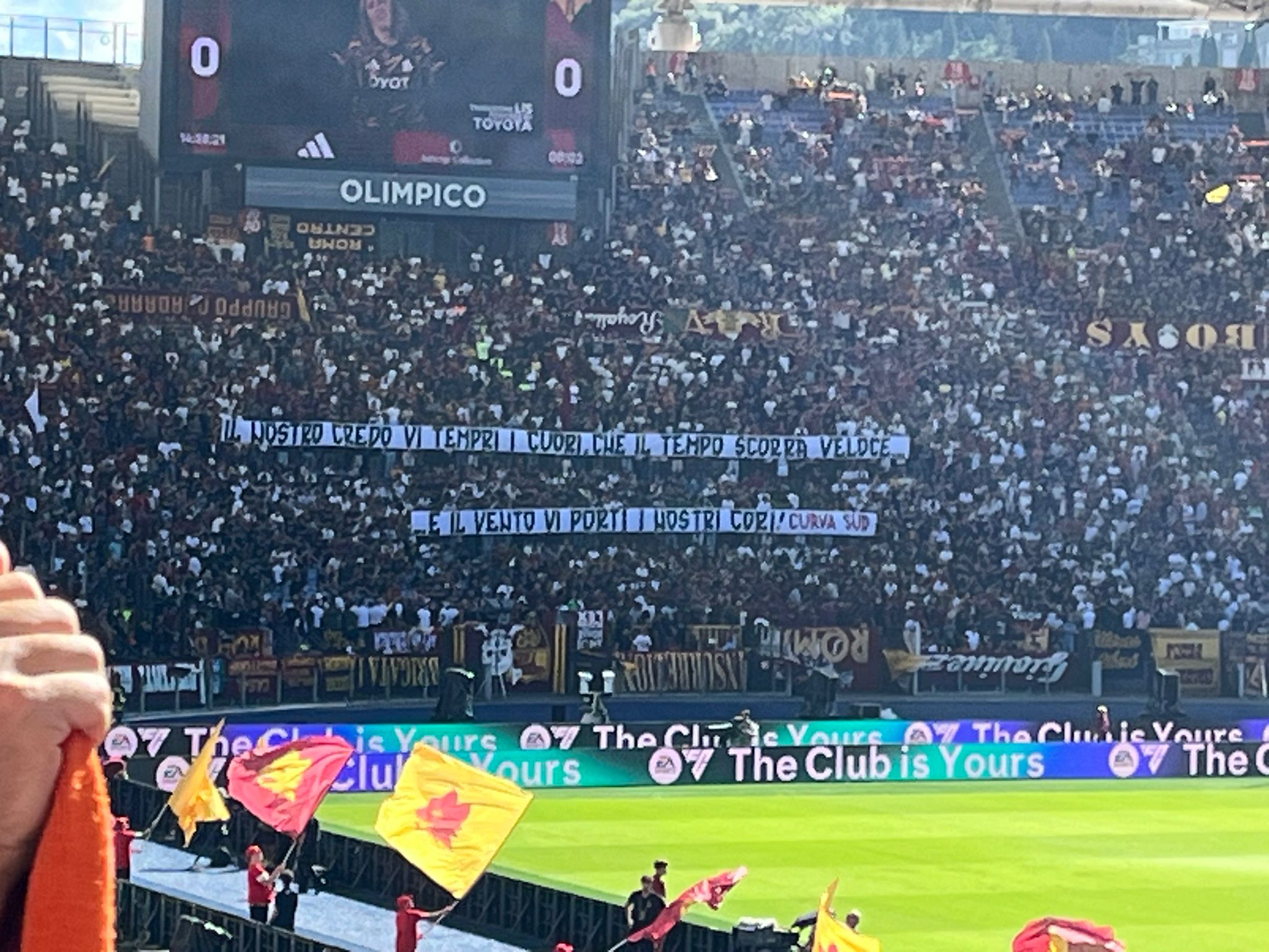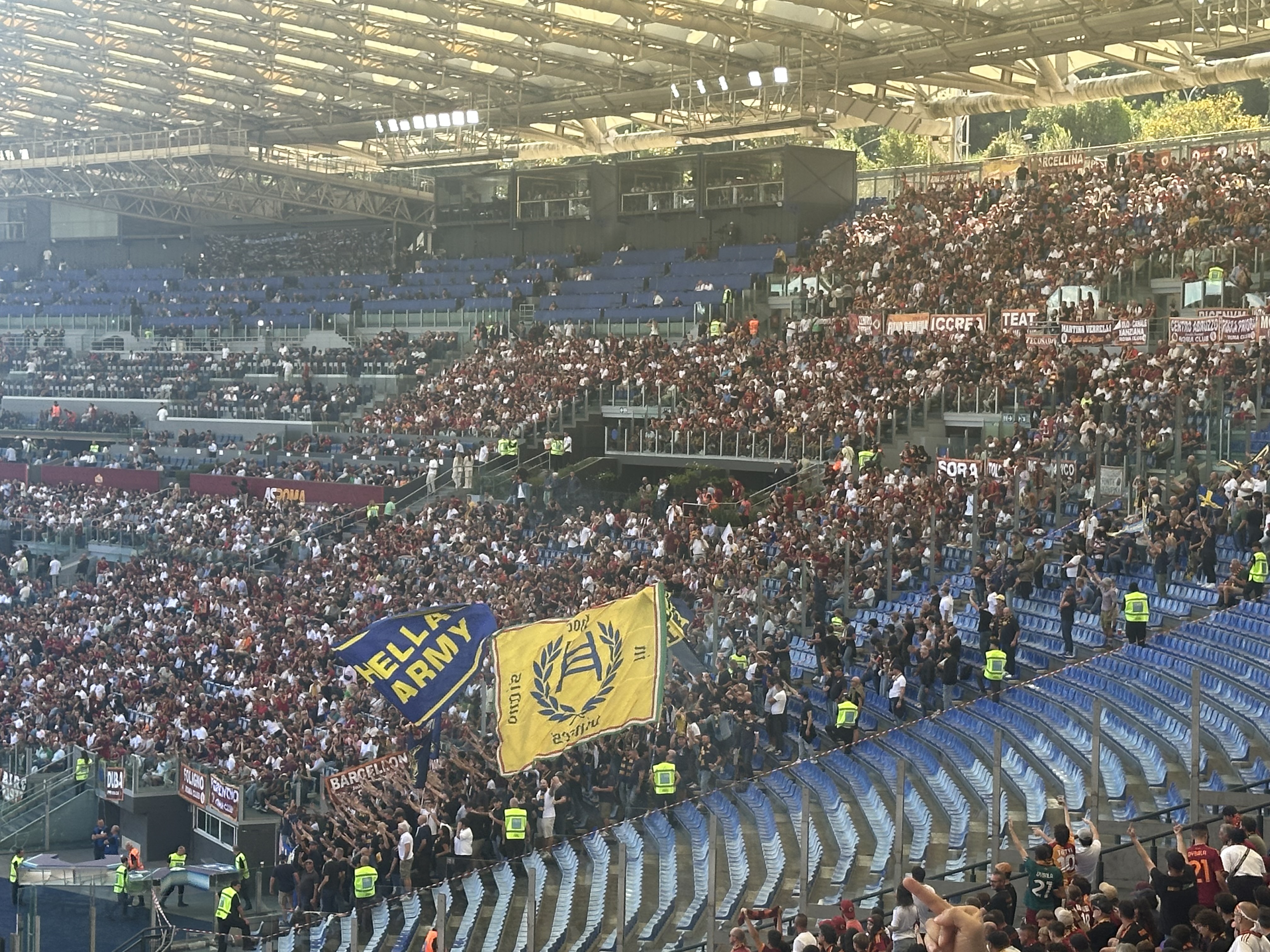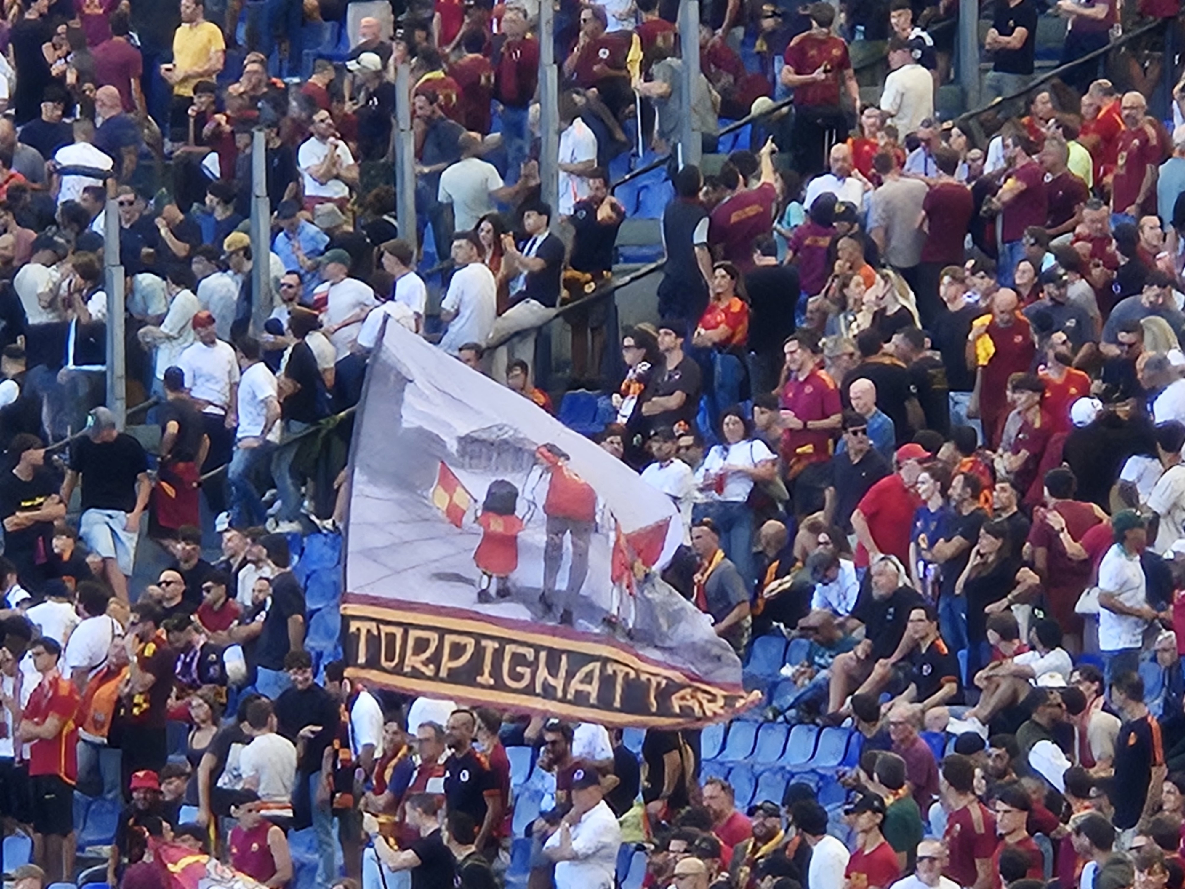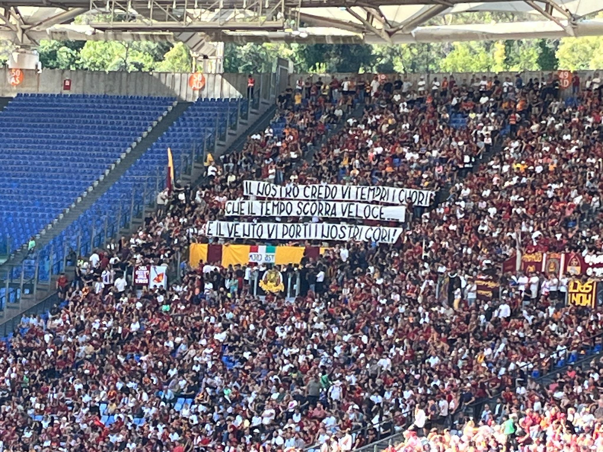 Tutta la parte più calda del tifo della Roma mostra solidarietà ai tredici tifosi arrestati a Nizza, e quindi in tutto lo Stadio Olimpico, dalla Curva Nord, alla Tribuna Tevere, alla Curva Sud gli striscioni sono girati al contrario e i primi 15 minuti si giocano nel silenzio. Poi vengono aperti nei tre settori citati degli striscioni di identico tenore e si inizia a tifare per la Roma. Così sarà per tutti i 90 minuti. Tifo in generale buono, lieve calo nel secondo tempo, finale in ripresa con dei cori azzeccati. Il tutto intervallato da "Liberate i nostri fratelli" e "Fuori gli ultras dalle galere", scandito all'unisono da tutti. |