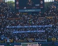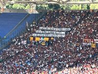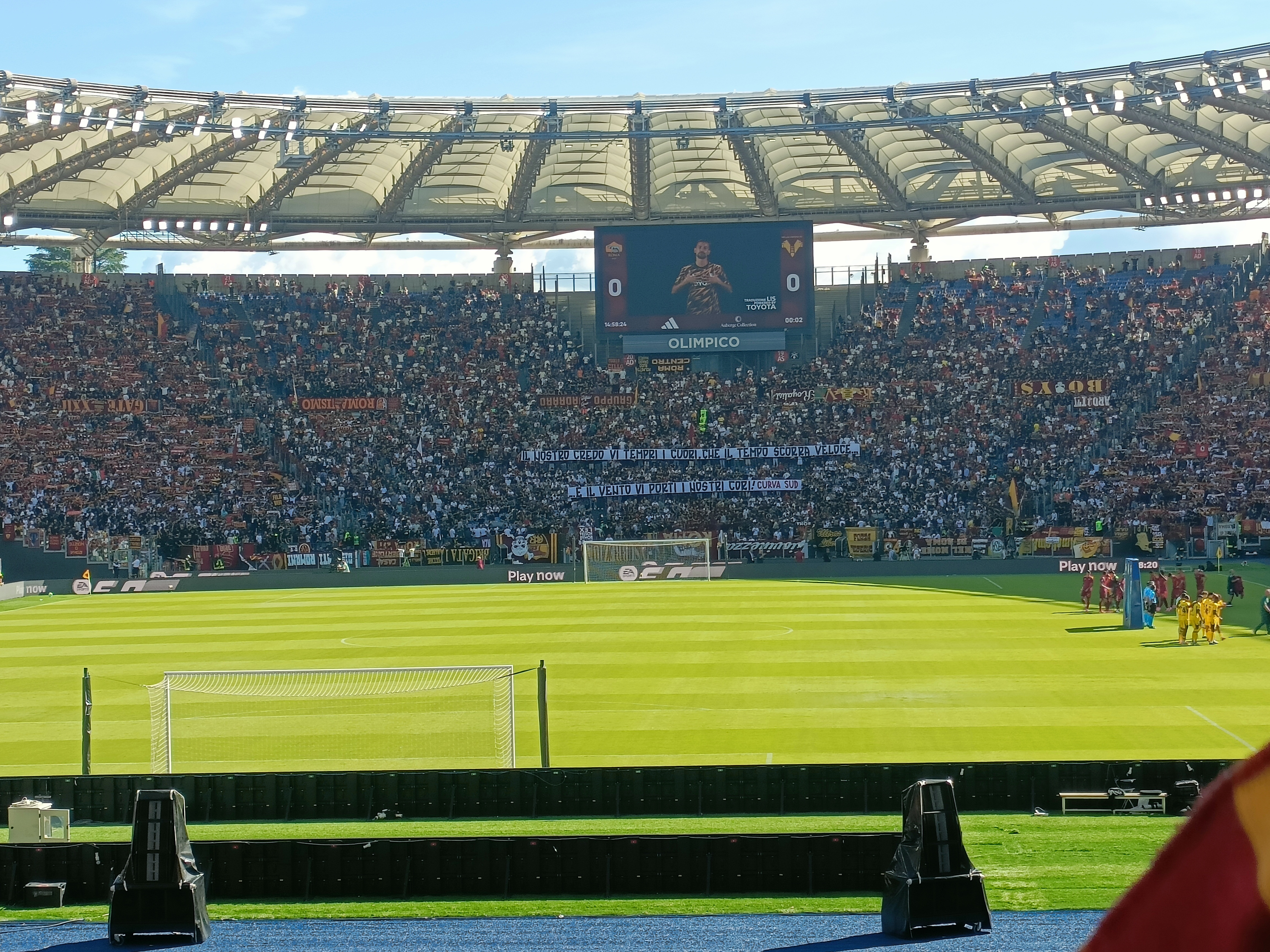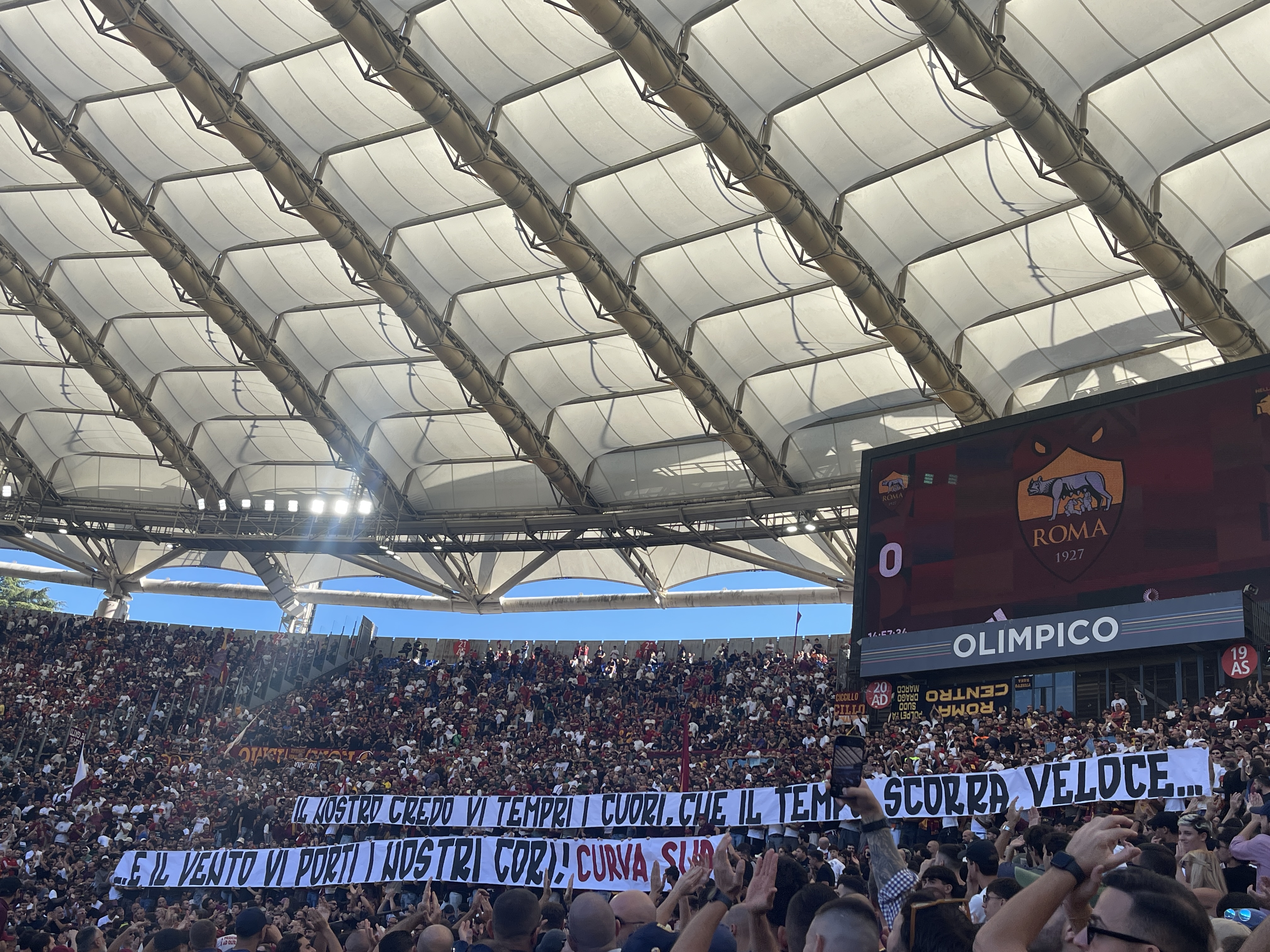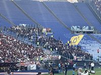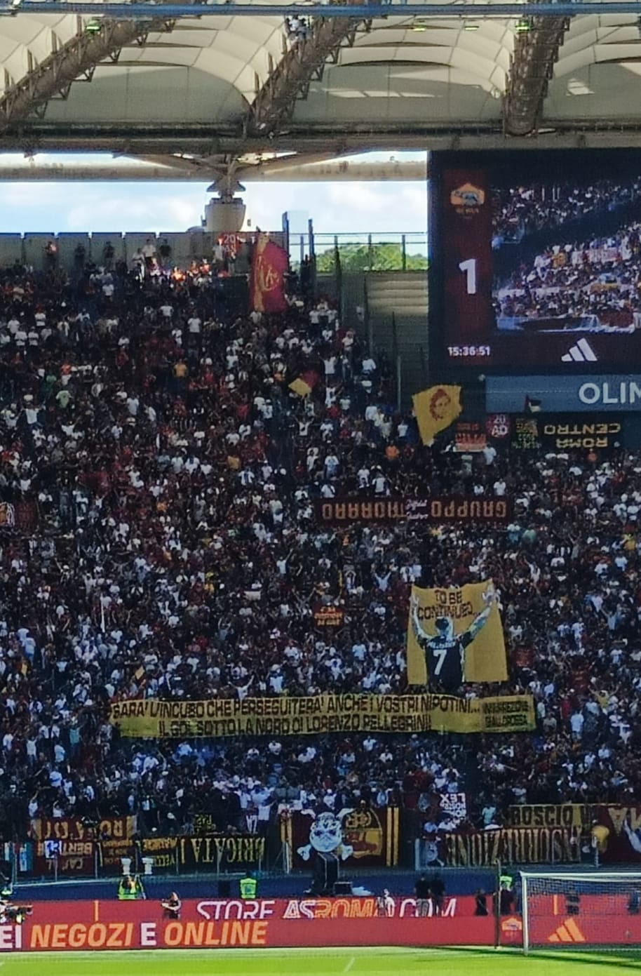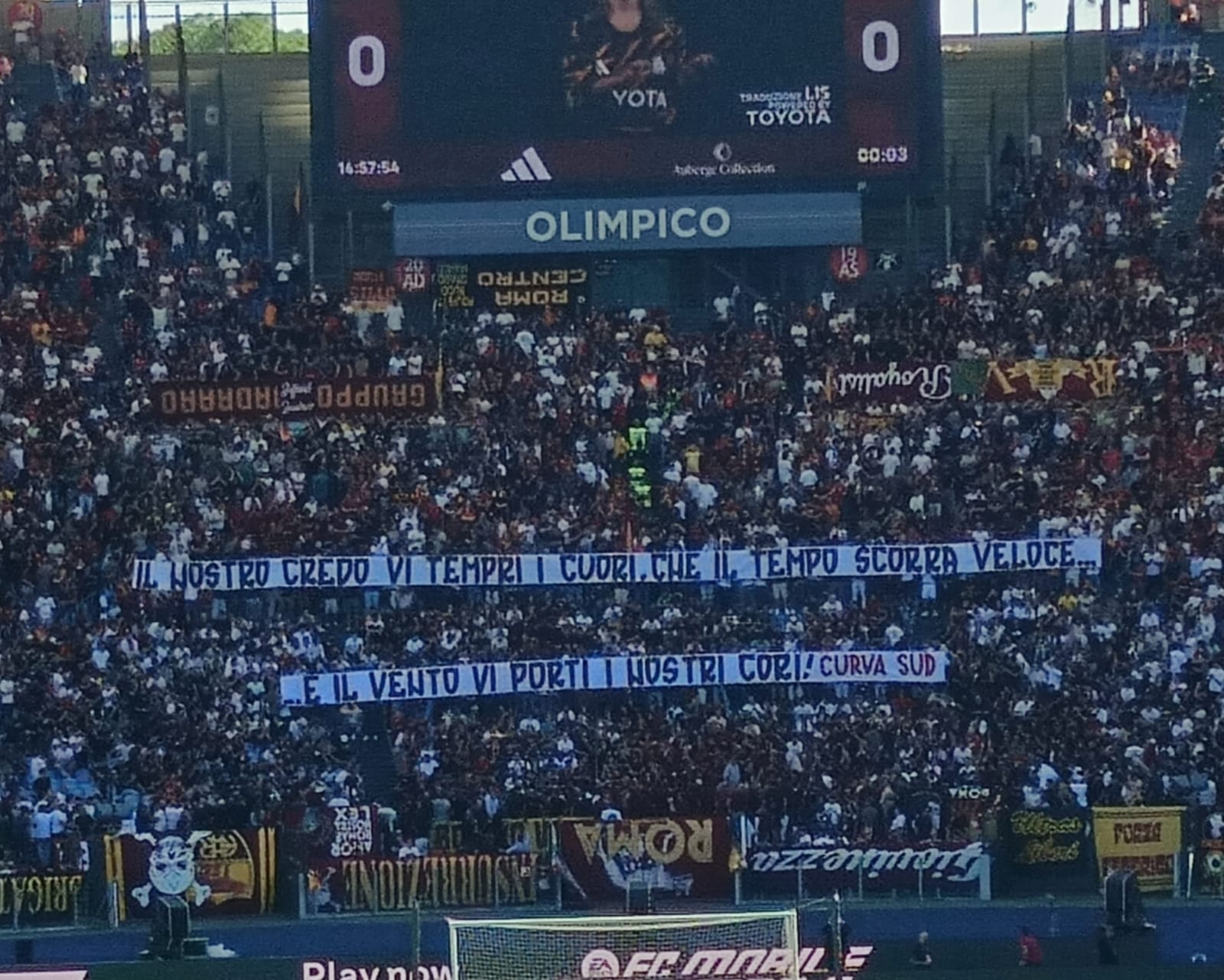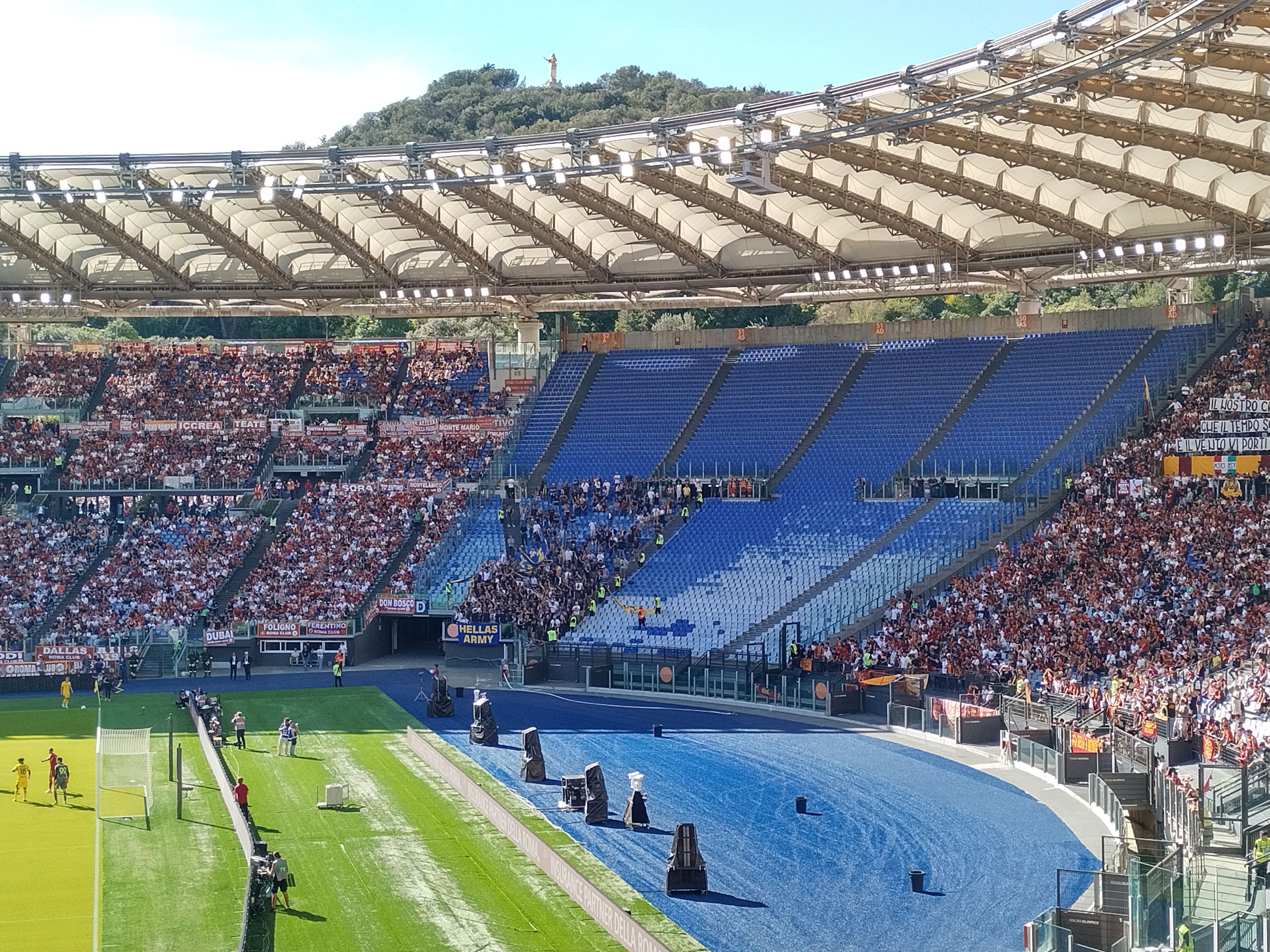 Tutta la parte più calda del tifo della Roma mostra solidarietà ai tredici tifosi arrestati a Nizza, e quindi in tutto lo Stadio Olimpico, dalla Curva Nord, alla Tribuna Tevere, alla Curva Sud gli striscioni sono girati al contrario e i primi 15 minuti si giocano nel silenzio. Poi vengono aperti nei tre settori citati degli striscioni di identico tenore e si inizia a tifare per la Roma. Così sarà per tutti i 90 minuti. Tifo in generale buono, lieve calo nel secondo tempo, finale in ripresa con dei cori azzeccati. Il tutto intervallato da "Liberate i nostri fratelli" e "Fuori gli ultras dalle galere", scandito all'unisono da tutti. |