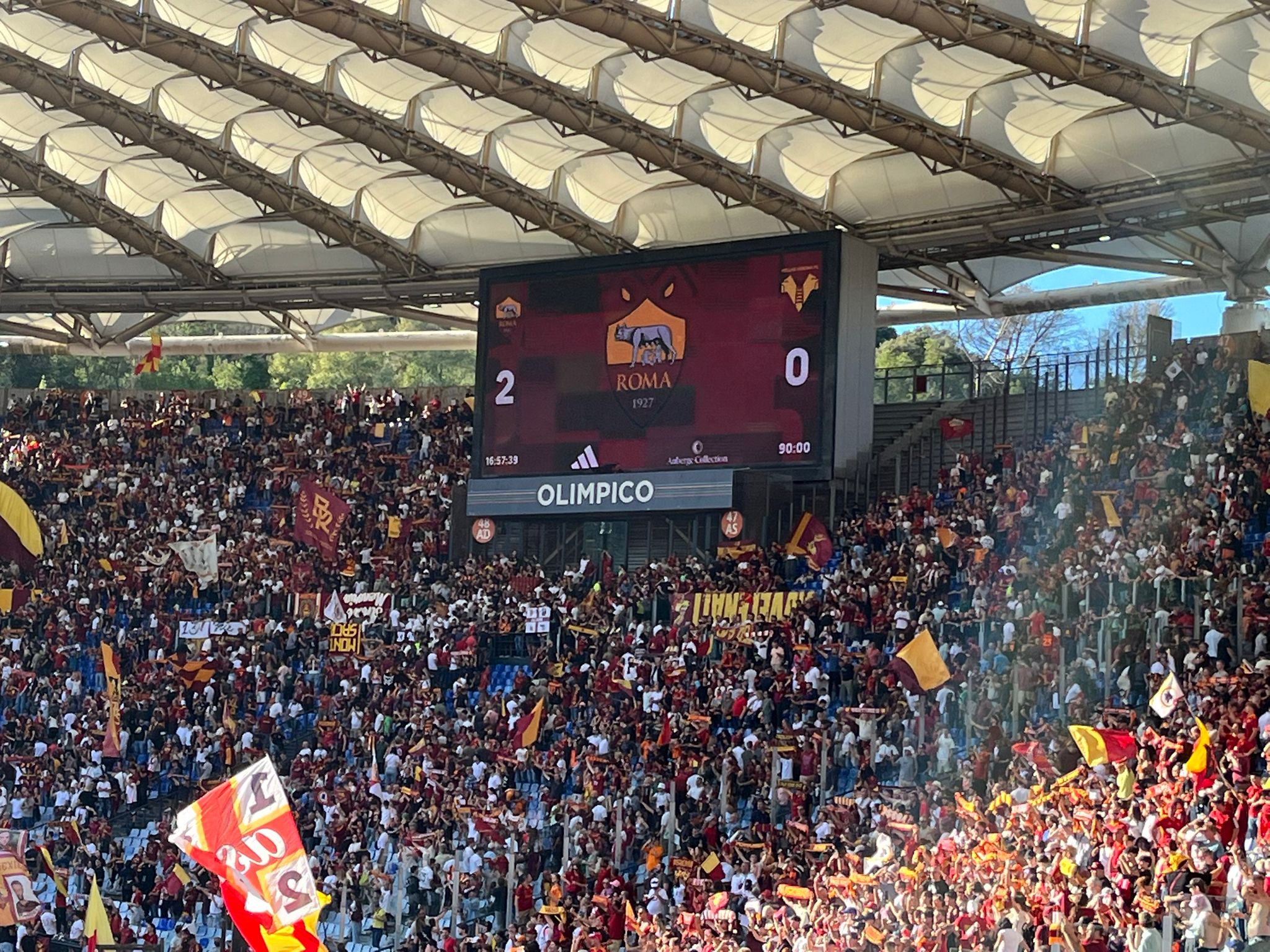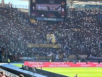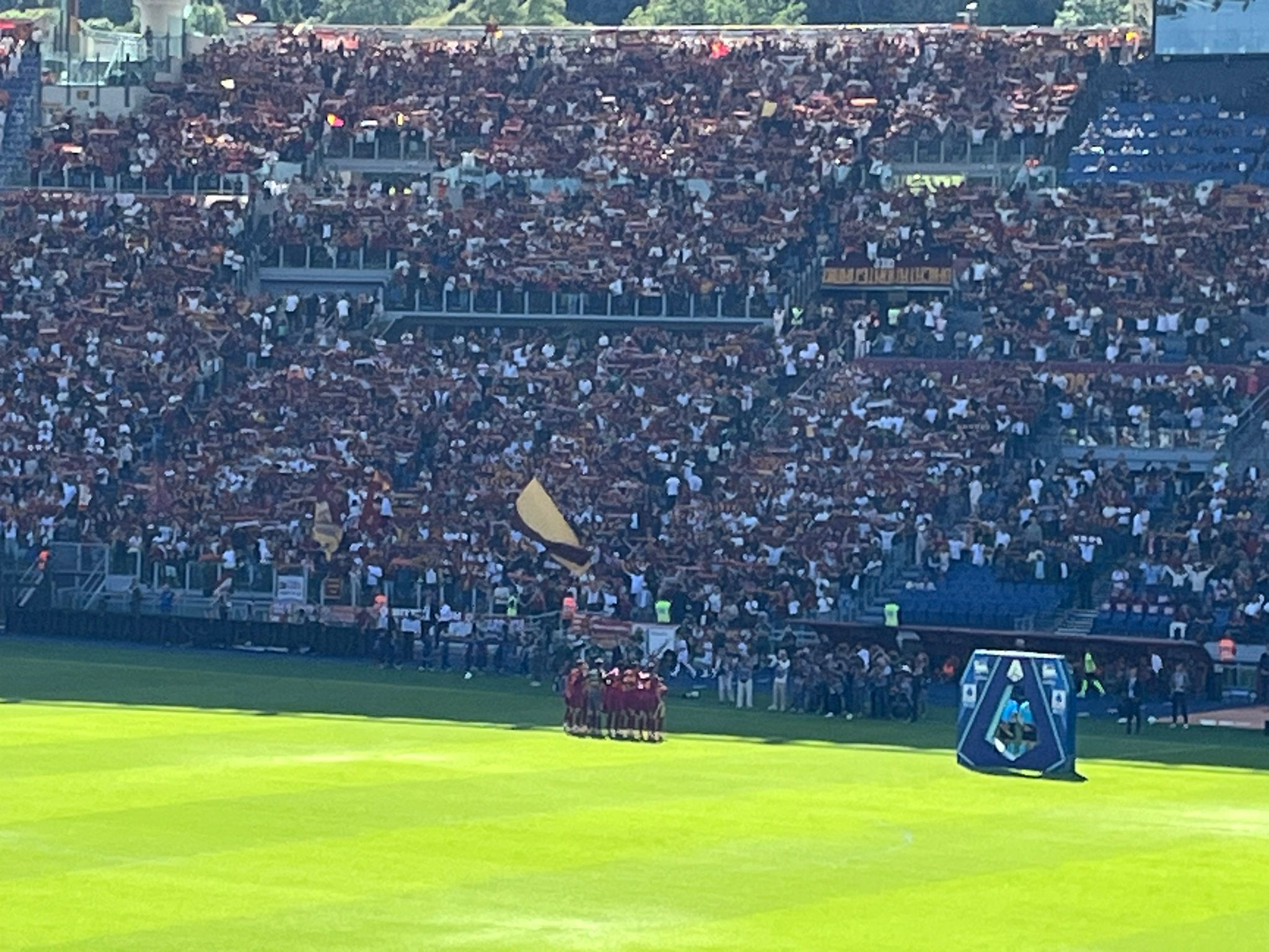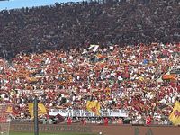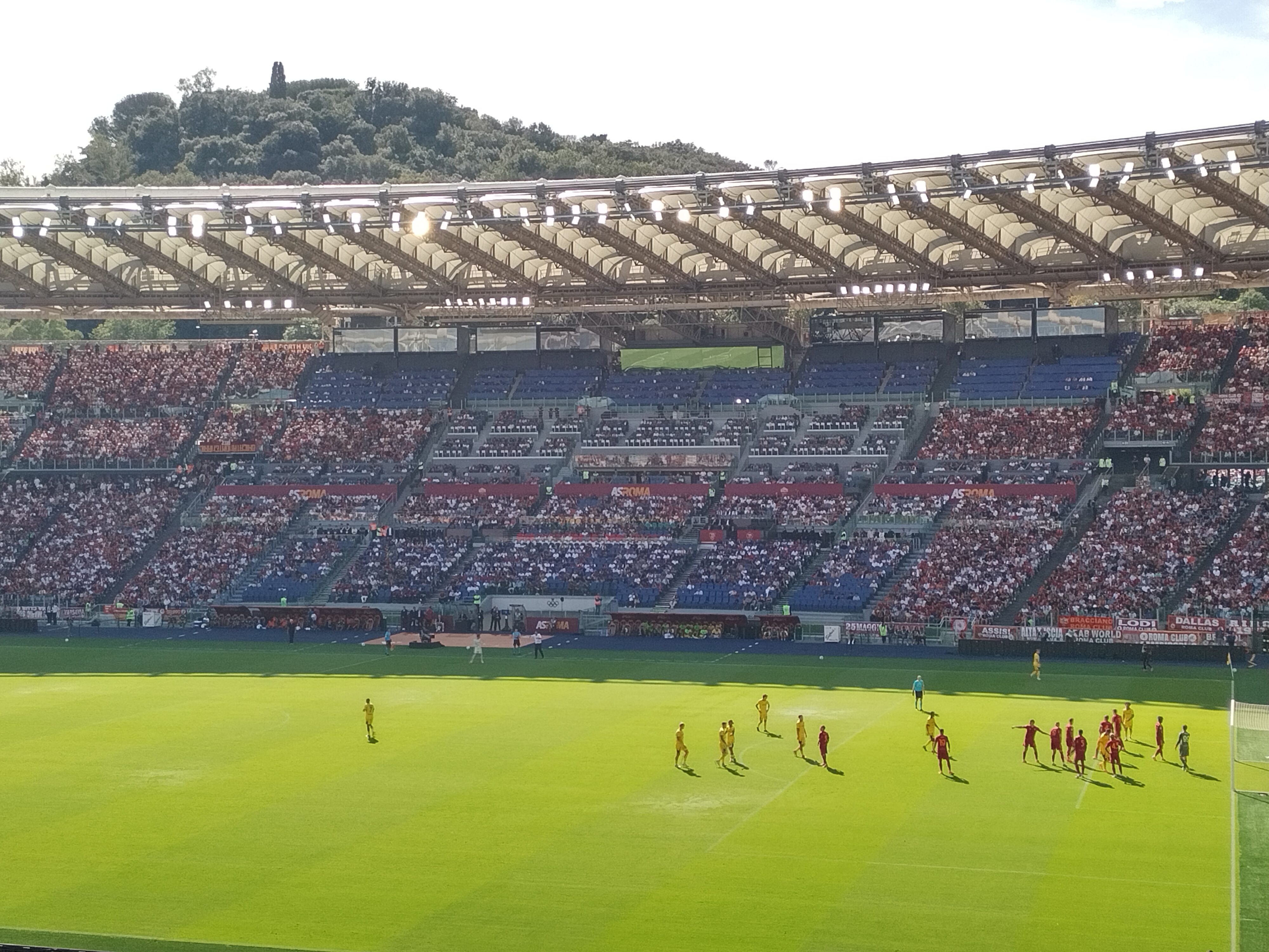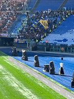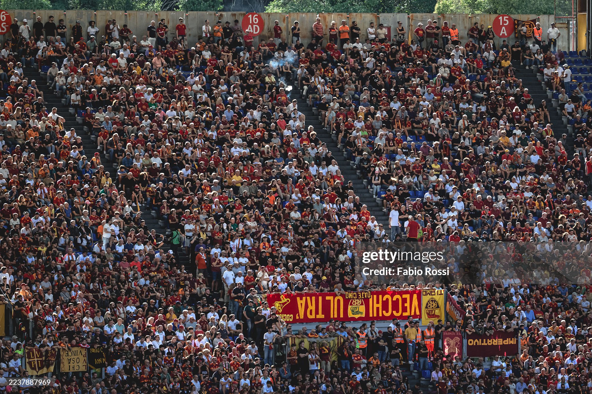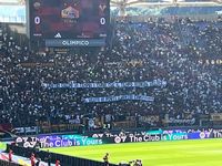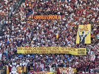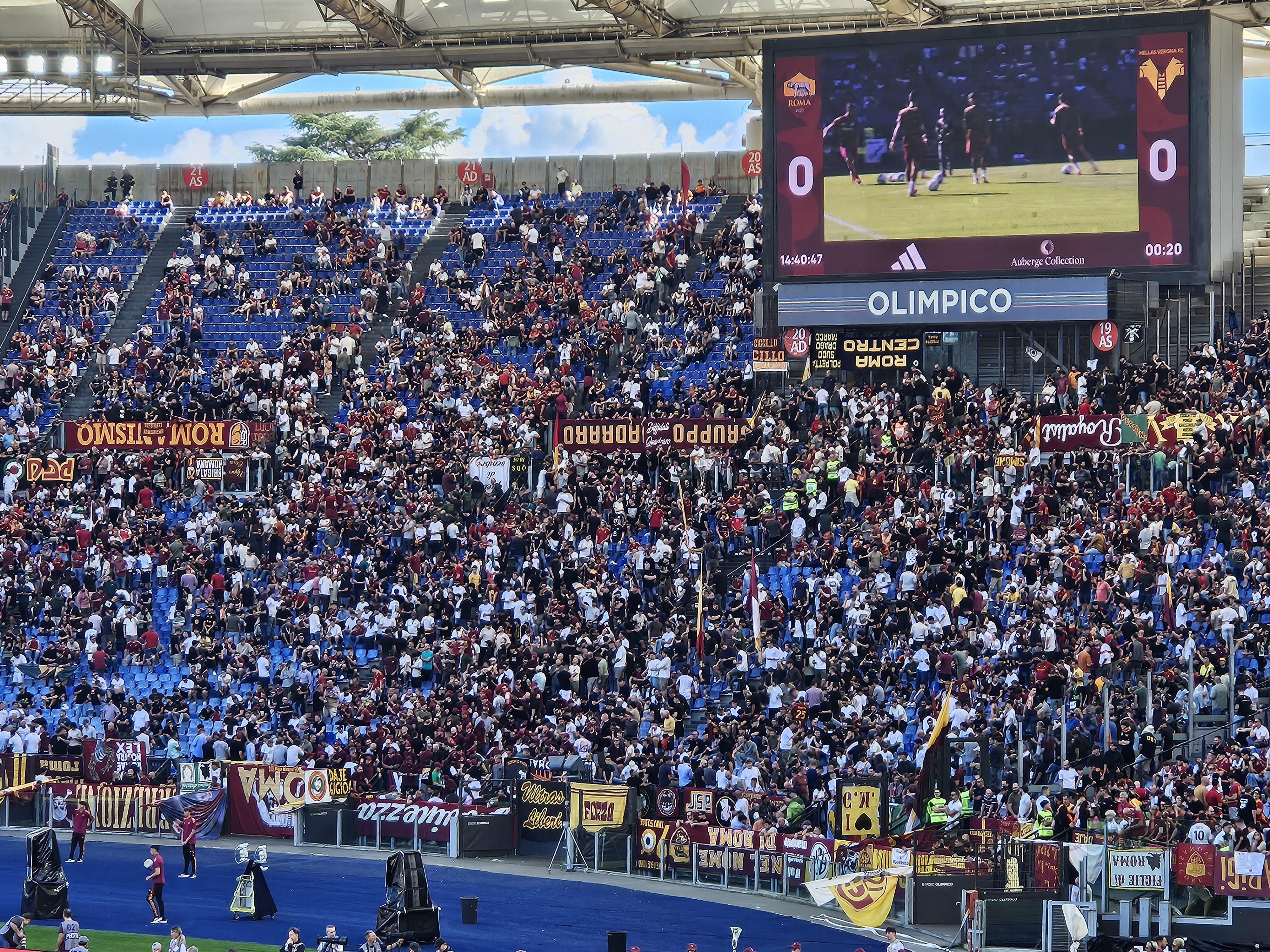Tutta la parte più calda del tifo della Roma mostra solidarietà ai tredici tifosi arrestati a Nizza, e quindi in tutto lo Stadio Olimpico, dalla Curva Nord, alla Tribuna Tevere, alla Curva Sud gli striscioni sono girati al contrario e i primi 15 minuti si giocano nel silenzio. Poi vengono aperti nei tre settori citati degli striscioni di identico tenore e si inizia a tifare per la Roma. Così sarà per tutti i 90 minuti. Tifo in generale buono, lieve calo nel secondo tempo, finale in ripresa con dei cori azzeccati. Il tutto intervallato da "Liberate i nostri fratelli" e "Fuori gli ultras dalle galere", scandito all'unisono da tutti. |