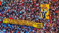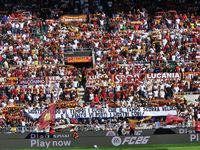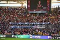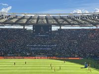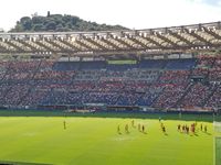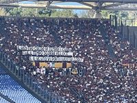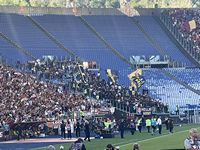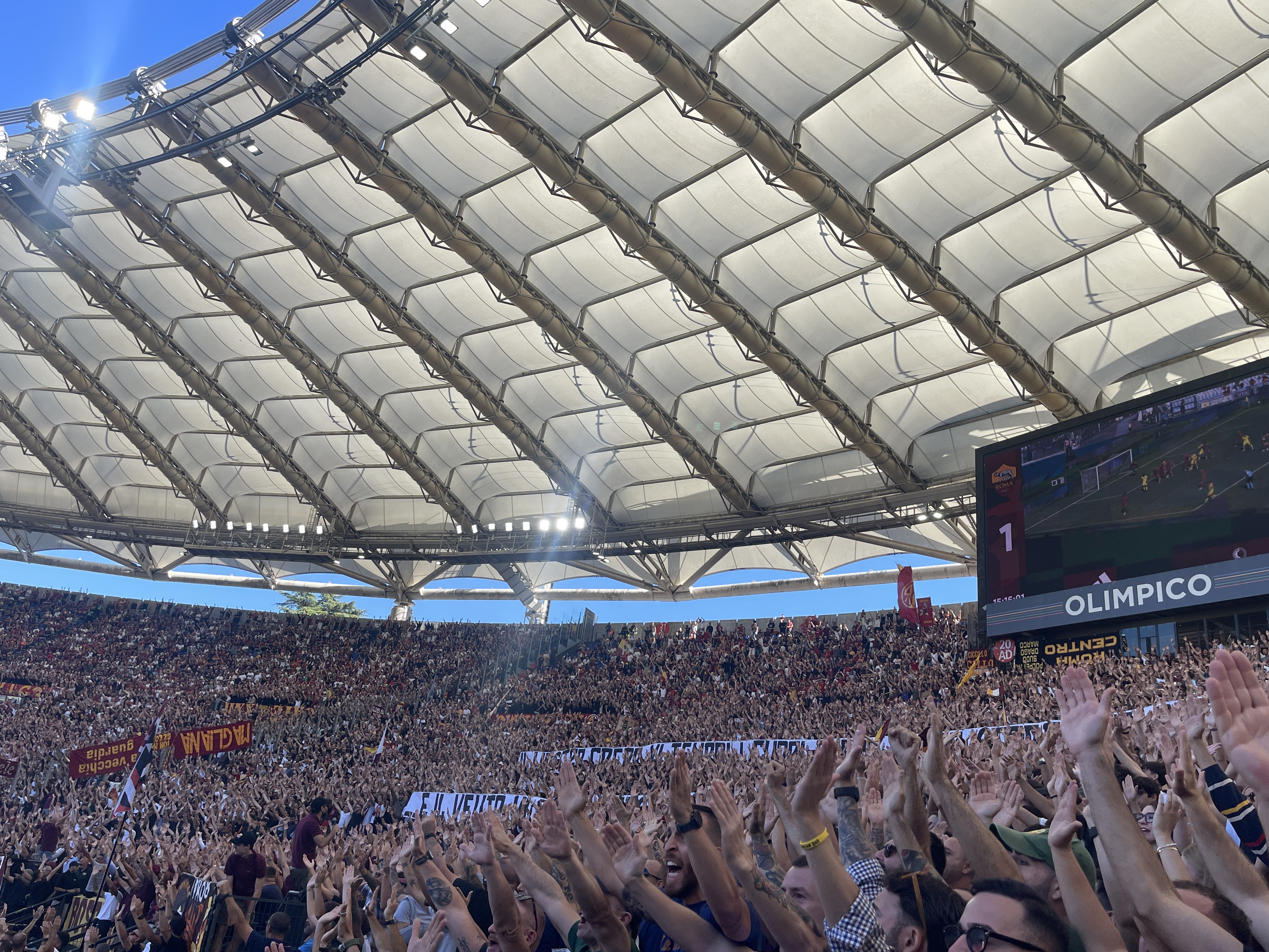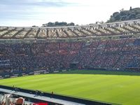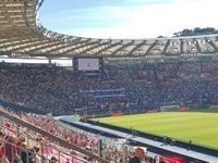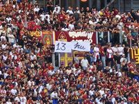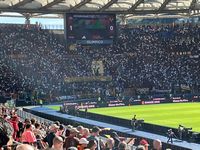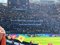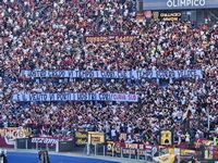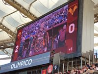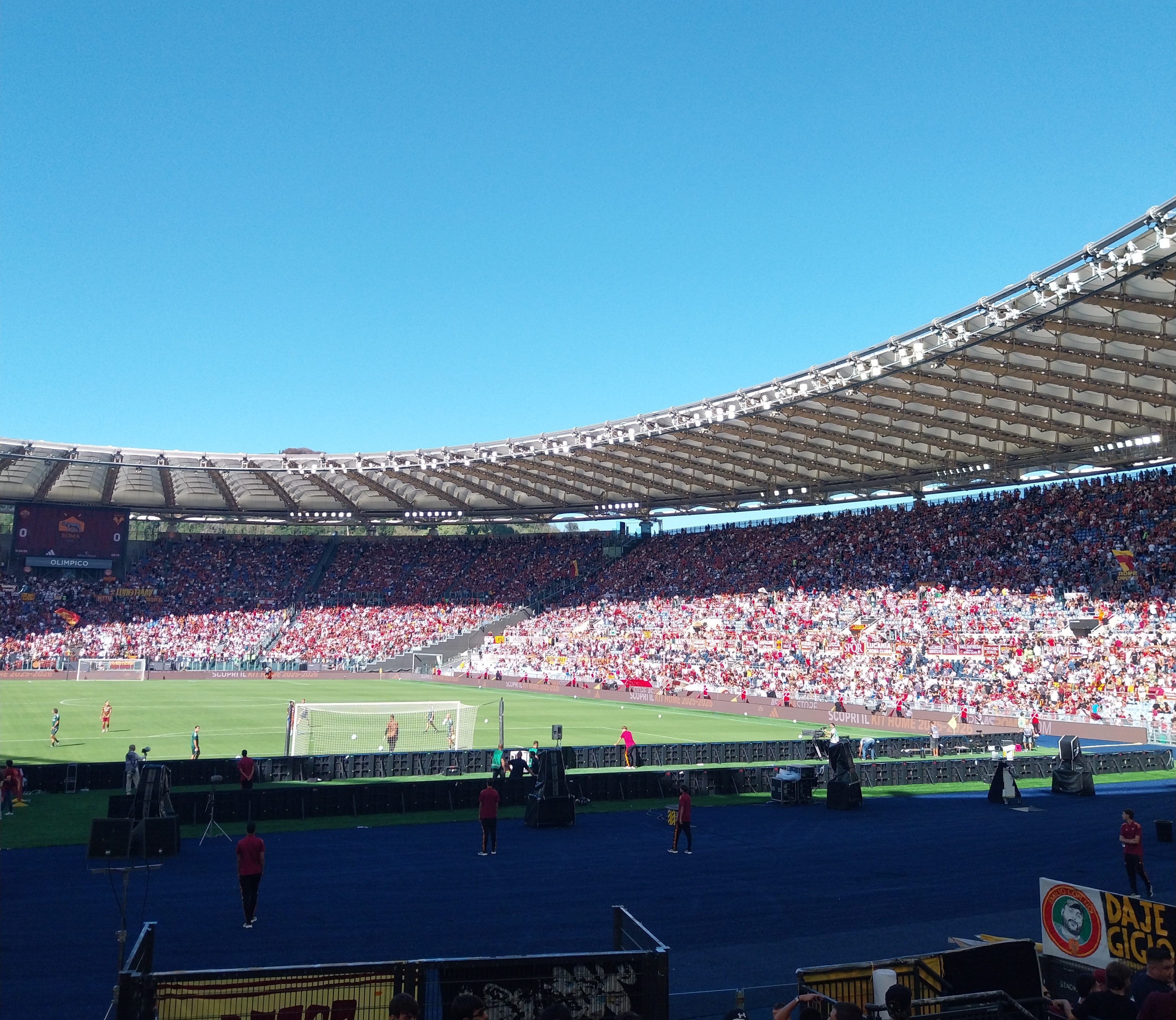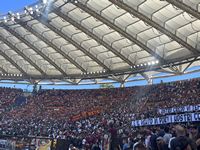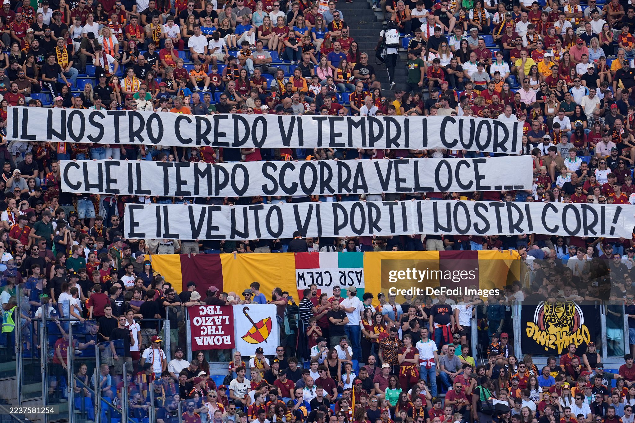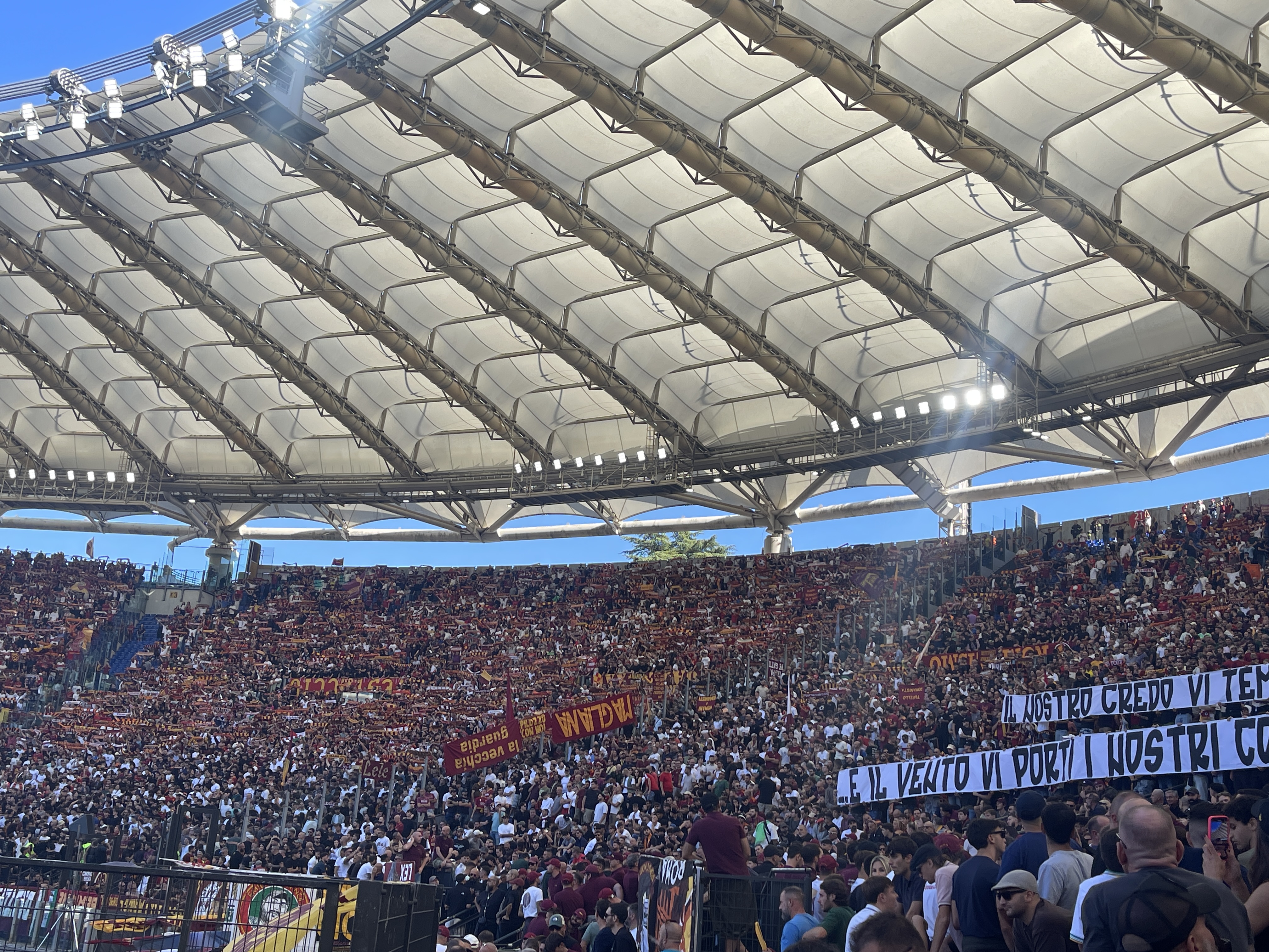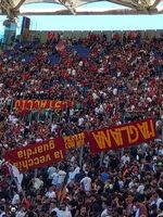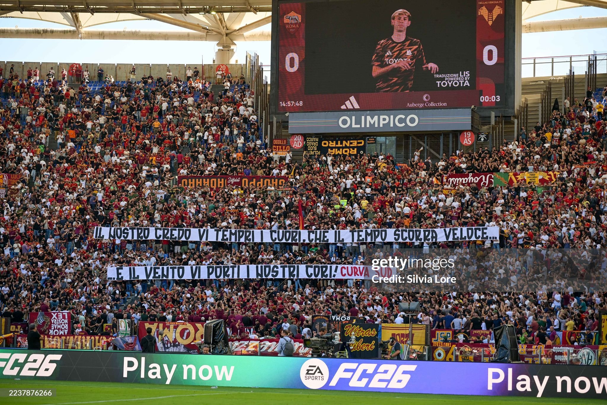 Tutta la parte più calda del tifo della Roma mostra solidarietà ai tredici tifosi arrestati a Nizza, e quindi in tutto lo Stadio Olimpico, dalla Curva Nord, alla Tribuna Tevere, alla Curva Sud gli striscioni sono girati al contrario e i primi 15 minuti si giocano nel silenzio. Poi vengono aperti nei tre settori citati degli striscioni di identico tenore e si inizia a tifare per la Roma. Così sarà per tutti i 90 minuti. Tifo in generale buono, lieve calo nel secondo tempo, finale in ripresa con dei cori azzeccati. Il tutto intervallato da "Liberate i nostri fratelli" e "Fuori gli ultras dalle galere", scandito all'unisono da tutti. |