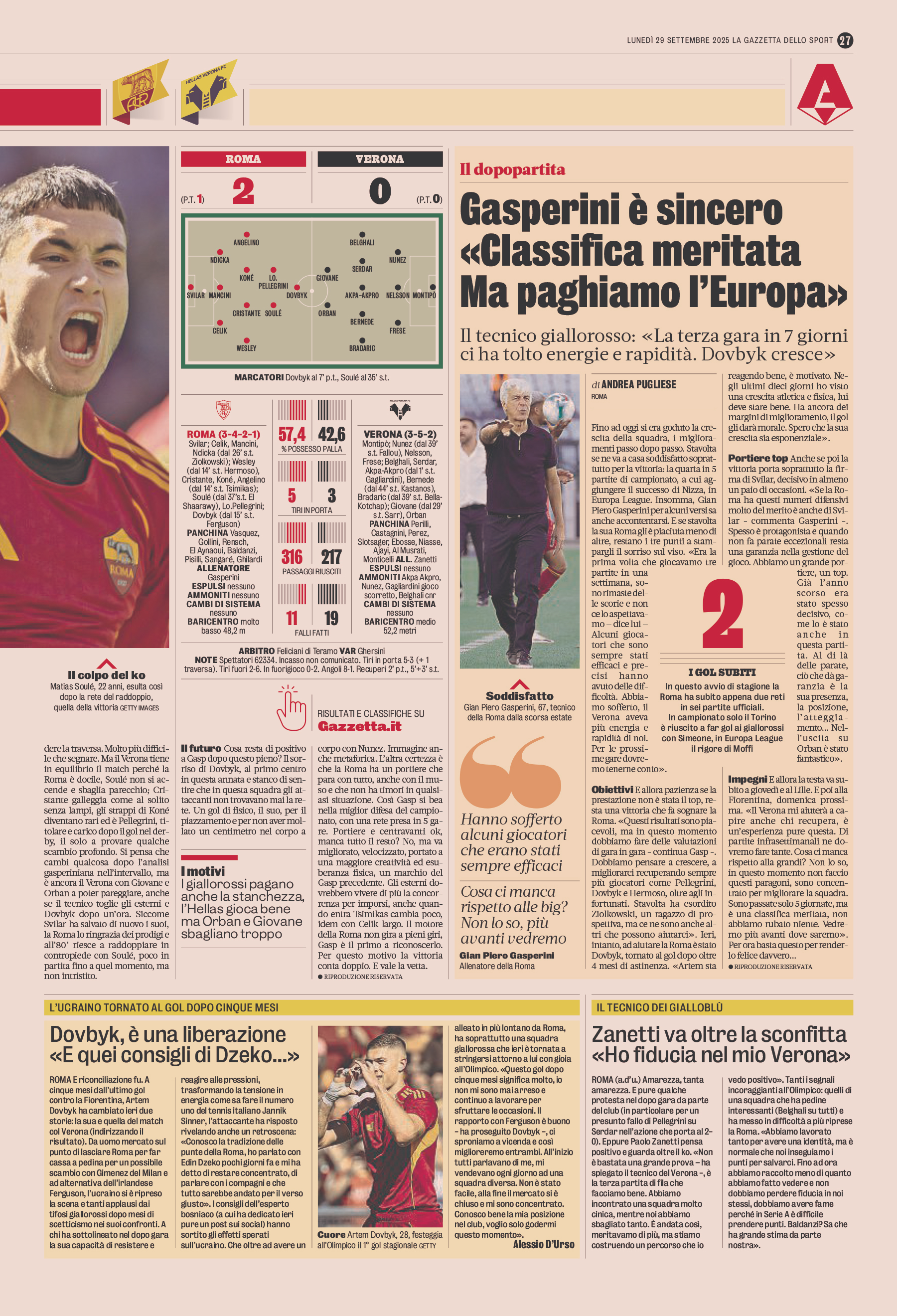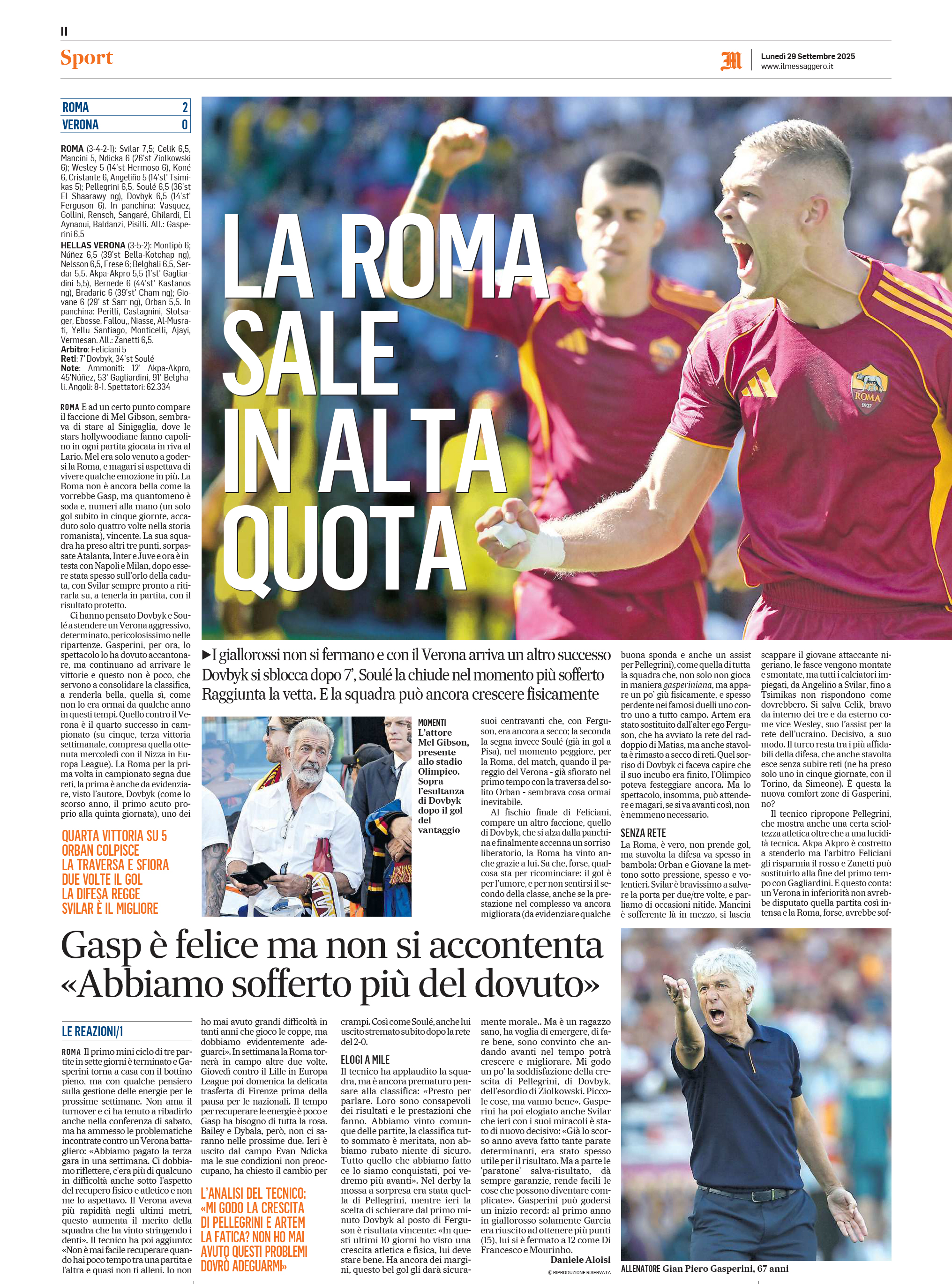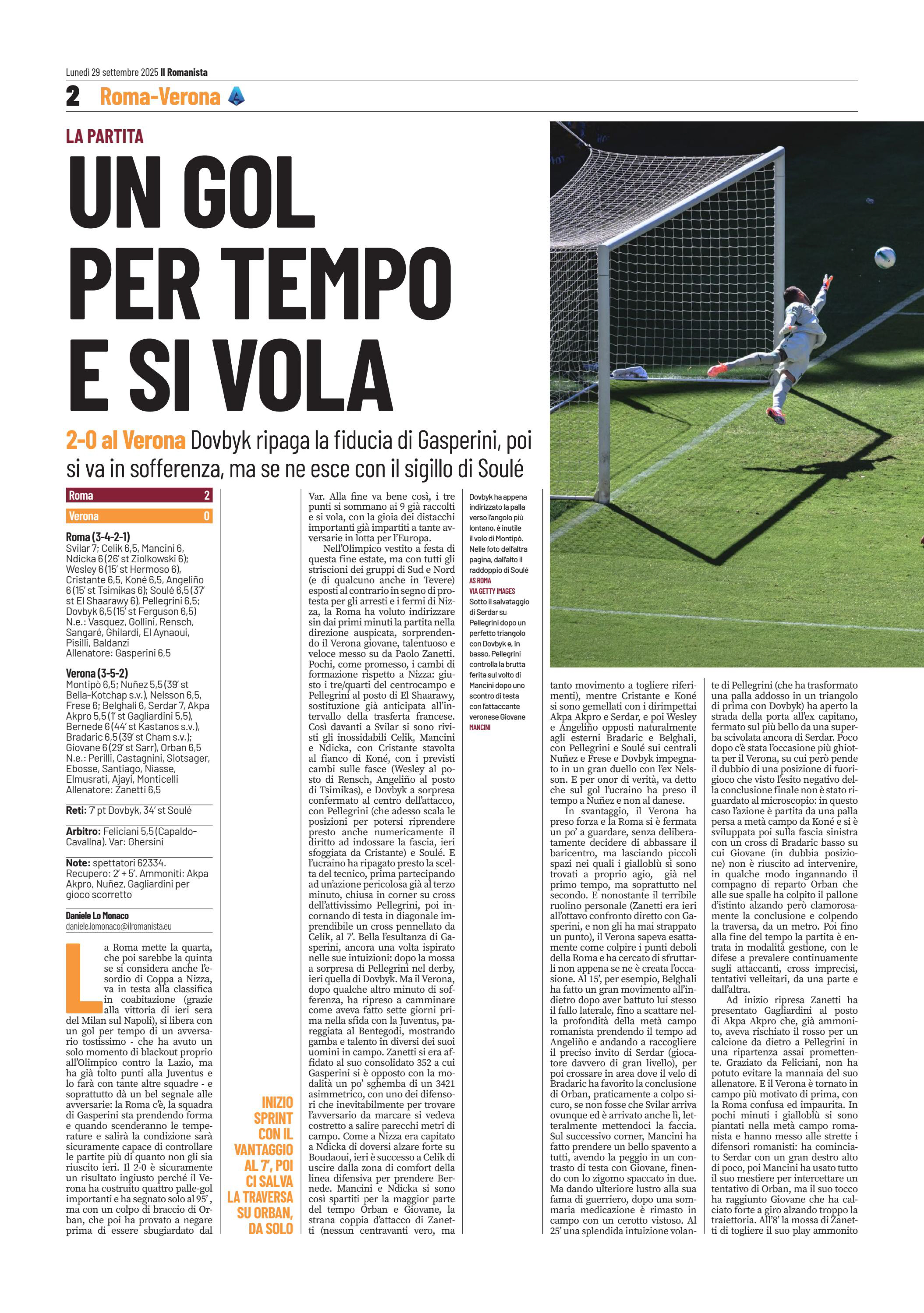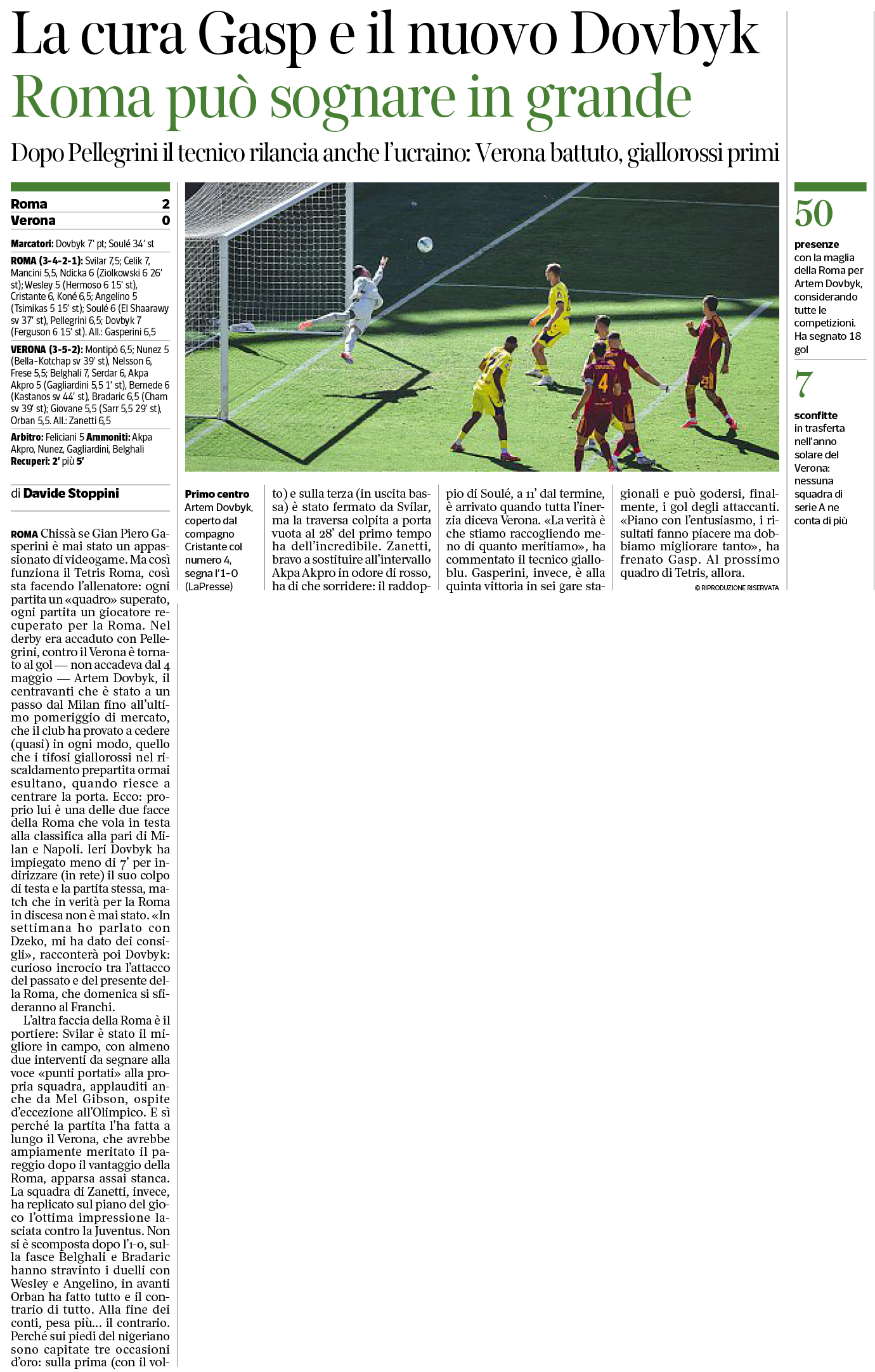 Roma (3-4-2-1): Svilar; Celik, Mancini, N'Dicka (26' st Ziolkowski); Wesley (14' st Hermoso), Koné, Cristante, Angelino (14' st Tsimikas); Soulé (37' st El Shaarawy), Pellegrini; Dovbyk (14' st Ferguson). A disposizione: Vasquez, Gollini, Rensch, El Aynaoui, Baldanzi, Pisilli, Sangaré, Ghilardi. All.: Gasperini Hellas Verona (3-5-2):
