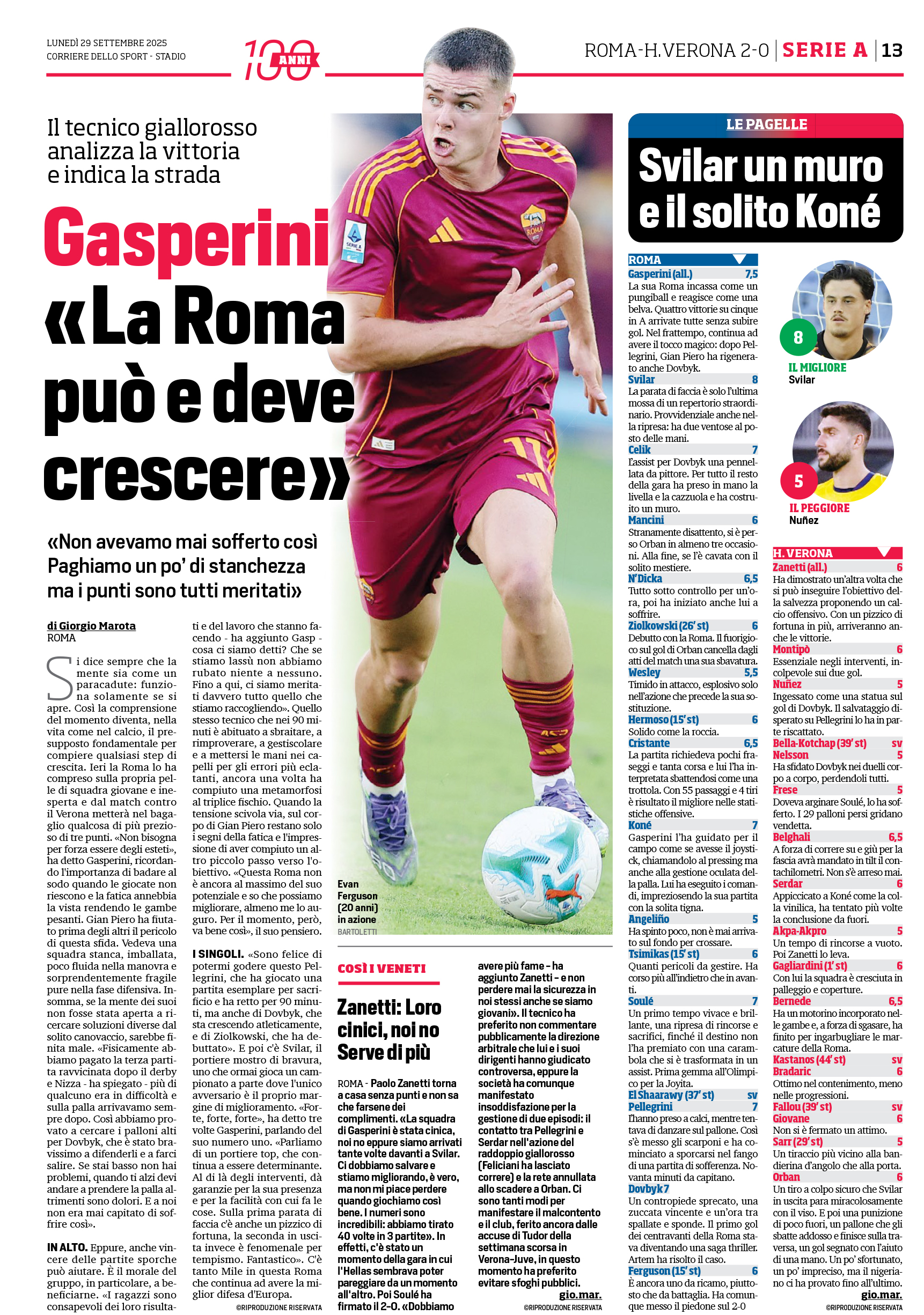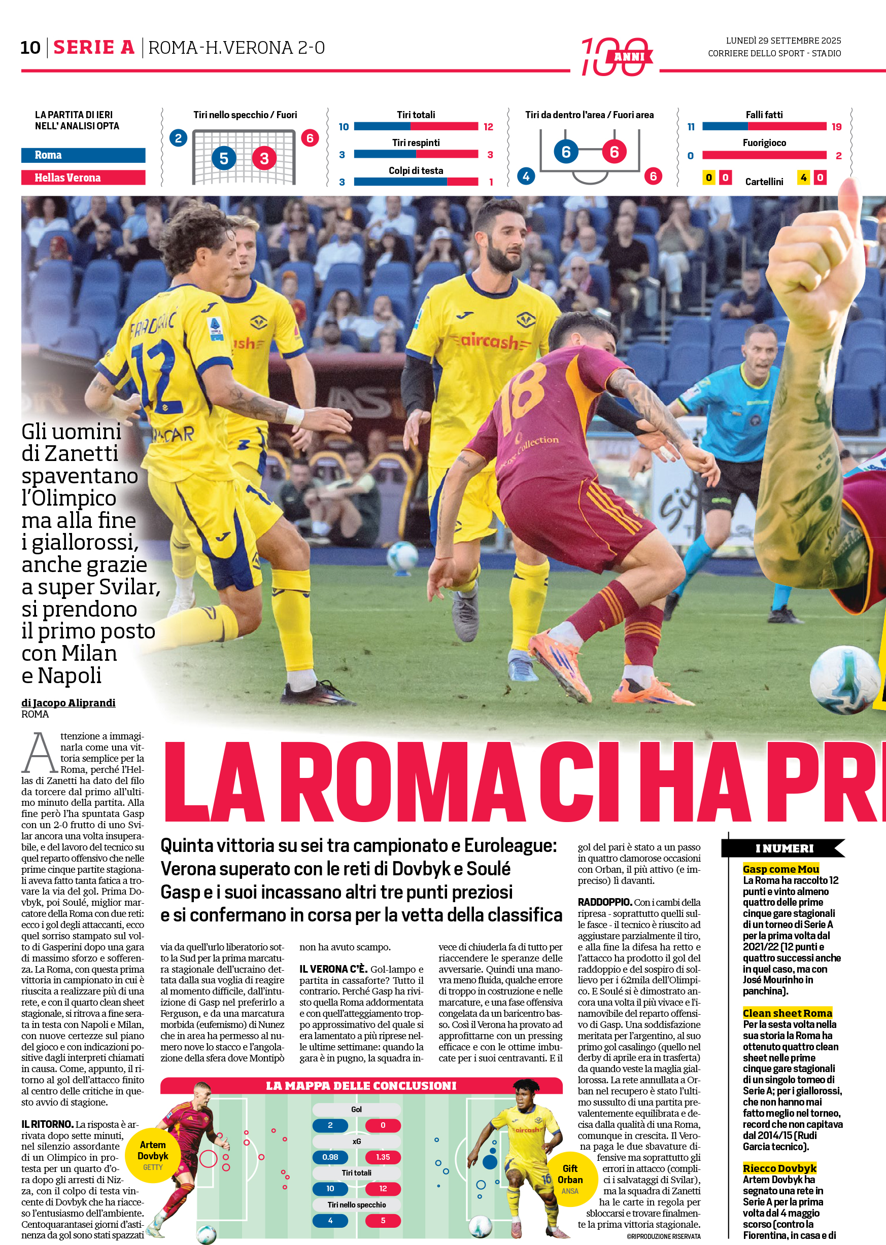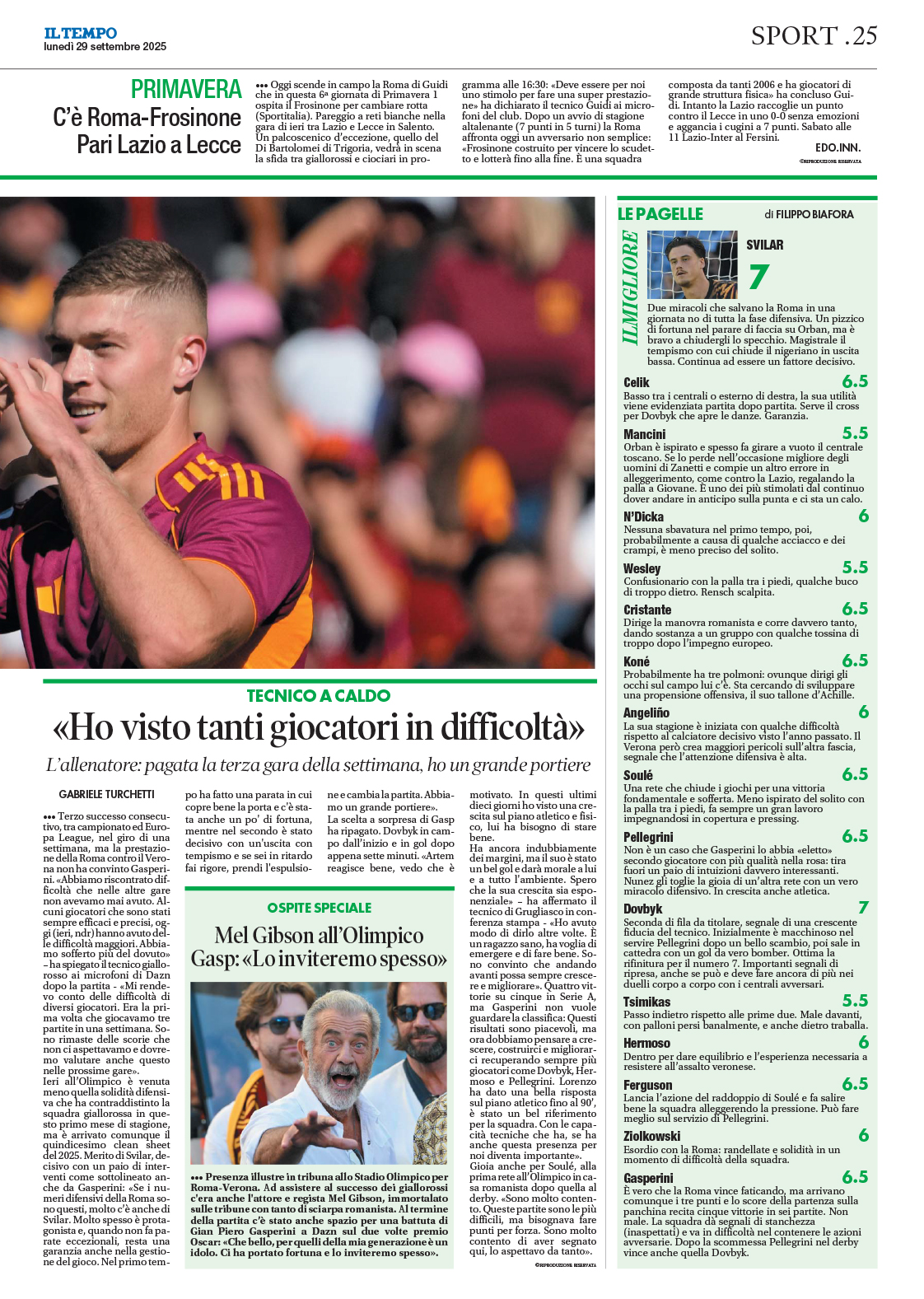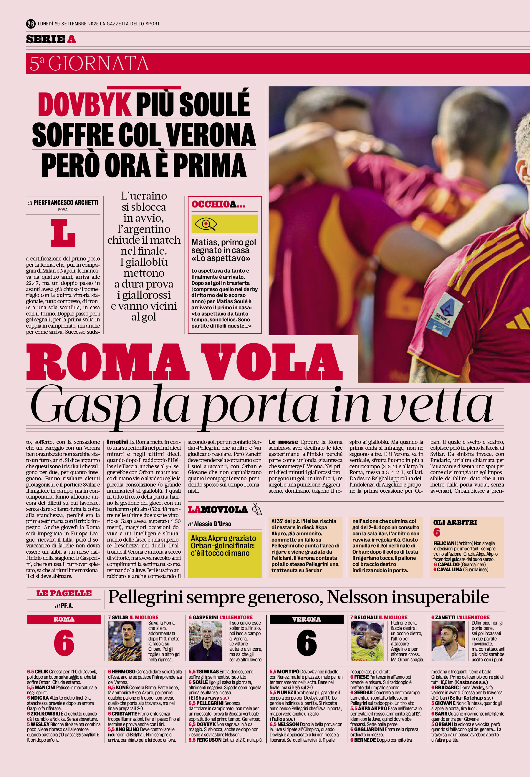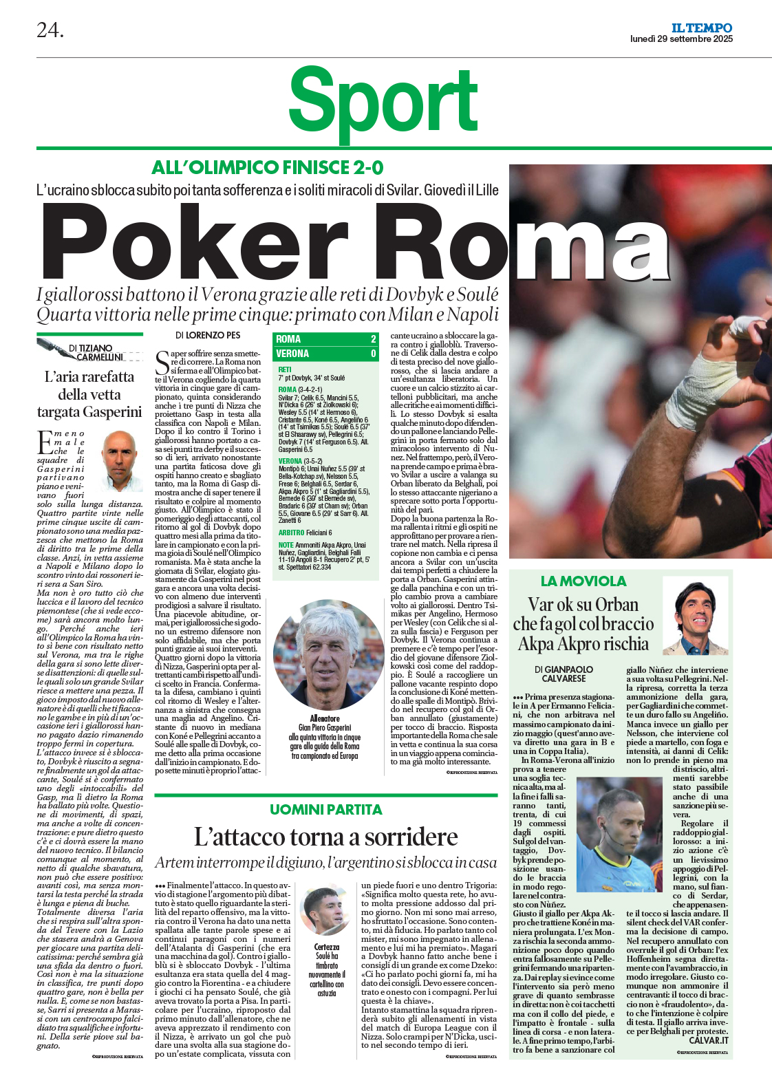 Roma (3-4-2-1): Svilar; Celik, Mancini, N'Dicka (26' st Ziolkowski); Wesley (14' st Hermoso), Koné, Cristante, Angelino (14' st Tsimikas); Soulé (37' st El Shaarawy), Pellegrini; Dovbyk (14' st Ferguson). A disposizione: Vasquez, Gollini, Rensch, El Aynaoui, Baldanzi, Pisilli, Sangaré, Ghilardi. All.: Gasperini Hellas Verona (3-5-2):