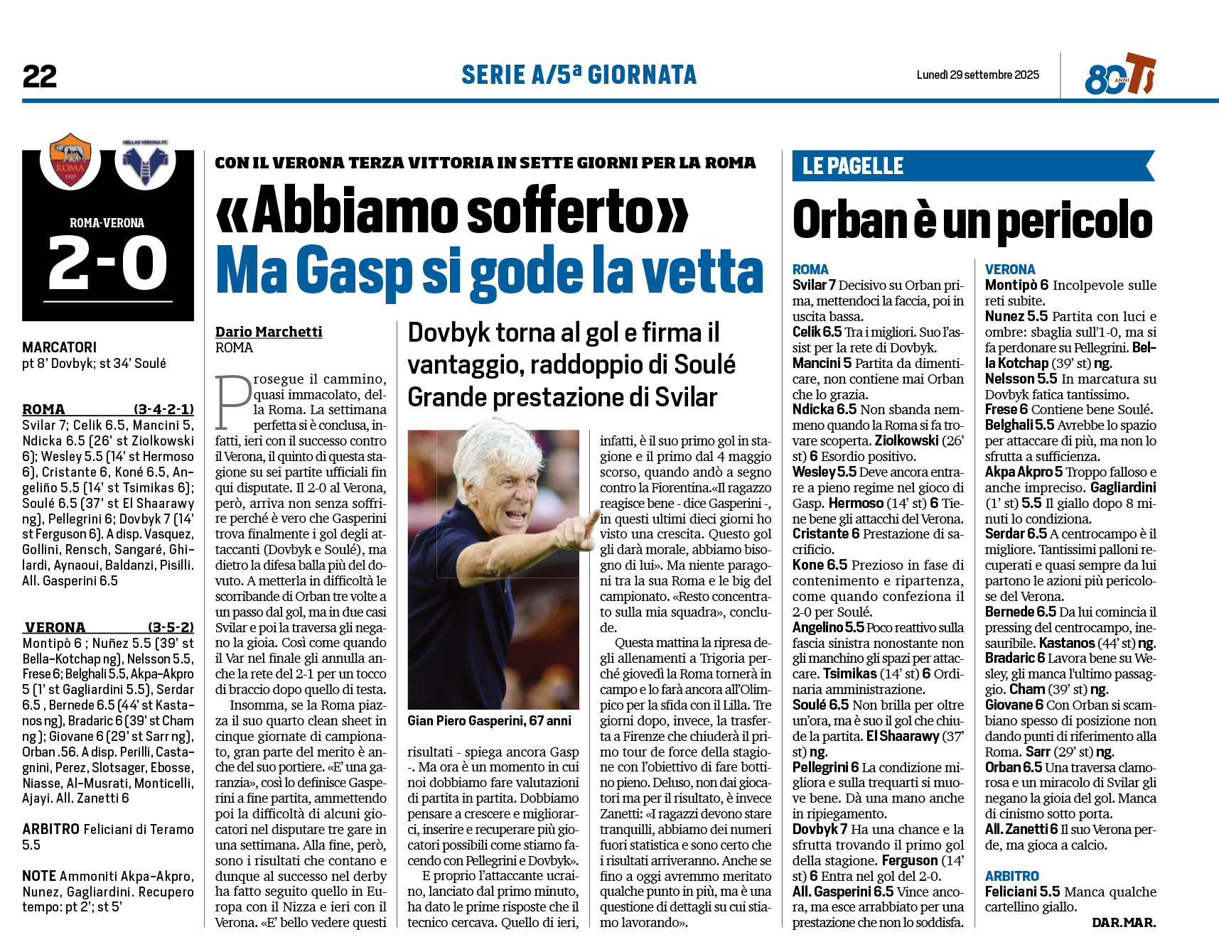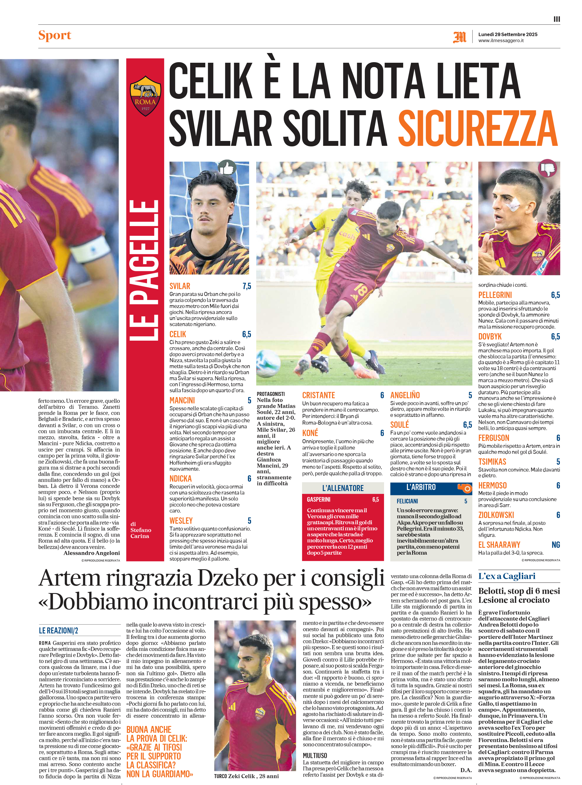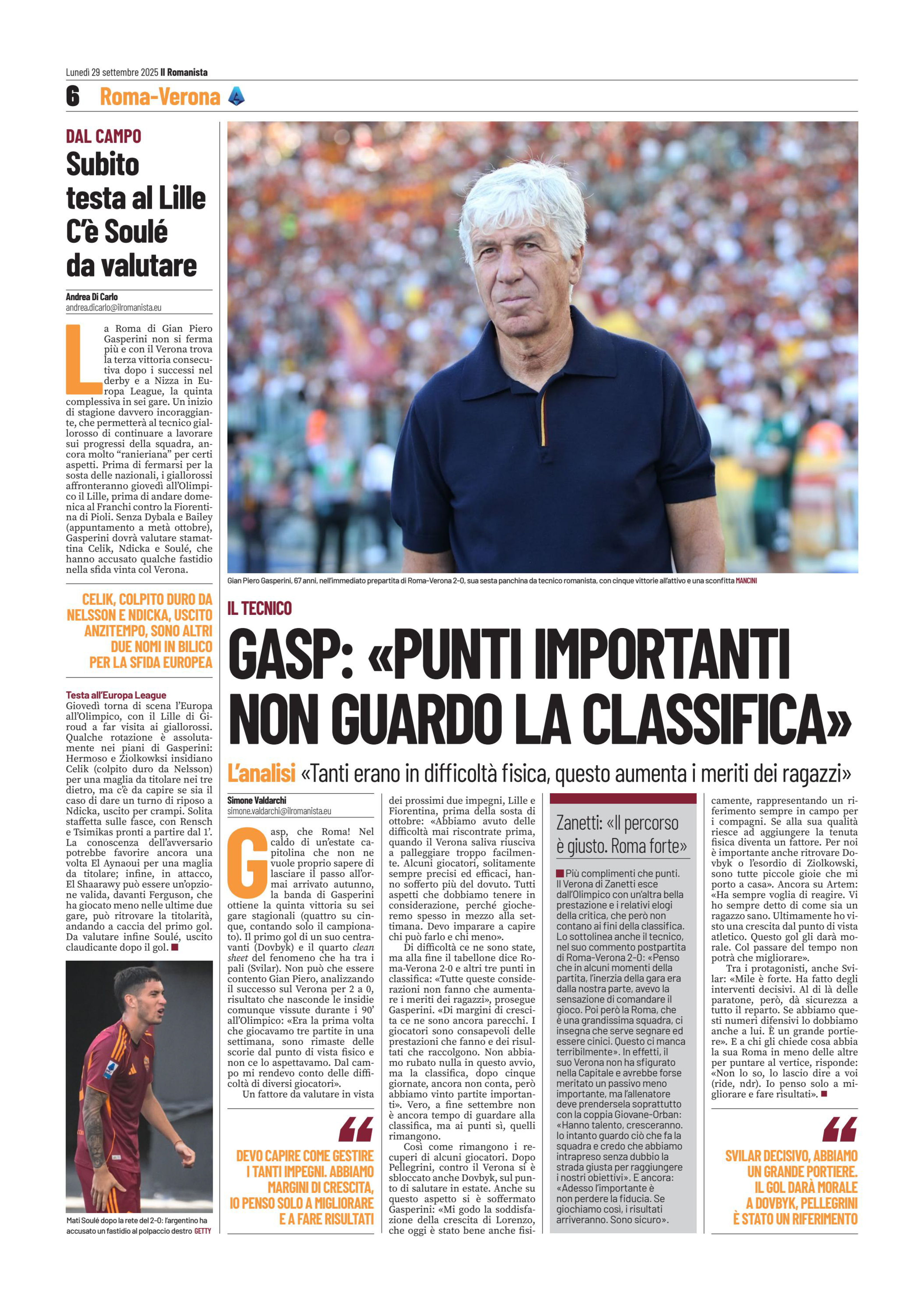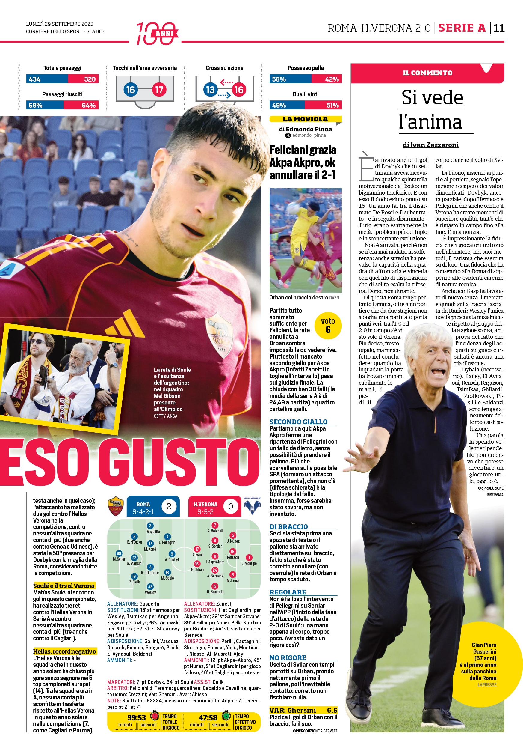 Roma (3-4-2-1): Svilar; Celik, Mancini, N'Dicka (26' st Ziolkowski); Wesley (14' st Hermoso), Koné, Cristante, Angelino (14' st Tsimikas); Soulé (37' st El Shaarawy), Pellegrini; Dovbyk (14' st Ferguson). A disposizione: Vasquez, Gollini, Rensch, El Aynaoui, Baldanzi, Pisilli, Sangaré, Ghilardi. All.: Gasperini Hellas Verona (3-5-2):