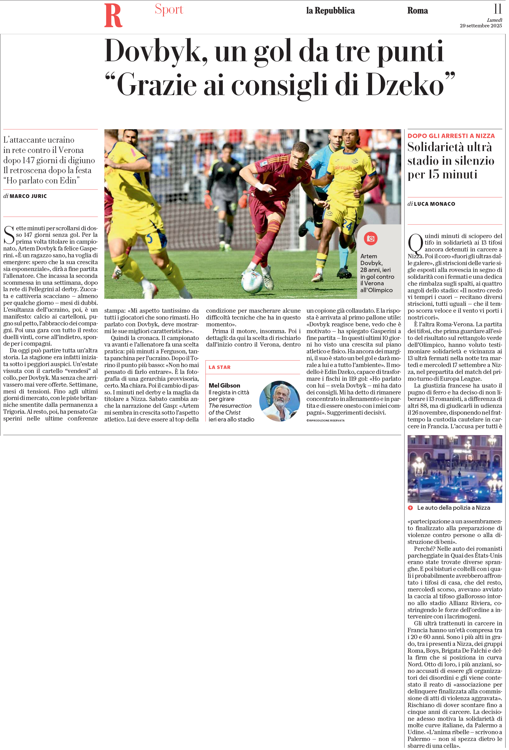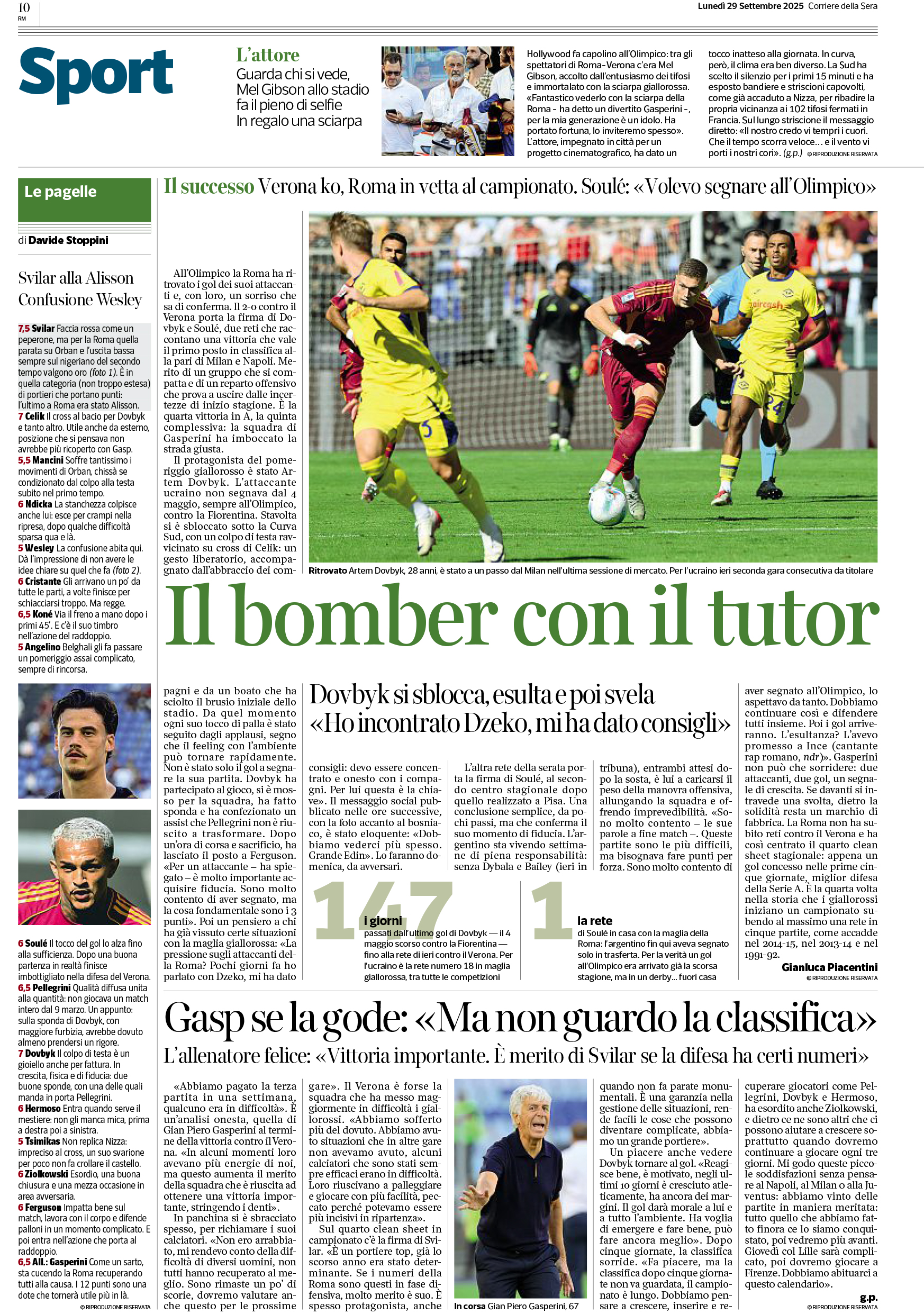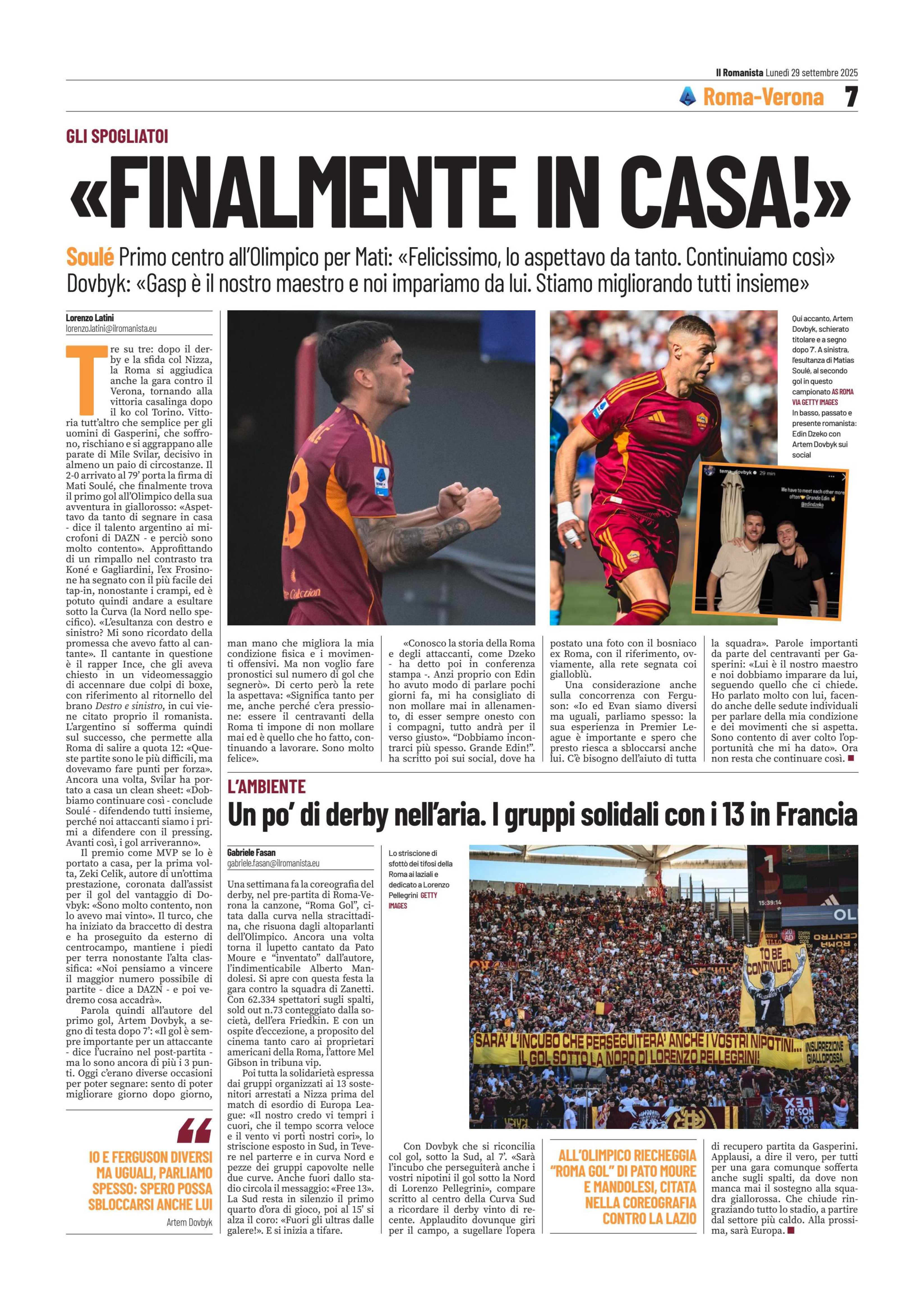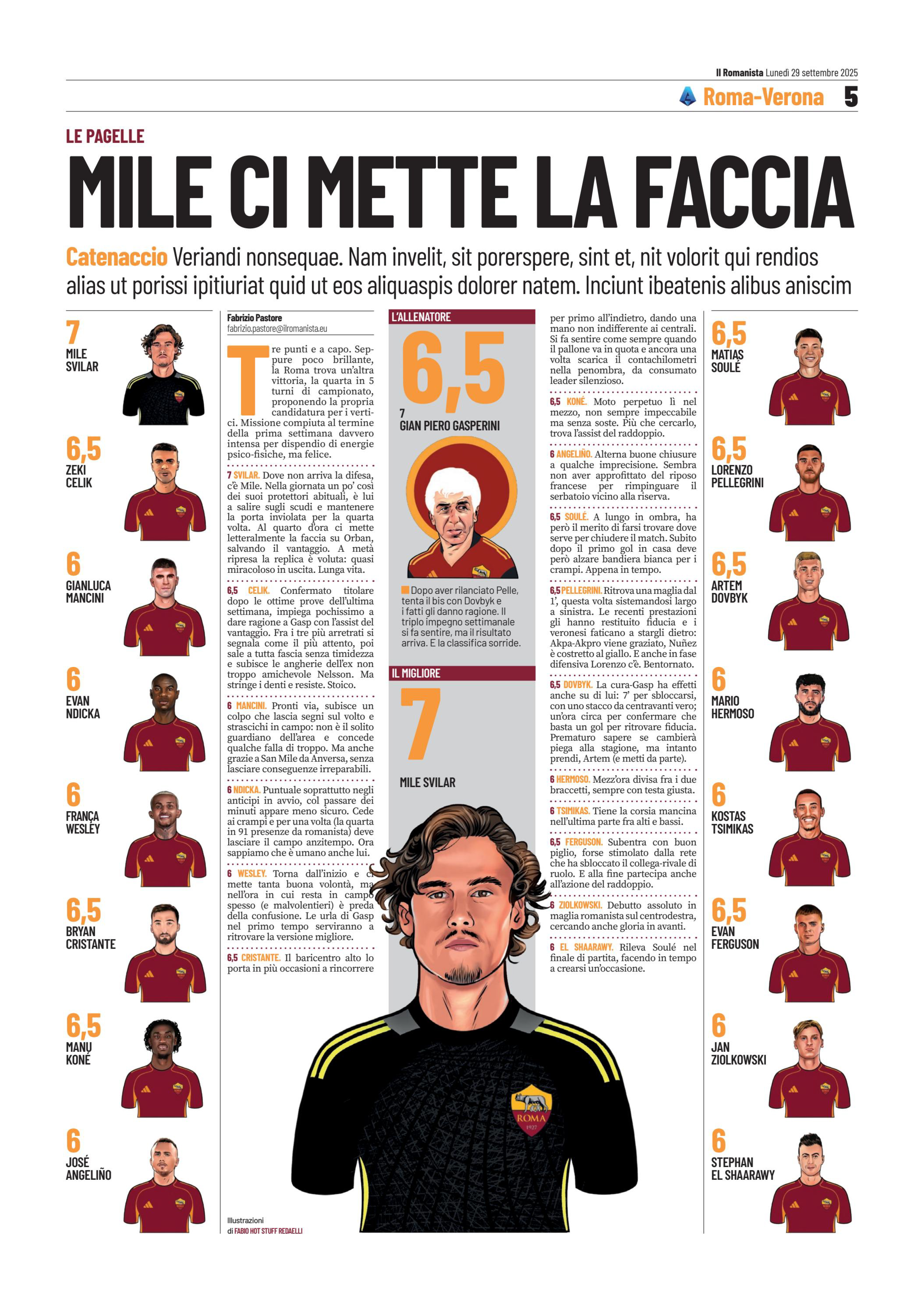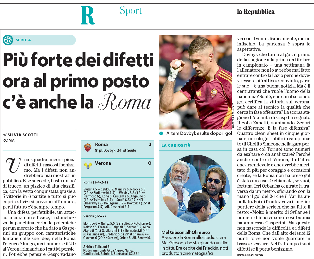 Roma (3-4-2-1): Svilar; Celik, Mancini, N'Dicka (26' st Ziolkowski); Wesley (14' st Hermoso), Koné, Cristante, Angelino (14' st Tsimikas); Soulé (37' st El Shaarawy), Pellegrini; Dovbyk (14' st Ferguson). A disposizione: Vasquez, Gollini, Rensch, El Aynaoui, Baldanzi, Pisilli, Sangaré, Ghilardi. All.: Gasperini Hellas Verona (3-5-2):