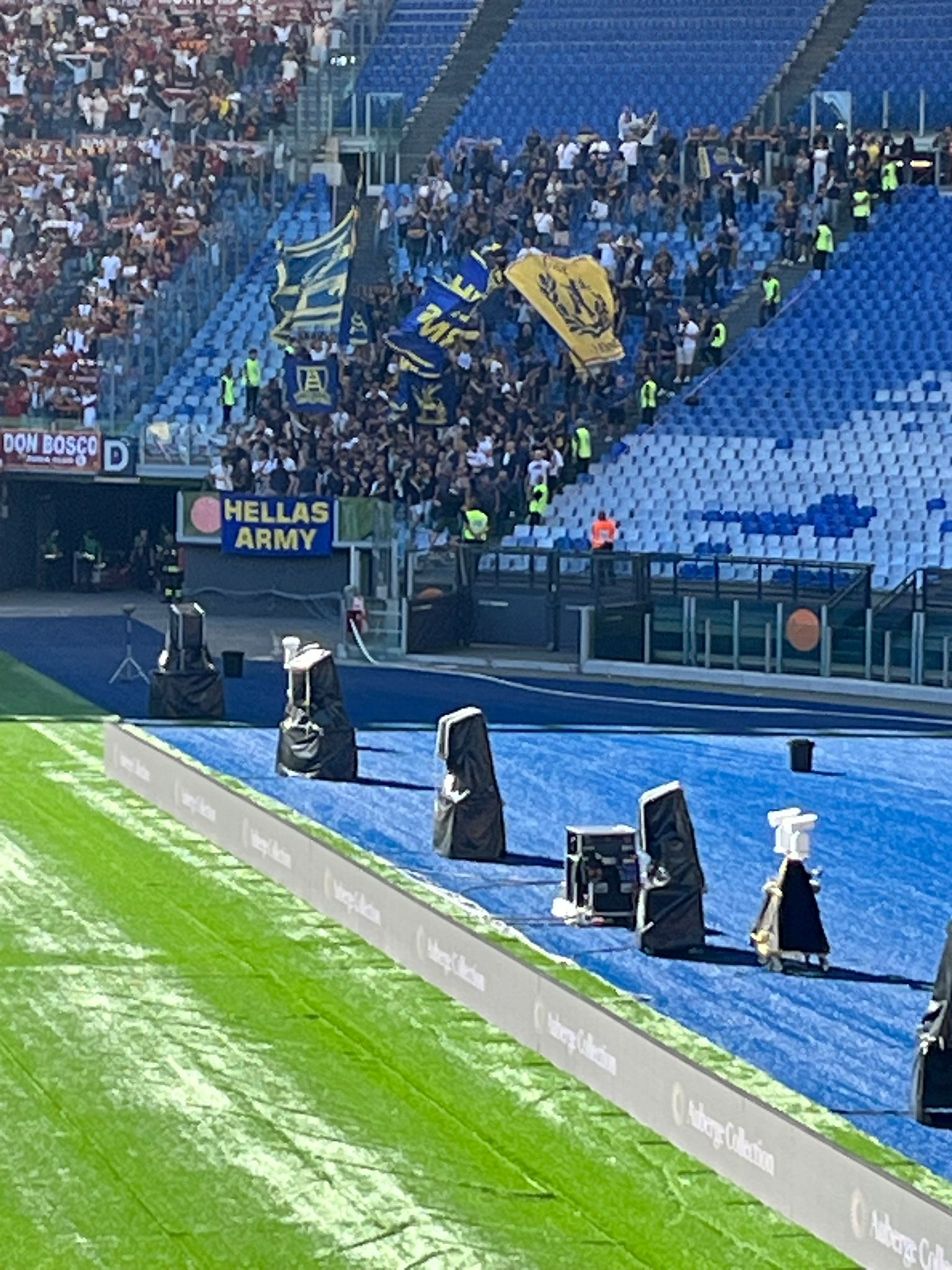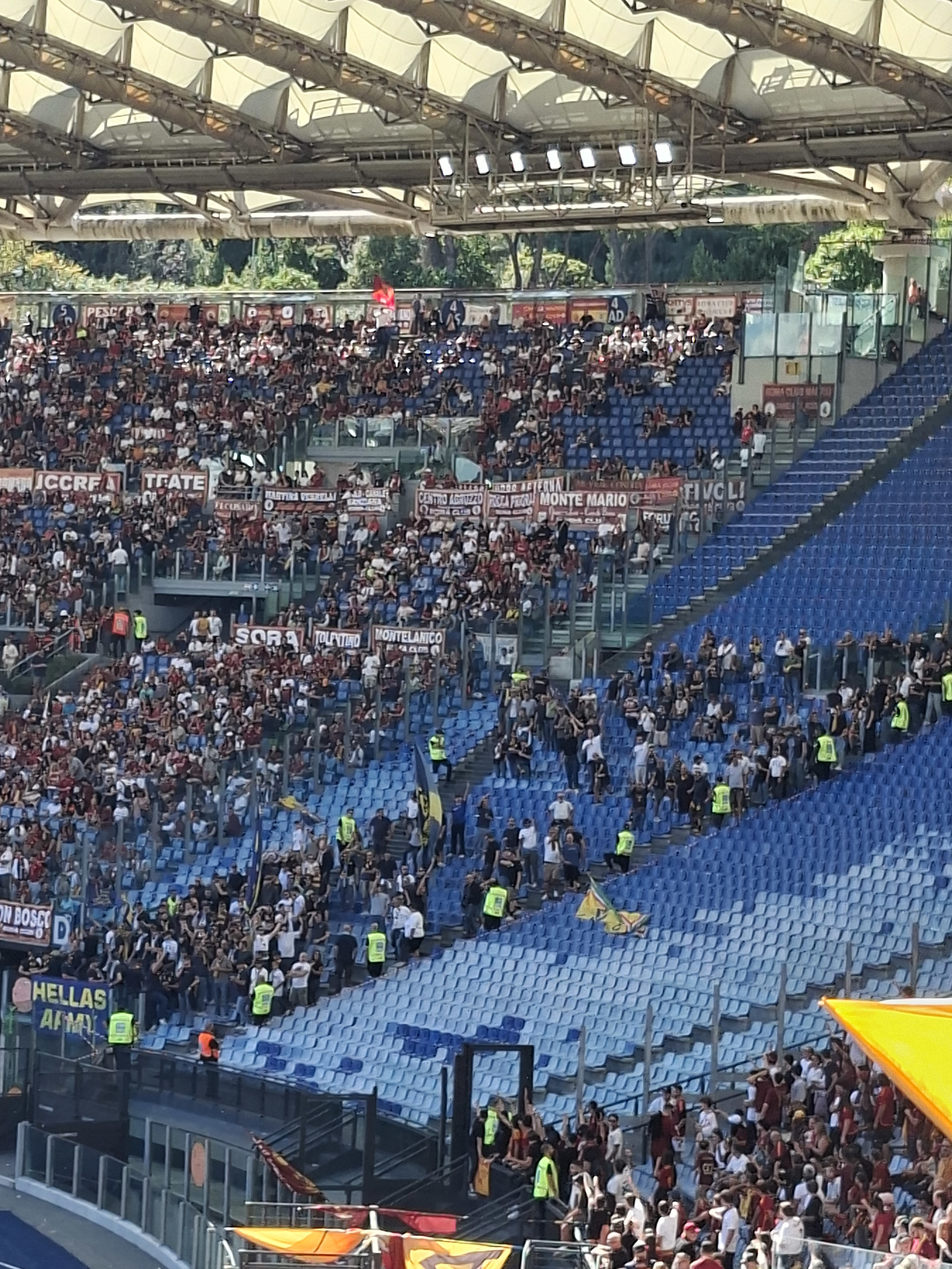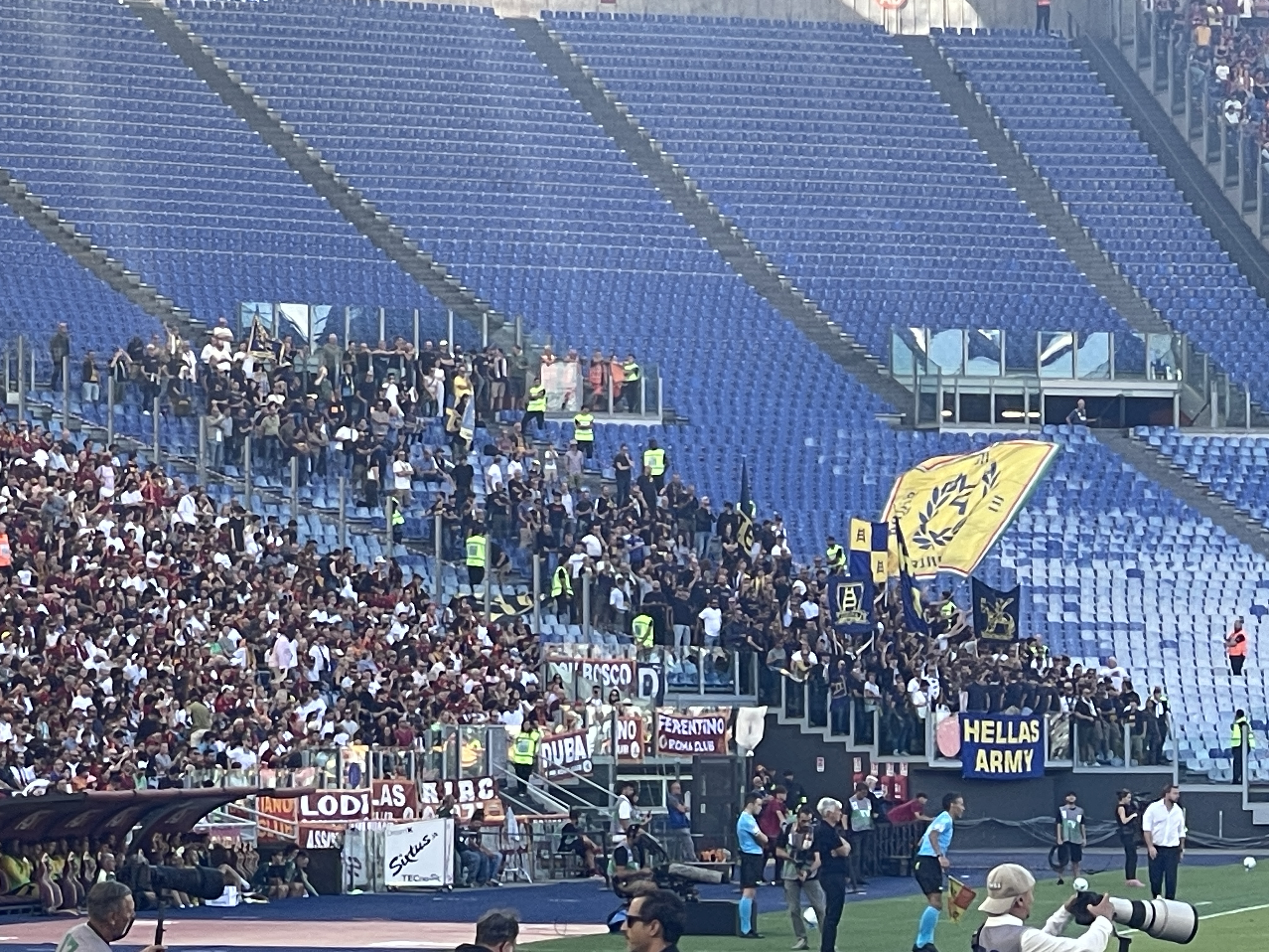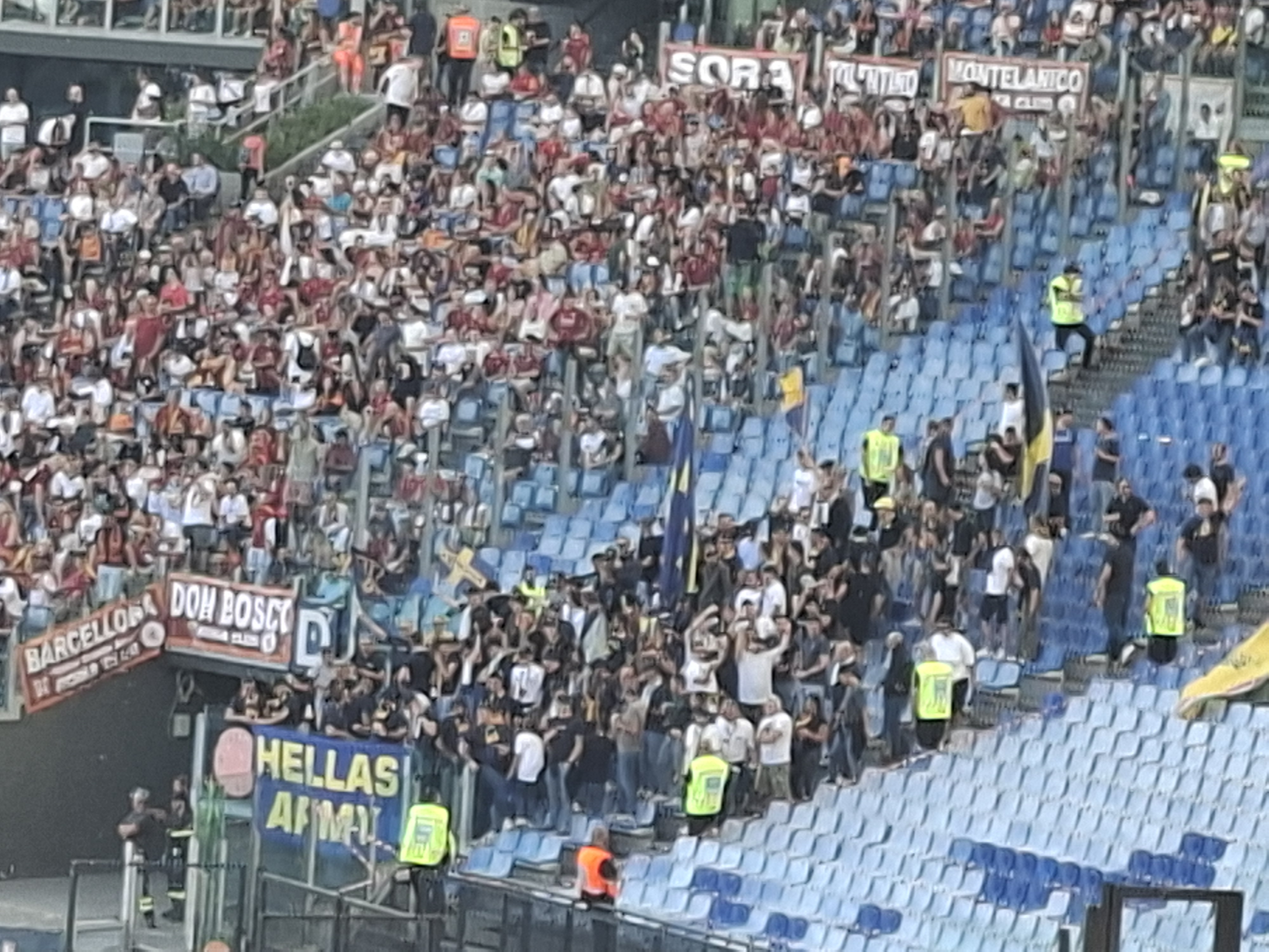 Tifo ospiti: Quelli che sono venuti han fatto una ottima impressione: compatti, movimentati, costanti nel tifo, con alcuni bandieroni ben disegnati che sventolano nel settore. Il problema è solo uno: per una partita alle 15.00 di domenica, come un tempo, sono veramente troppo pochi, credo sui 300. Eppure ormai Roma non è come negli anni '80/'90... Non conosco le dinamiche scaligere, ma più d'uno in Curva Sud si è chiesto: Verona si è imborghesita? |