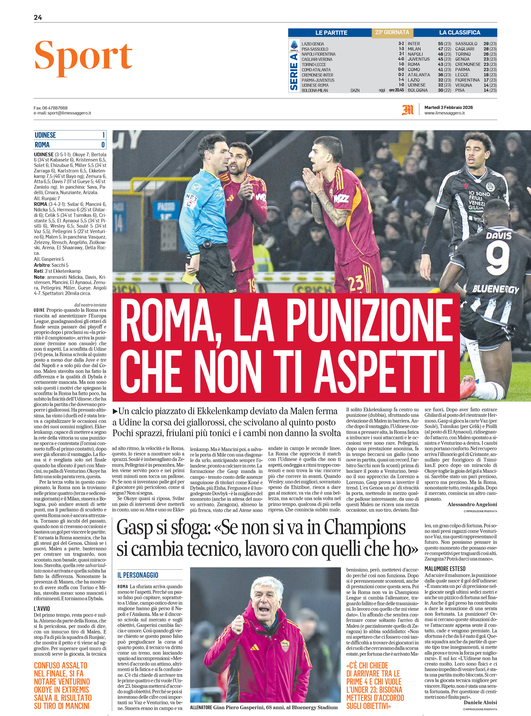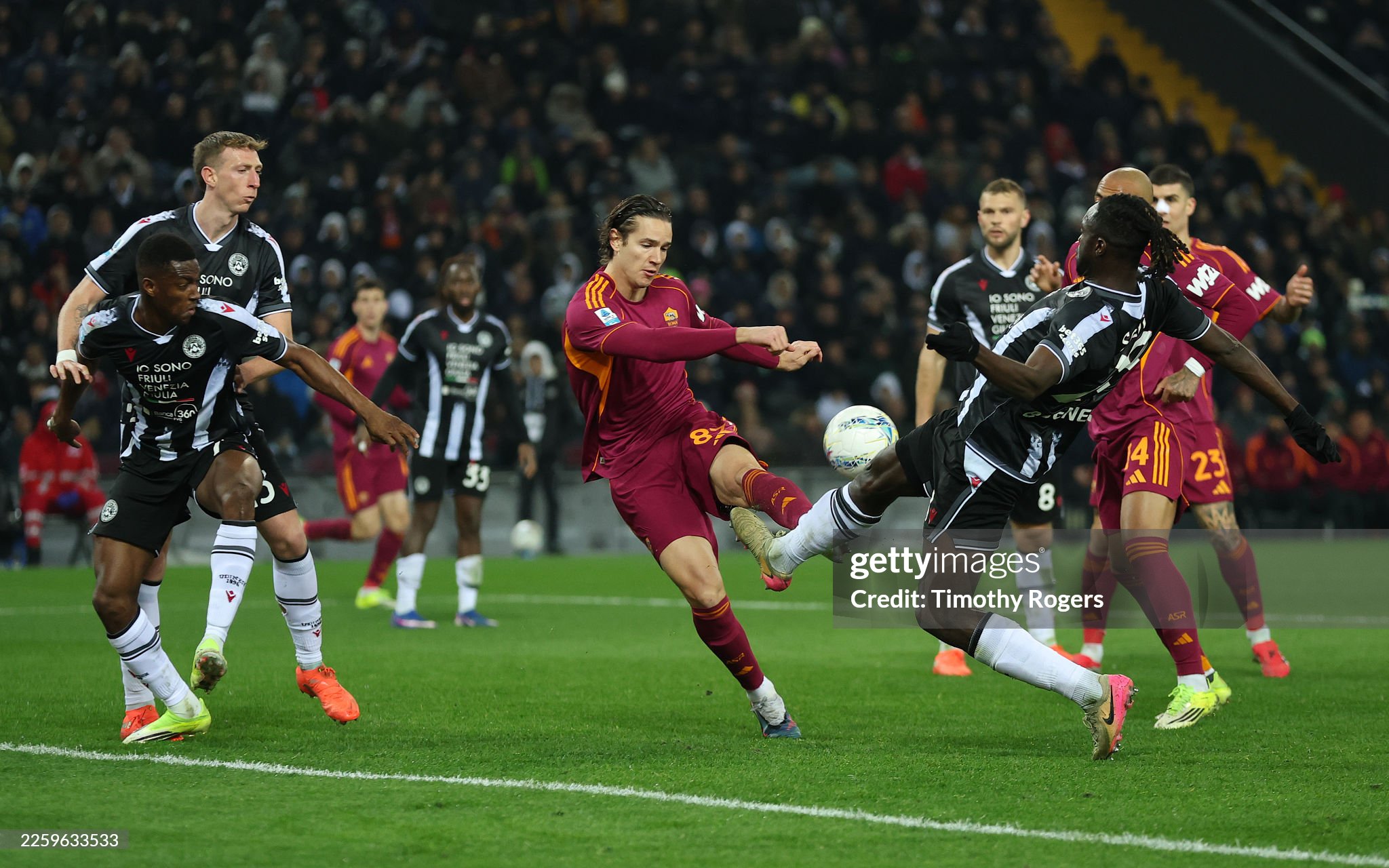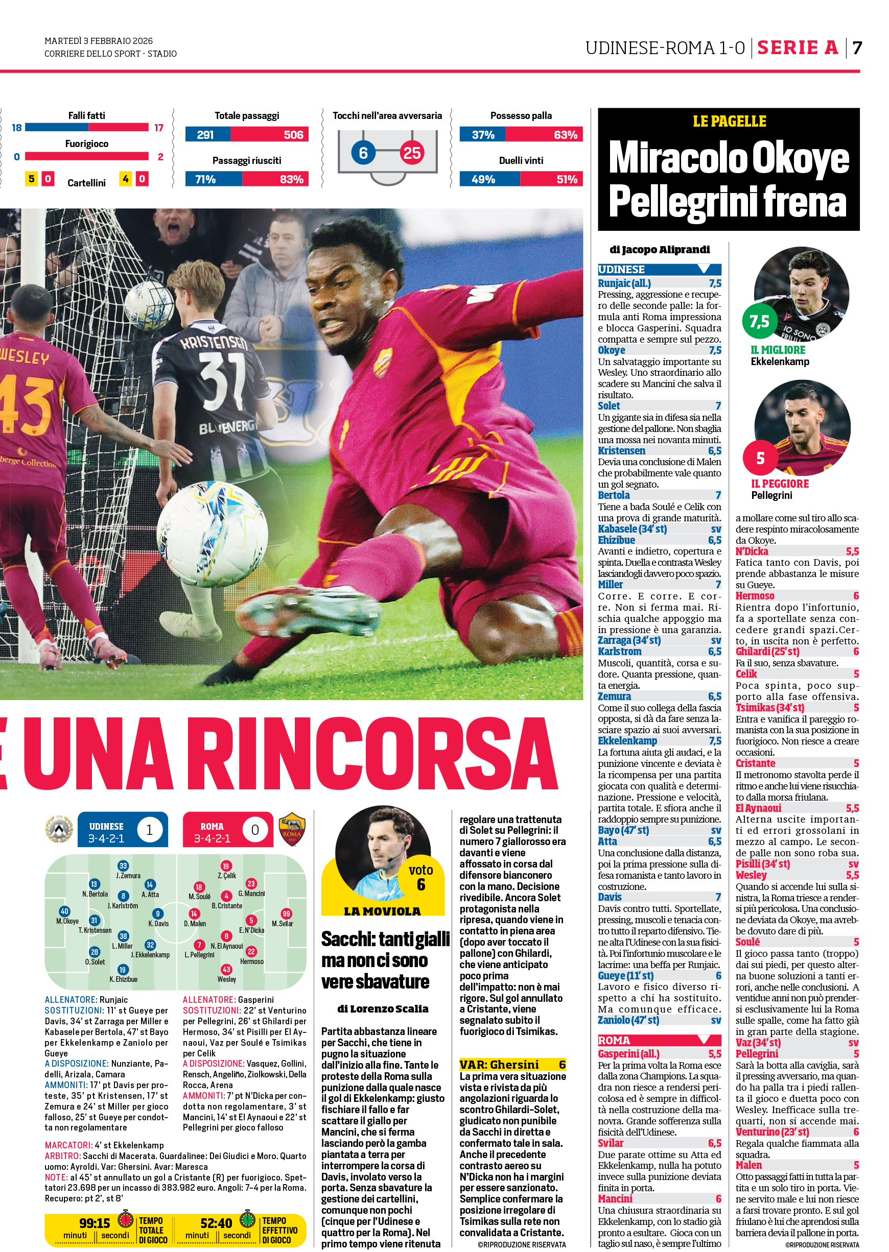 Udinese (3-4-2-1): Okoye; Solet, Kristensen, Bertola (dal 33’ st Kabasele); Ehizibue, Karlstrom (cap.), Miller (dal 33’ st Zarraga), Zemura; Ekkelenkamp (dal 46’ st Zaniolo), Atta; Davis (dal 11’ st Gueye, dal 46’ st Bayo). A disposizione: Nunziante, Padelli, Arizala, Camara. All. Runjaic Roma (3-4-2-1): Svilar; Mancini, Ndicka, Hermoso (dal 25’ st Ghilardi); Celik (dal 33’ st Tsimikas), Cristante (cap.), El Aynaoui (dal 33’ st Pisilli), Wesley; Soulé (dal 33’ st Vaz), Pellegrini (dal 22’ st Venturino); Malen. A disposizione: Vasquez, Gollini, Rensch, Angelino, Ziolkowski, Arena, Della Rocca. All. Gasperini Arbitro: Sacchi Assistenti: Dei Giudici - Moro IV ufficiale: Ayroldi VAR: Ghersini AVAR: Maresca Marcatori: Ekkelenkamp (U) al 4’ st Ammoniti: Ndicka (R) al 7’ pt, Davis (U) al 17’ pt, Kristensen (U) al 35’ pt, Mancini (R) al 3’ st, El Aynaoui (R) al 14’ st, Zemura (U) al 17’ st, Pellegrini (R) al 22’ st, Miller (U) al 23’ st, Gueye (U) al 25’ st Note: 2’ di recupero nel primo tempo. 5’ di recupero nel secondo tempo. Biglietti: 9.583 Incasso: 234.255 € Abbonamenti: 14.015 Rateo abbonamenti: 149.698 € Spettatori totali: 23.598 Incasso totale: 383.953 € |