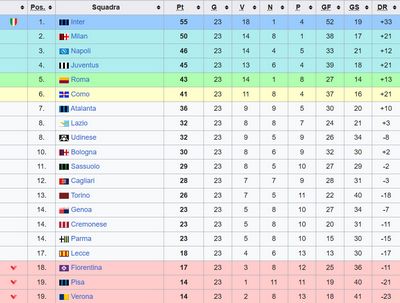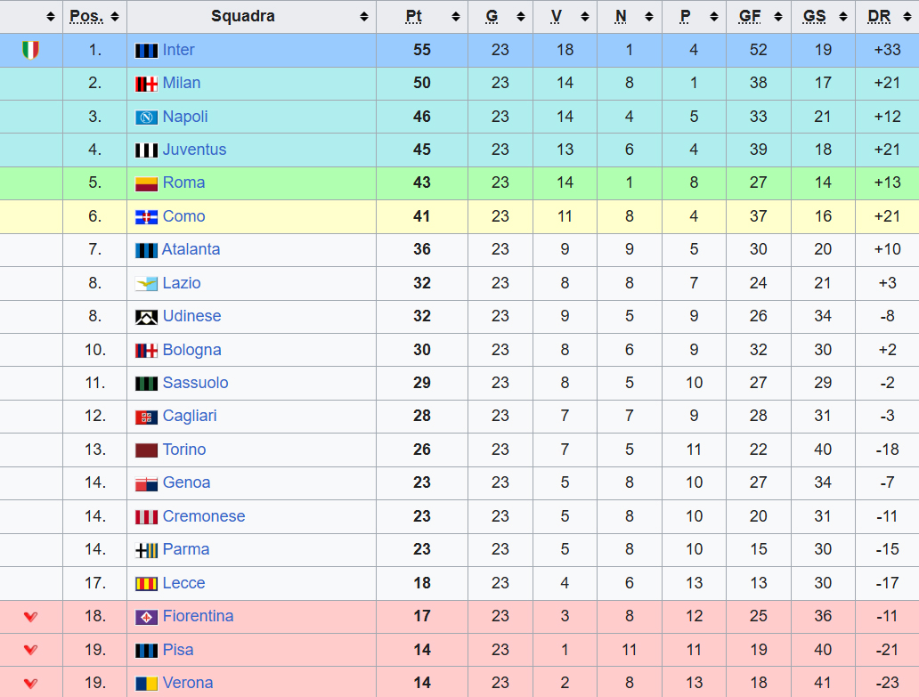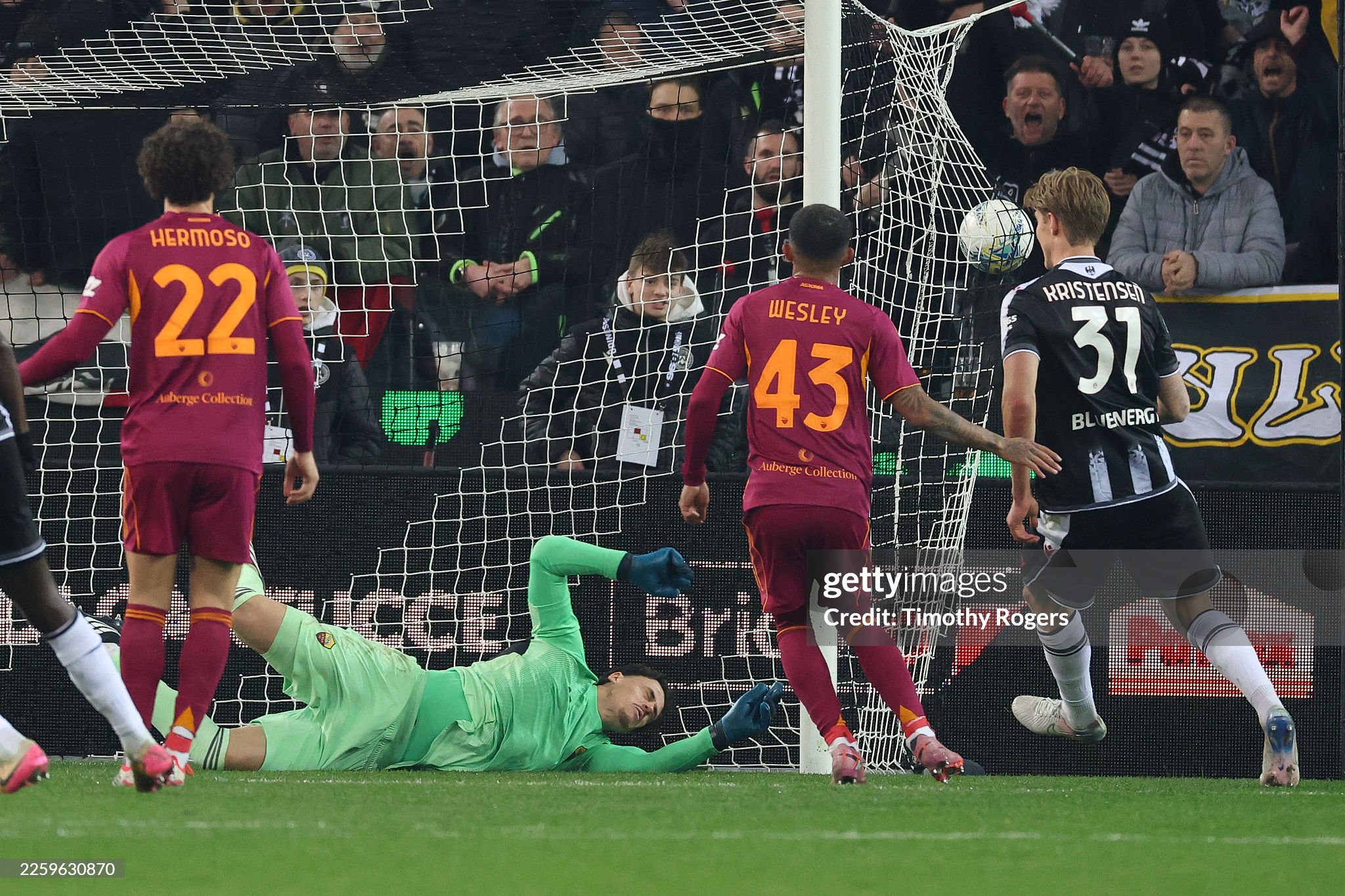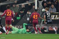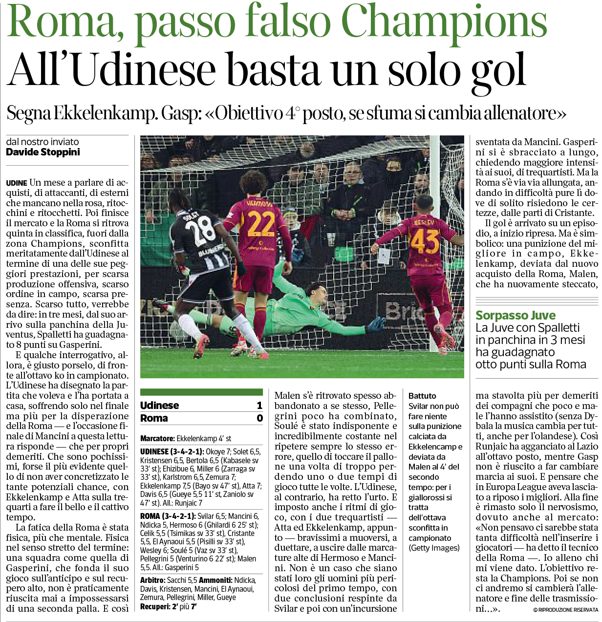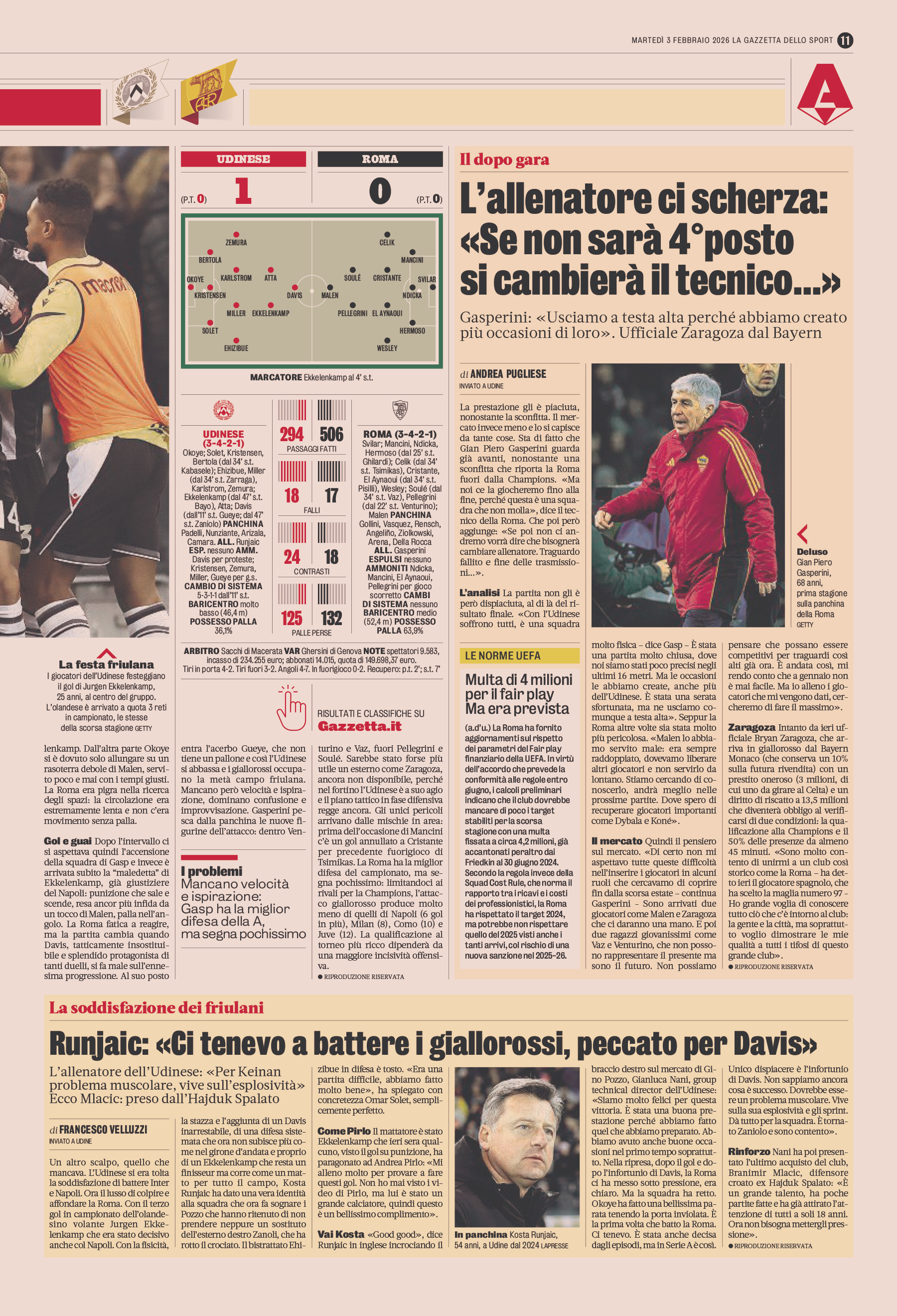 Udinese (3-4-2-1): Okoye; Solet, Kristensen, Bertola (dal 33’ st Kabasele); Ehizibue, Karlstrom (cap.), Miller (dal 33’ st Zarraga), Zemura; Ekkelenkamp (dal 46’ st Zaniolo), Atta; Davis (dal 11’ st Gueye, dal 46’ st Bayo). A disposizione: Nunziante, Padelli, Arizala, Camara. All. Runjaic Roma (3-4-2-1): Svilar; Mancini, Ndicka, Hermoso (dal 25’ st Ghilardi); Celik (dal 33’ st Tsimikas), Cristante (cap.), El Aynaoui (dal 33’ st Pisilli), Wesley; Soulé (dal 33’ st Vaz), Pellegrini (dal 22’ st Venturino); Malen. A disposizione: Vasquez, Gollini, Rensch, Angelino, Ziolkowski, Arena, Della Rocca. All. Gasperini Arbitro: Sacchi Assistenti: Dei Giudici - Moro IV ufficiale: Ayroldi VAR: Ghersini AVAR: Maresca Marcatori: Ekkelenkamp (U) al 4’ st Ammoniti: Ndicka (R) al 7’ pt, Davis (U) al 17’ pt, Kristensen (U) al 35’ pt, Mancini (R) al 3’ st, El Aynaoui (R) al 14’ st, Zemura (U) al 17’ st, Pellegrini (R) al 22’ st, Miller (U) al 23’ st, Gueye (U) al 25’ st Note: 2’ di recupero nel primo tempo. 5’ di recupero nel secondo tempo. Biglietti: 9.583 Incasso: 234.255 € Abbonamenti: 14.015 Rateo abbonamenti: 149.698 € Spettatori totali: 23.598 Incasso totale: 383.953 € |