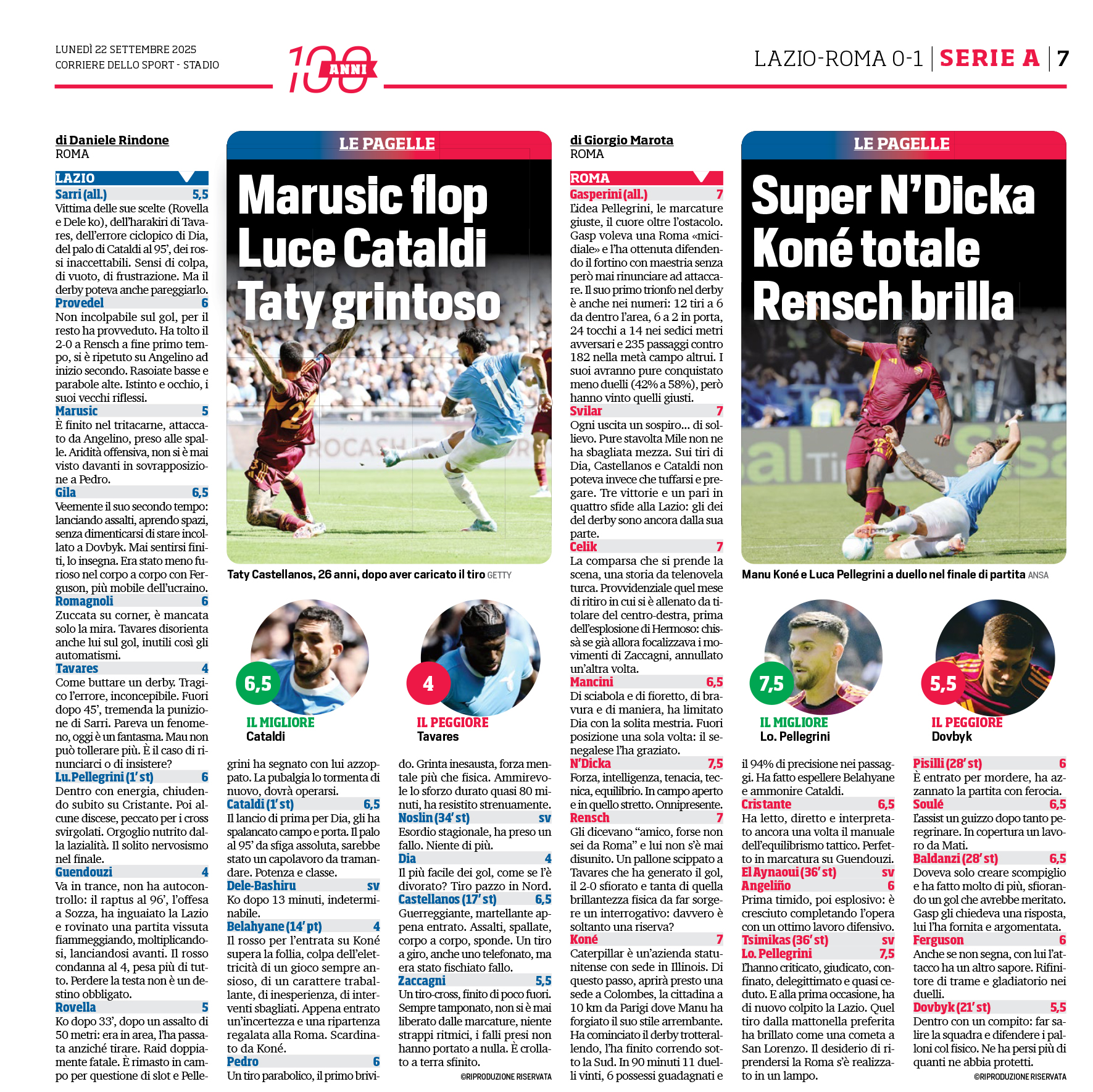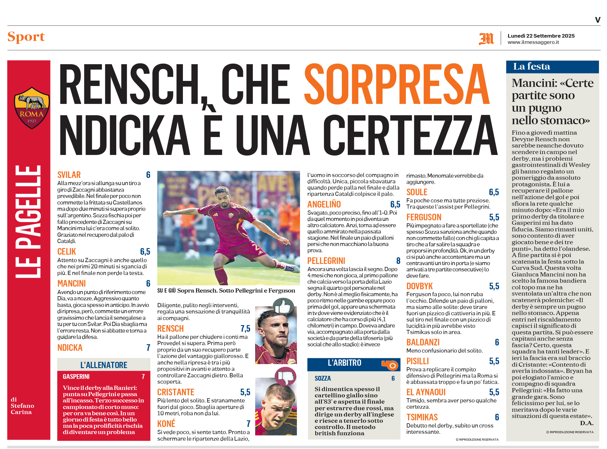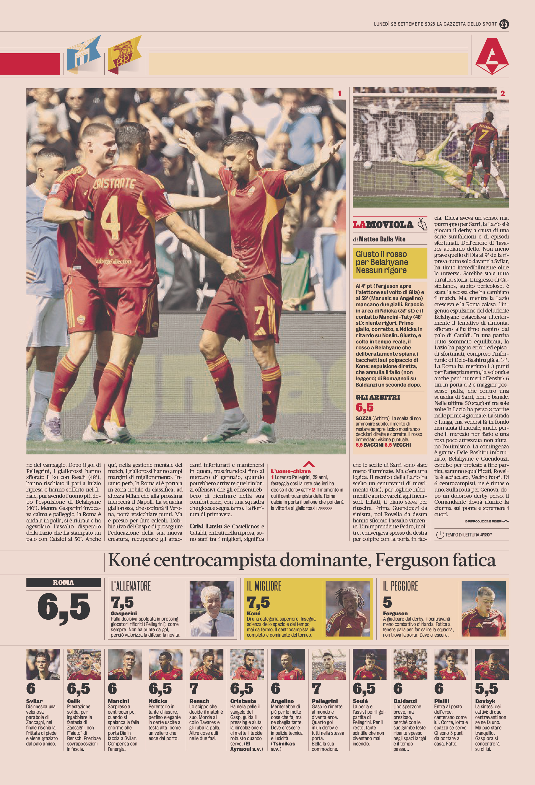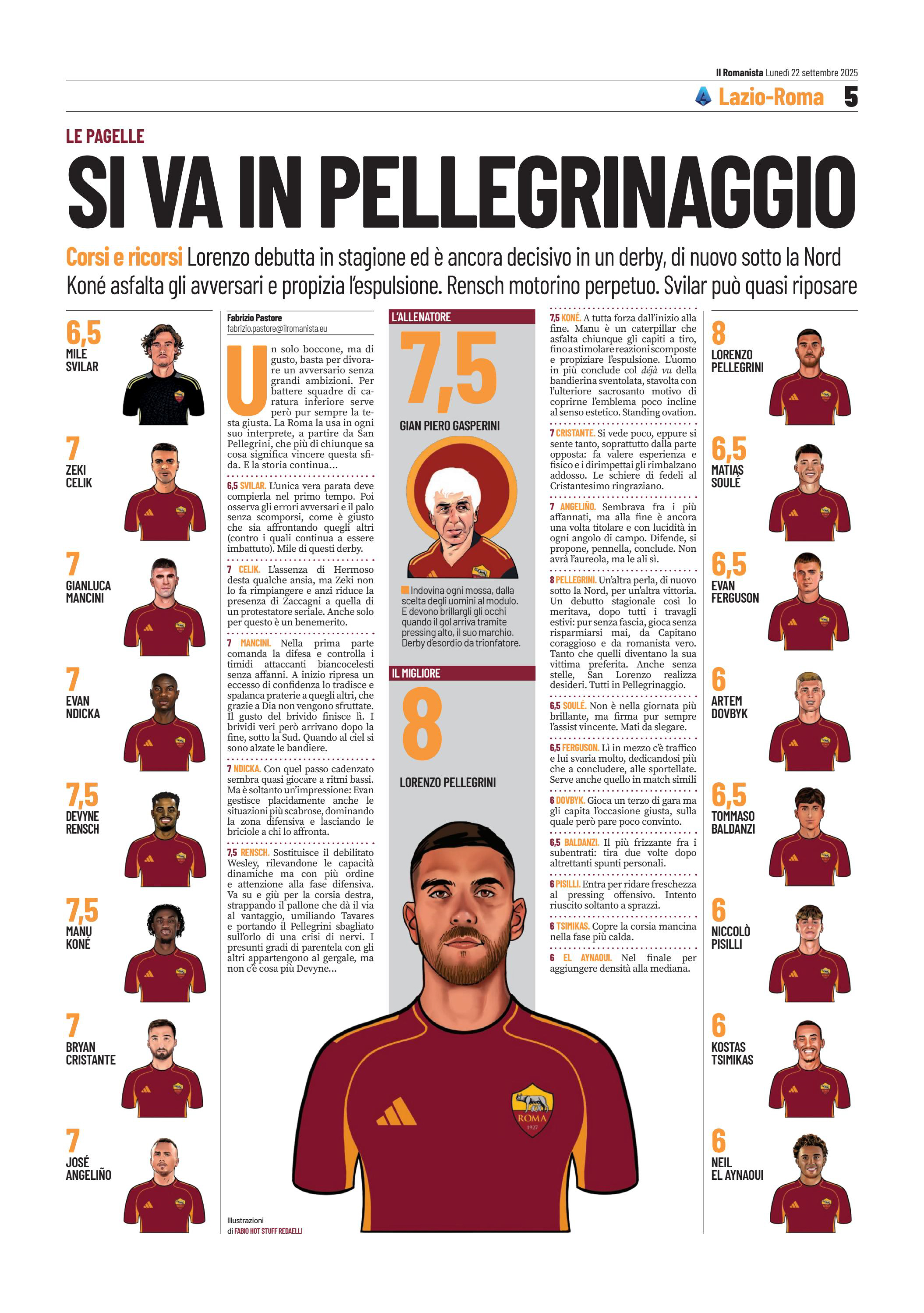 ROMA (3-5-2): Svilar 6.5; Celik 6, Mancini 6.5, Ndicka 6; Rensch 6, Cristante 6 (81' El Ayanaoui 6), Koné 7, Pellegrini 7 (73' Pisilli 6), Angelino 6.5 (81' Tsimikas 5.5); Soulé 6.5 (73' Baldanzi 6), Ferguson 5.5 (66' Dovbyk 6). All. Gasperini.