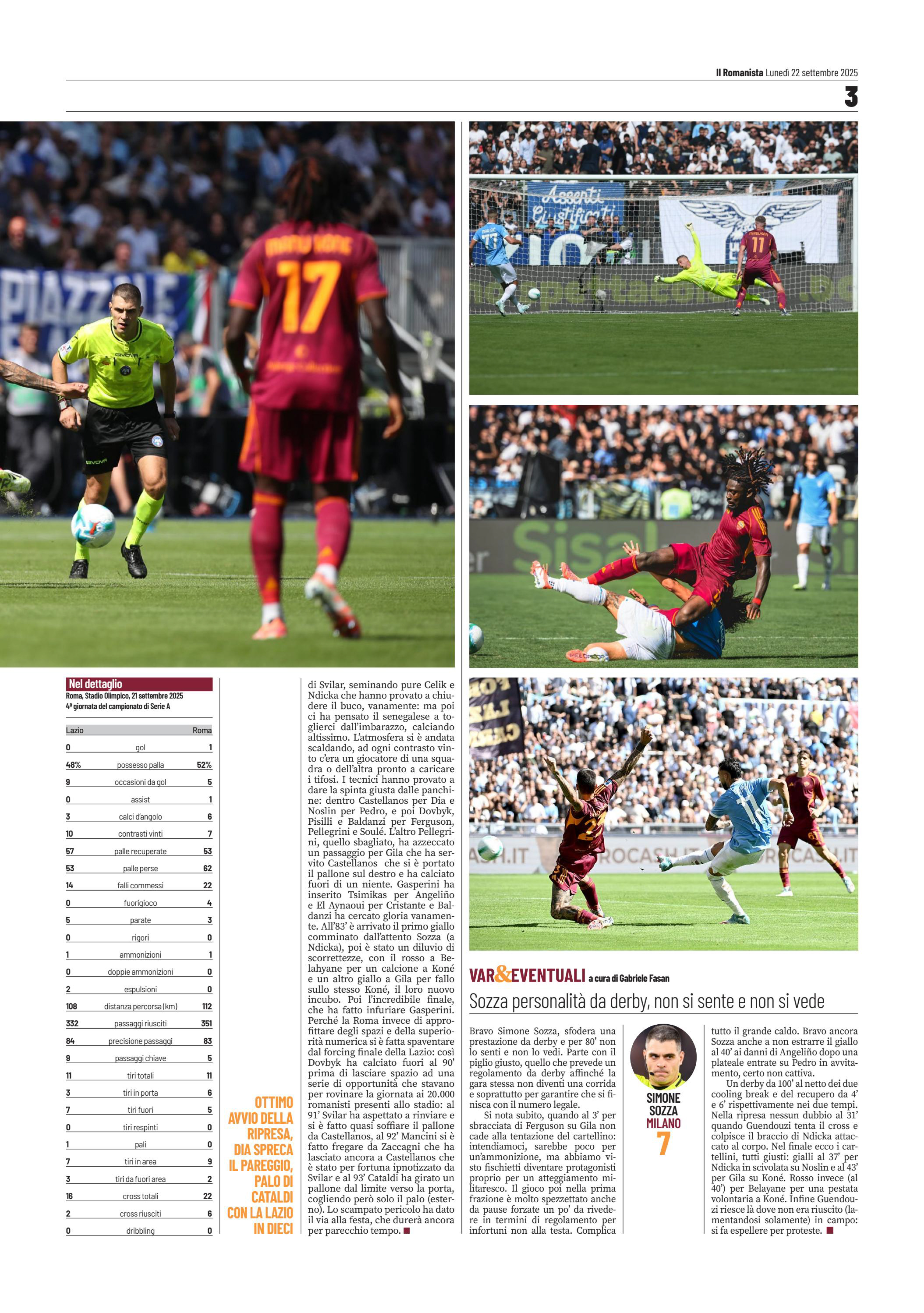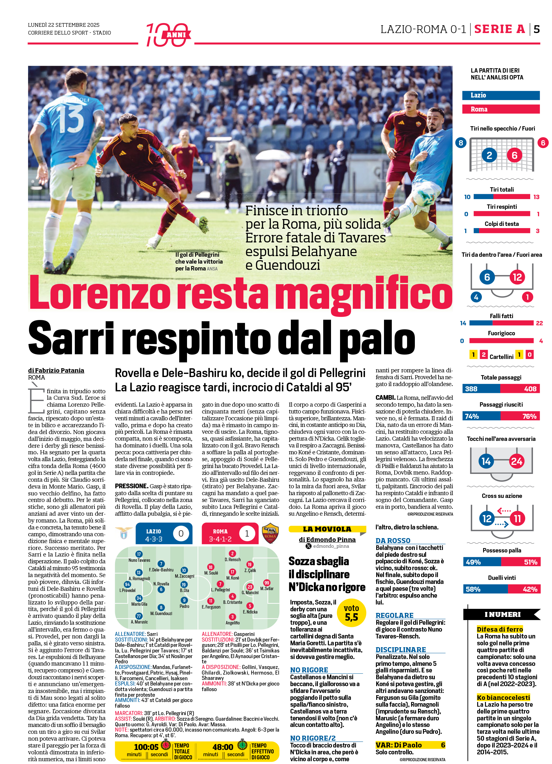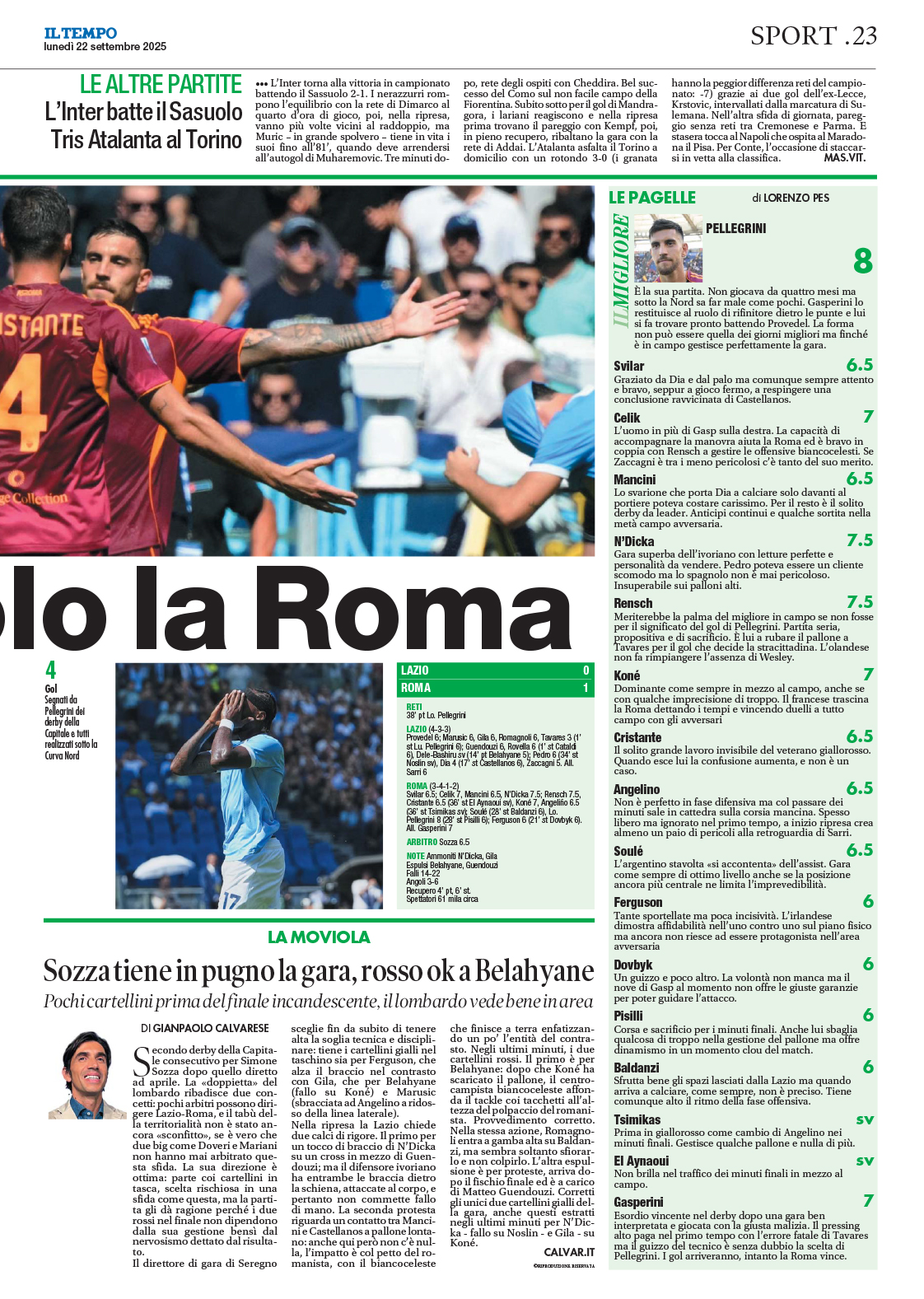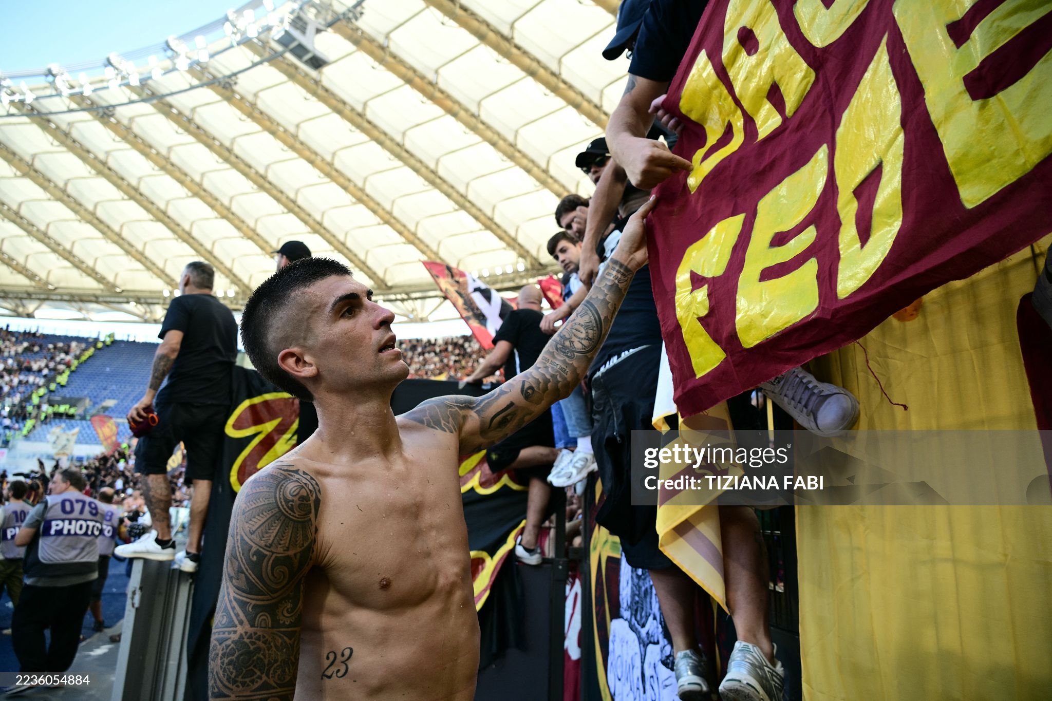 ROMA (3-5-2): Svilar 6.5; Celik 6, Mancini 6.5, Ndicka 6; Rensch 6, Cristante 6 (81' El Ayanaoui 6), Koné 7, Pellegrini 7 (73' Pisilli 6), Angelino 6.5 (81' Tsimikas 5.5); Soulé 6.5 (73' Baldanzi 6), Ferguson 5.5 (66' Dovbyk 6). All. Gasperini.