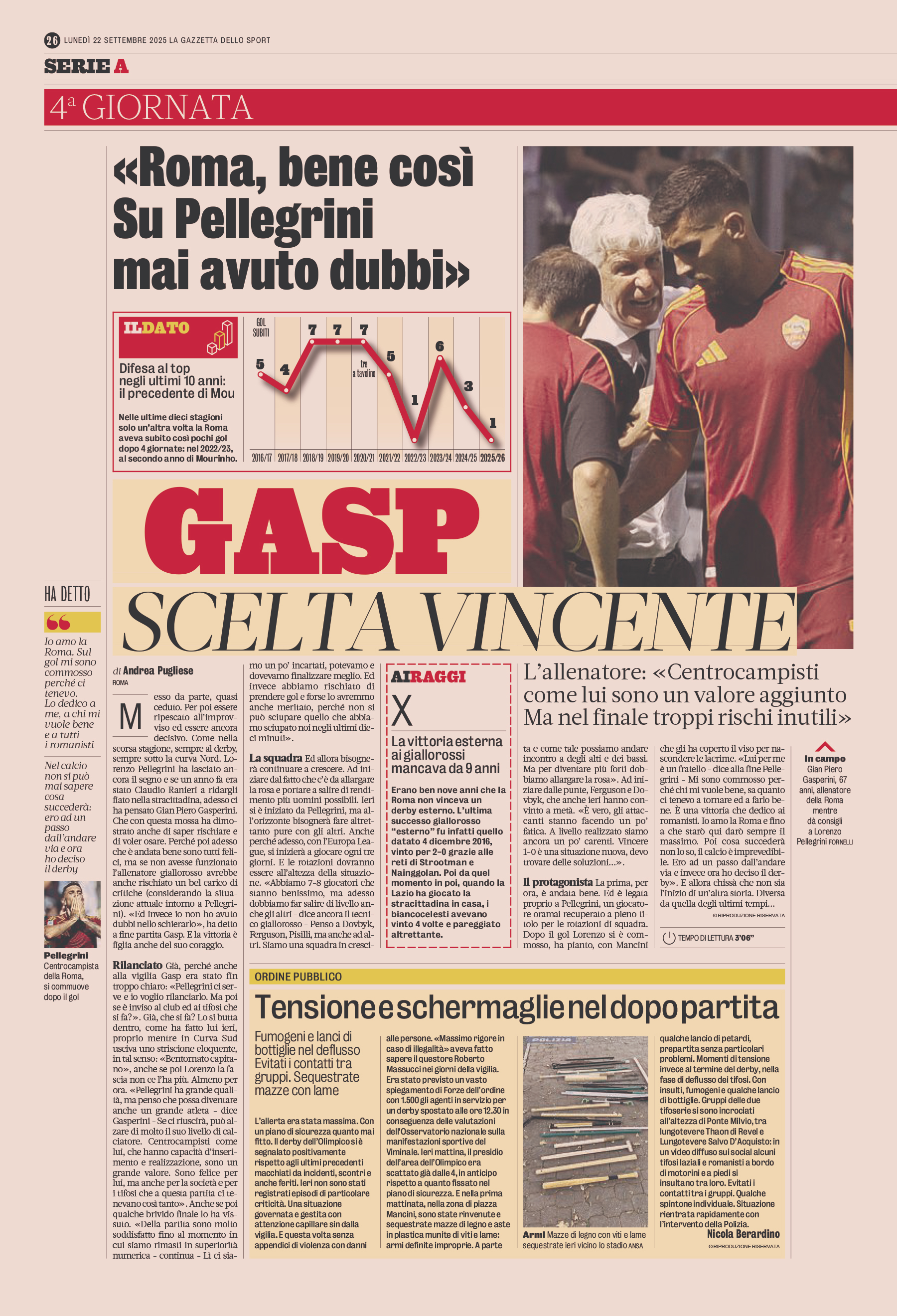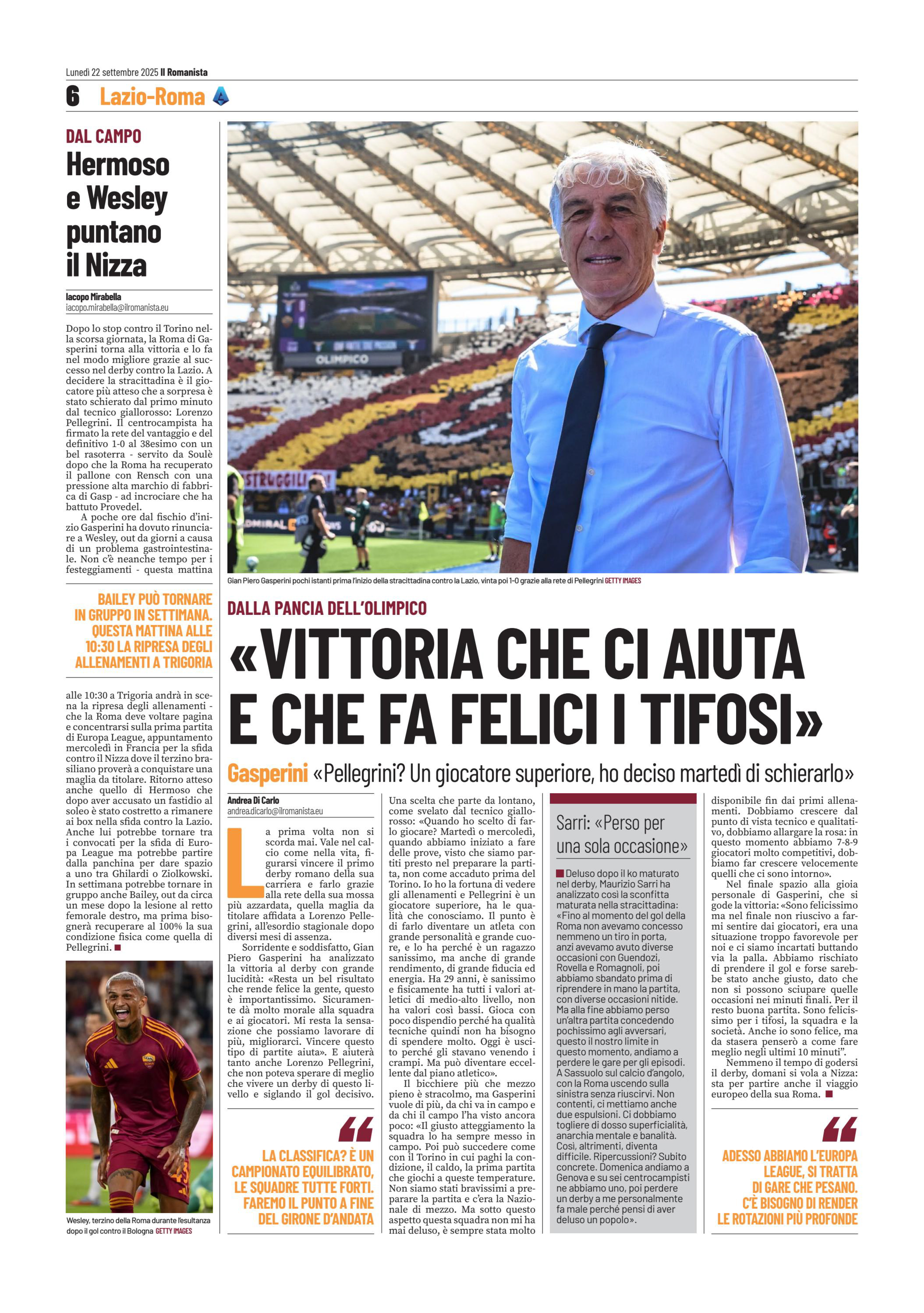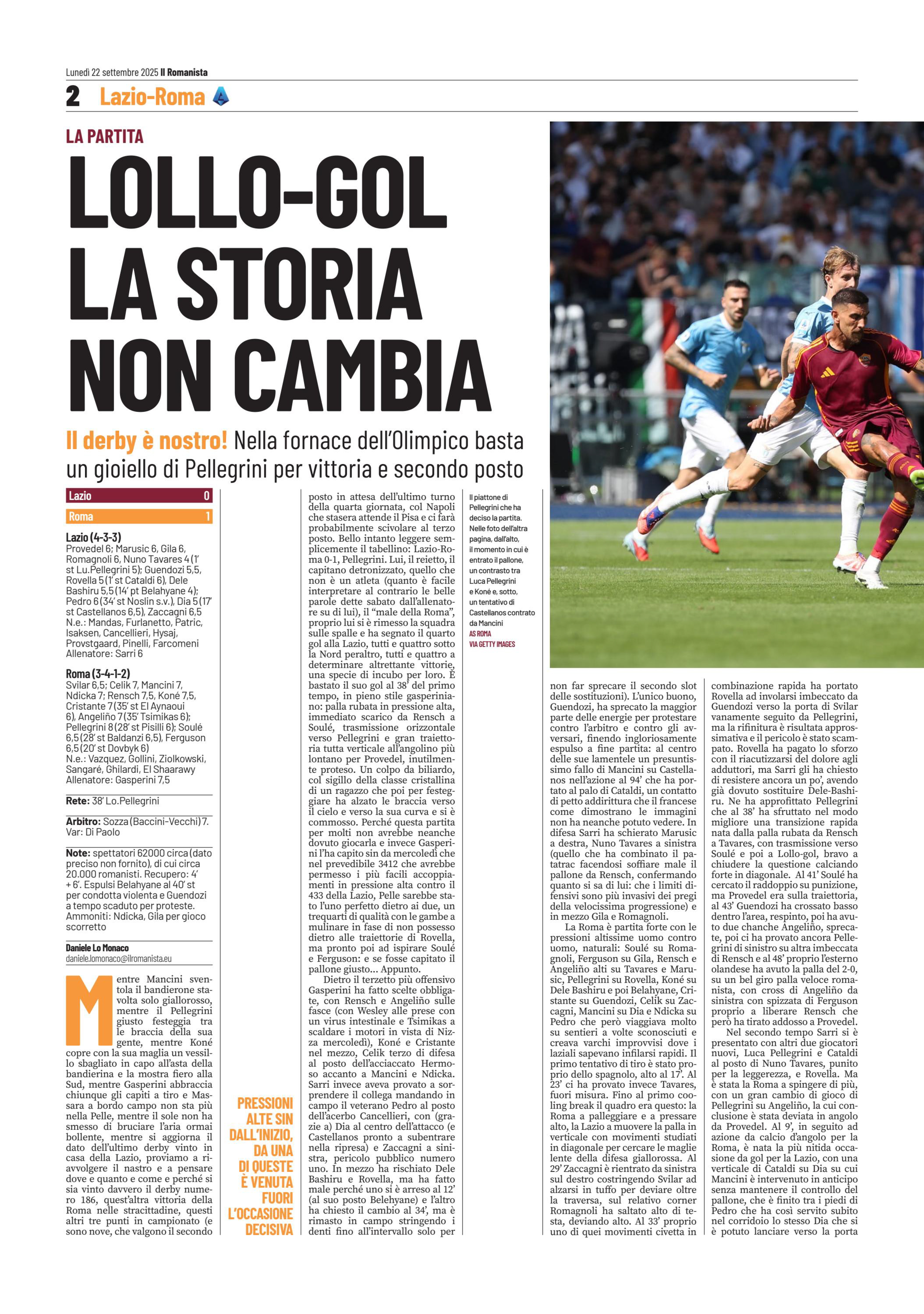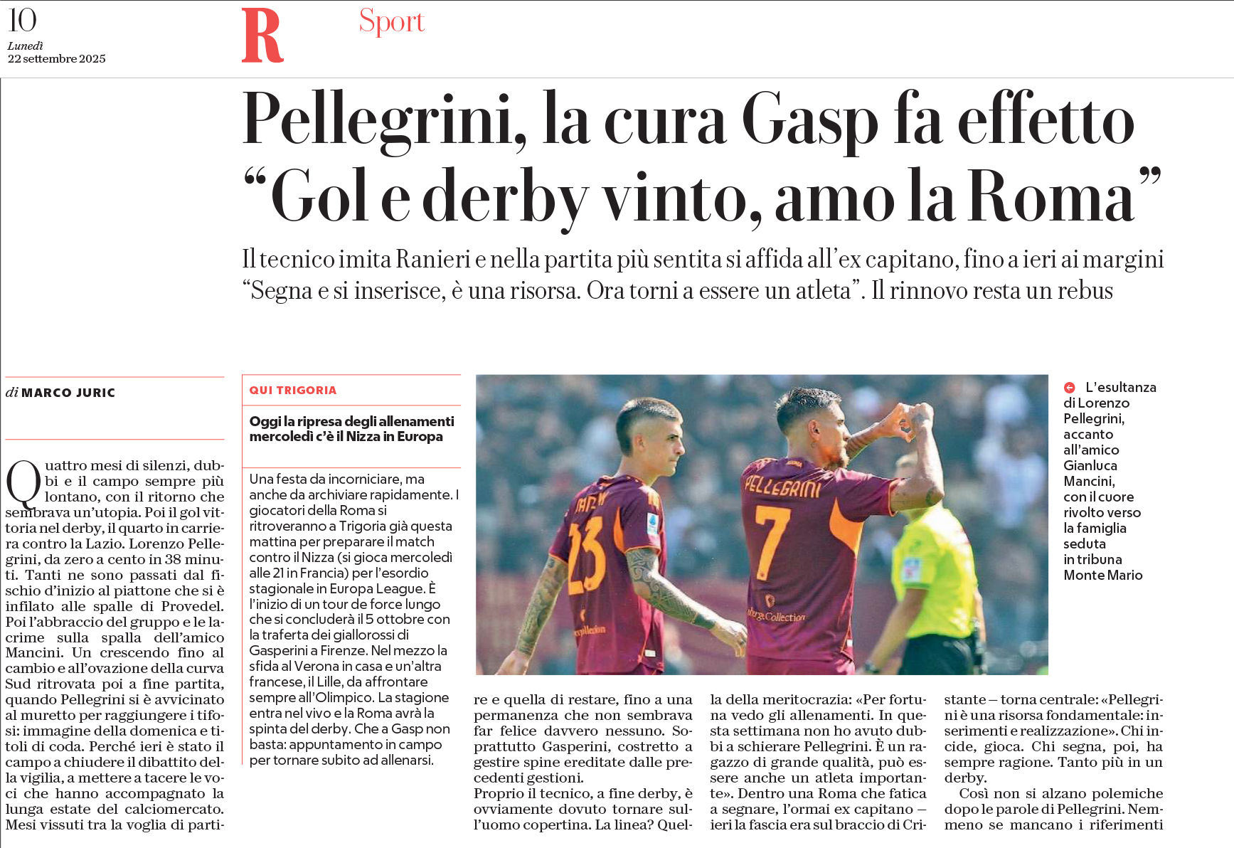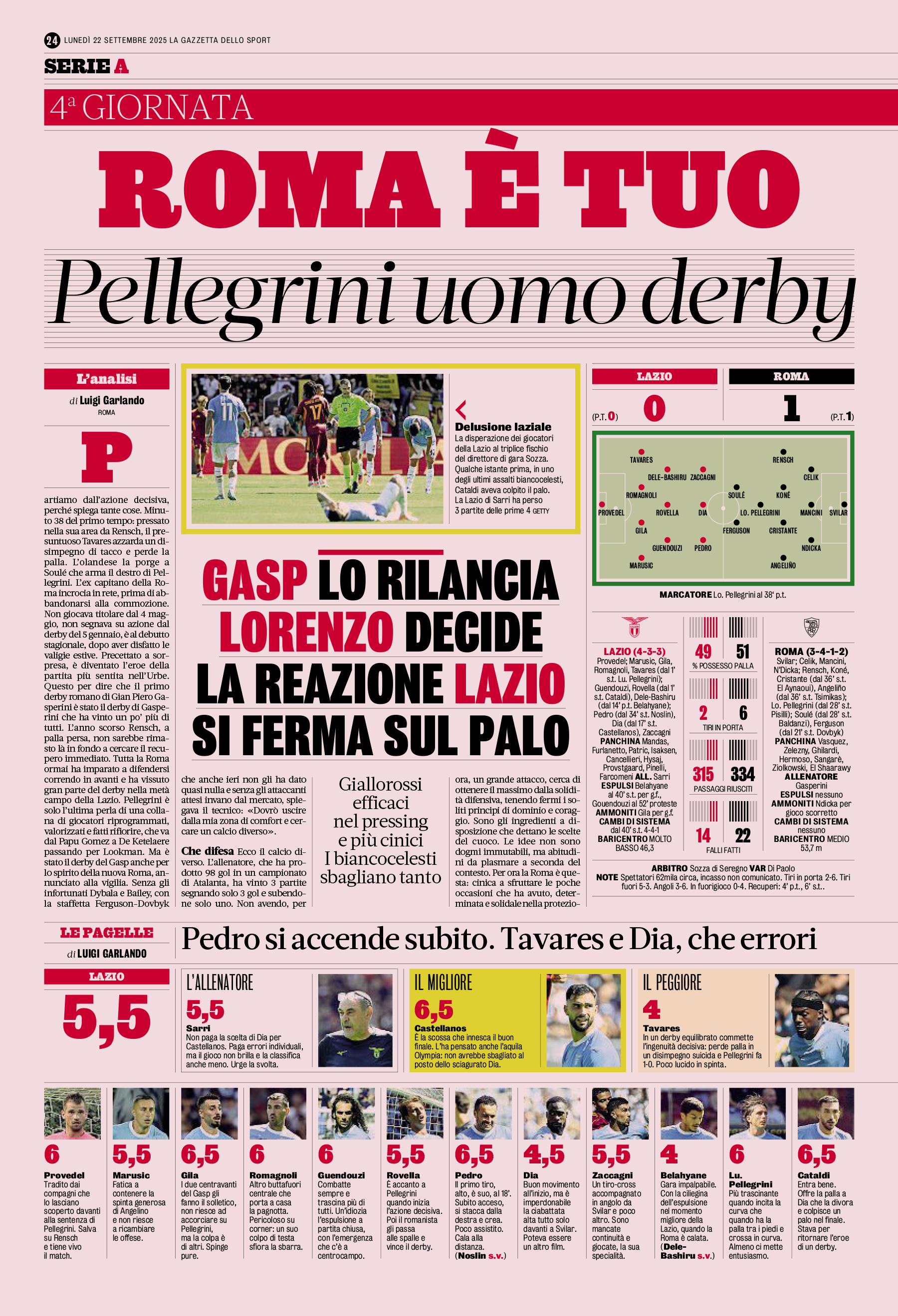 ROMA (3-5-2): Svilar 6.5; Celik 6, Mancini 6.5, Ndicka 6; Rensch 6, Cristante 6 (81' El Ayanaoui 6), Koné 7, Pellegrini 7 (73' Pisilli 6), Angelino 6.5 (81' Tsimikas 5.5); Soulé 6.5 (73' Baldanzi 6), Ferguson 5.5 (66' Dovbyk 6). All. Gasperini.