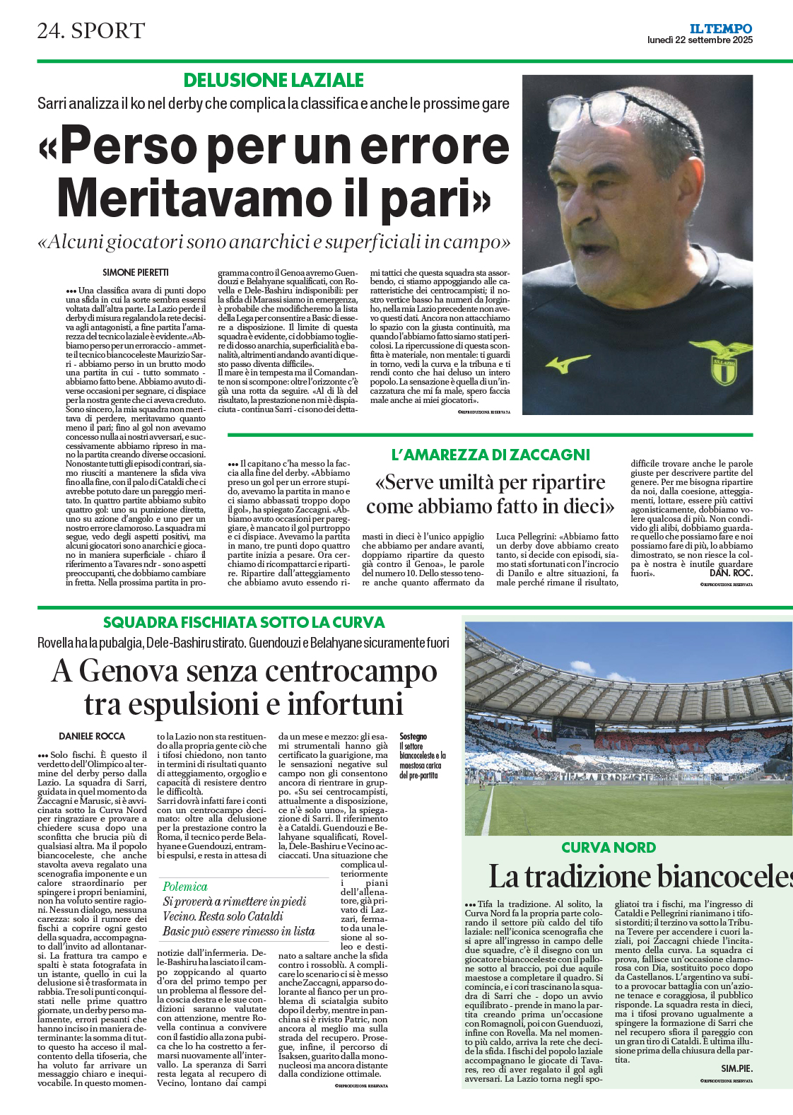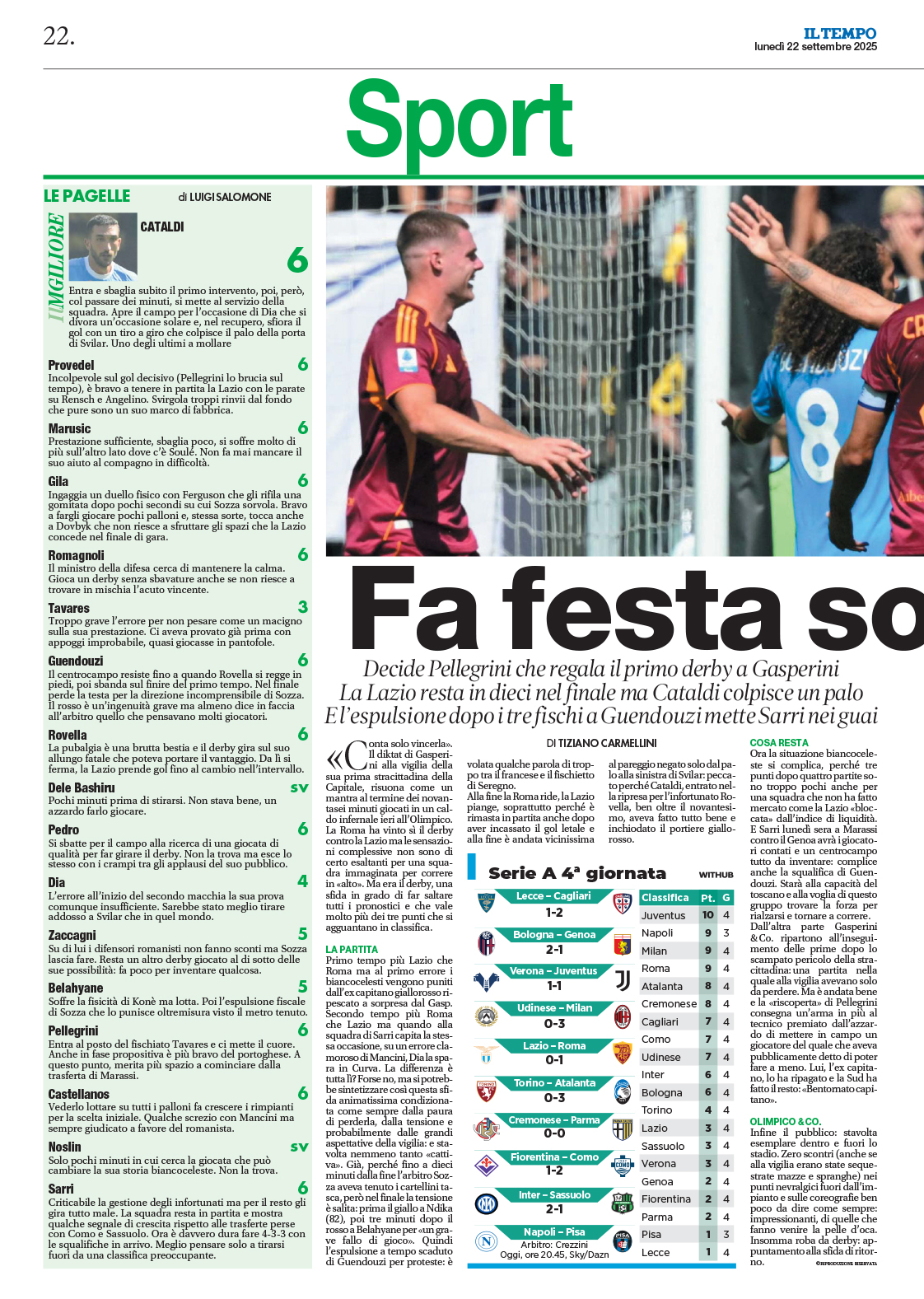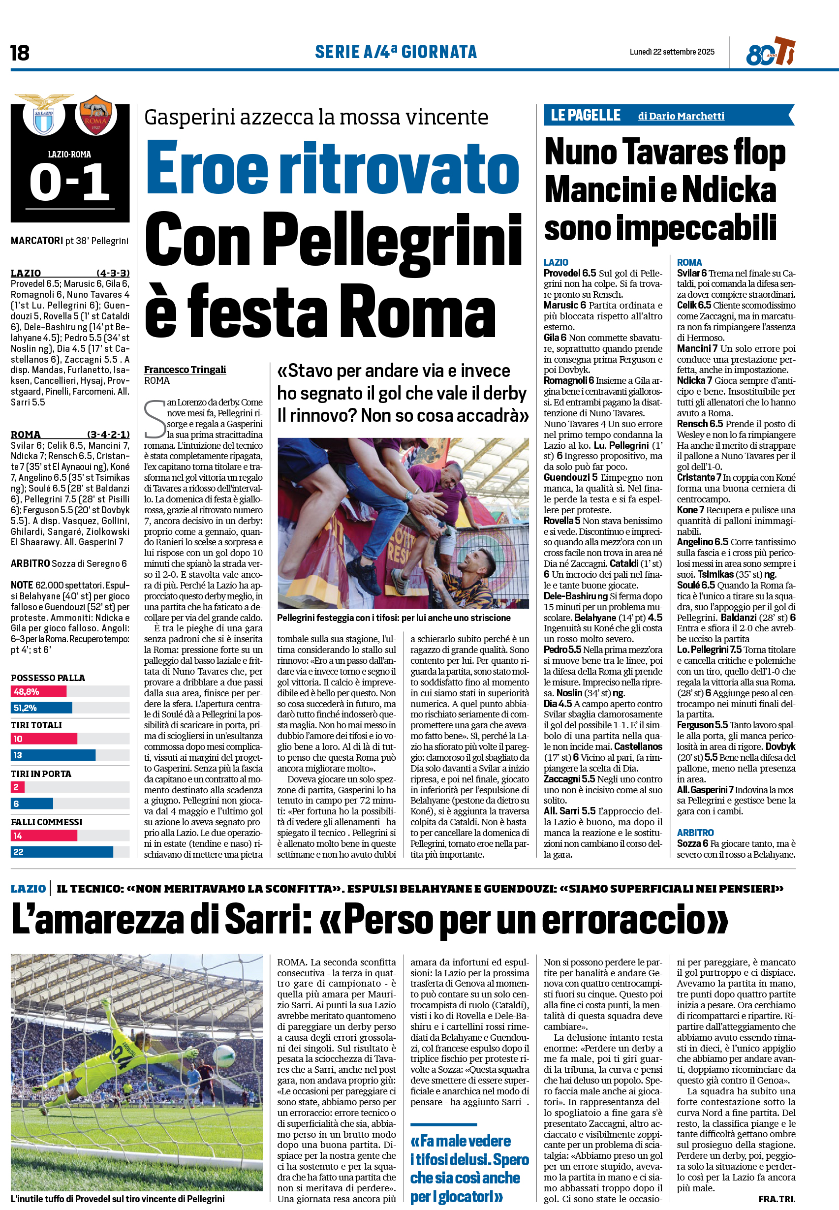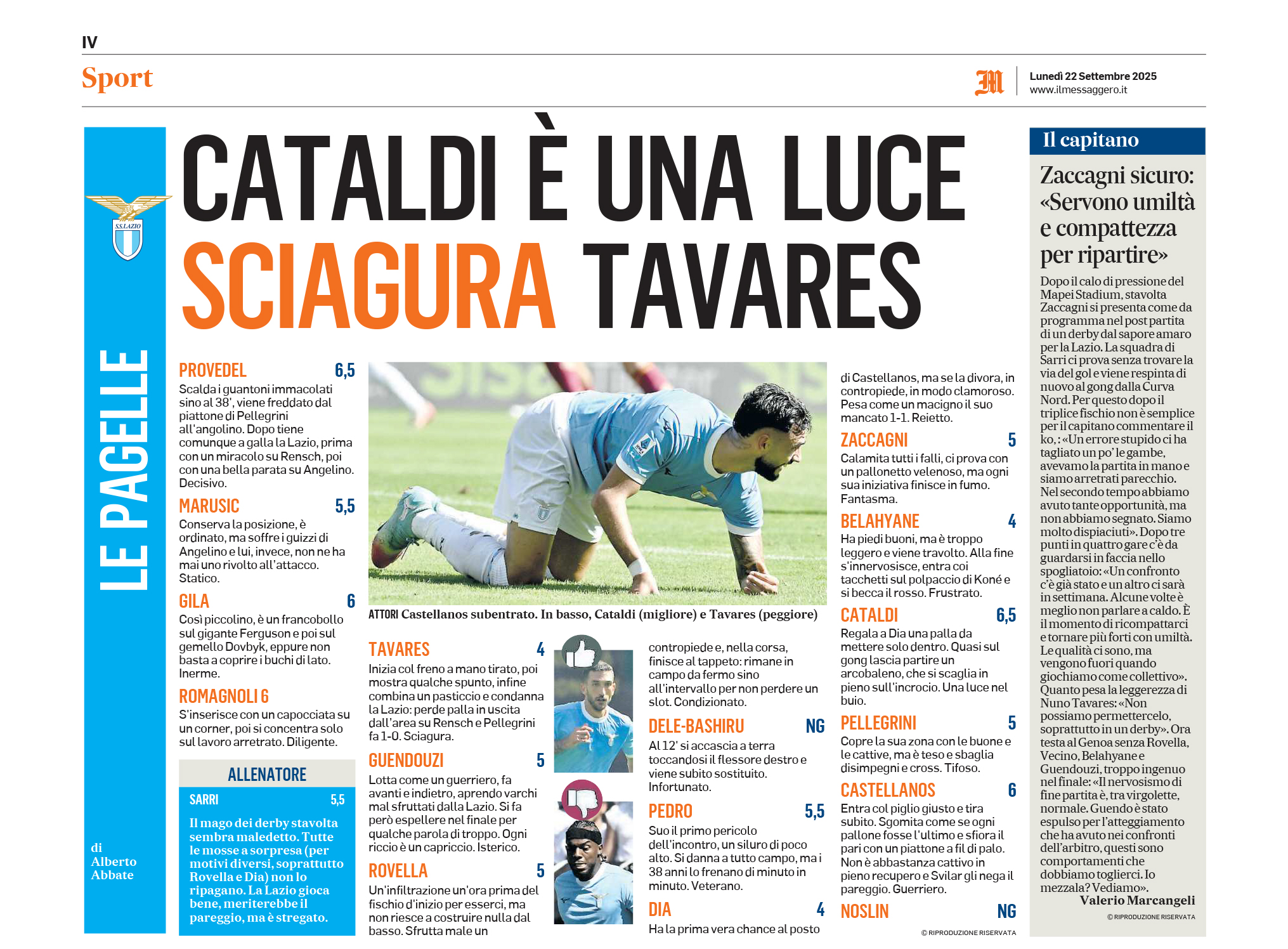 LAZIO (4-3-3): Provedel 6; Marusic 6, Gila 6, Romagnoli 5.5, Tavares 4.5 (46' Pellegrini 6); Guendouzi 5.5, Rovella 6 (46' Cataldi 6), Dele-Bashiru sv (14' Belahyane 5); Pedro 6 (79' Noslin 6), Dia 5.5 (62' Castellanos 6.5), Zaccagni 5.5. All. Sarri.