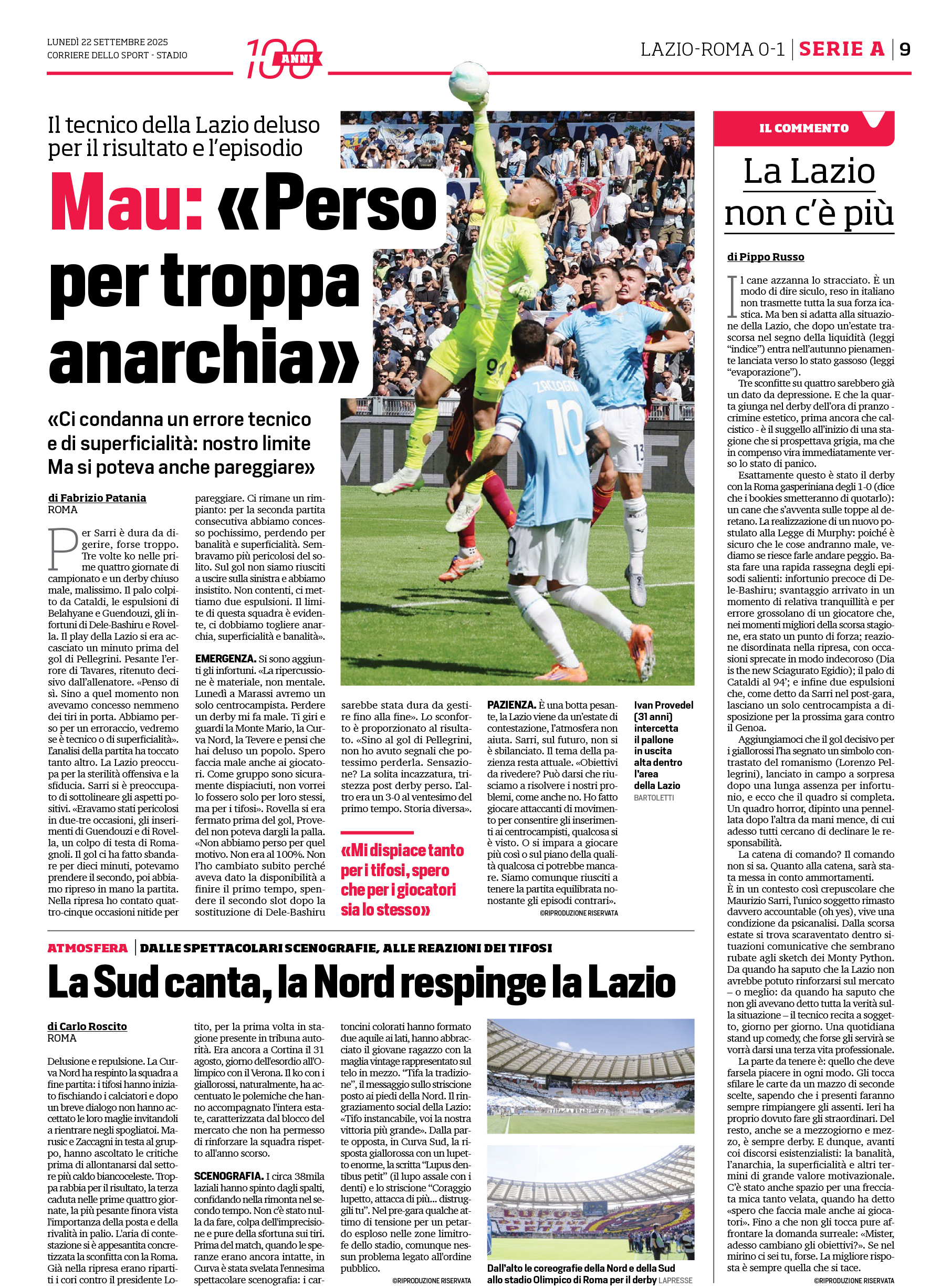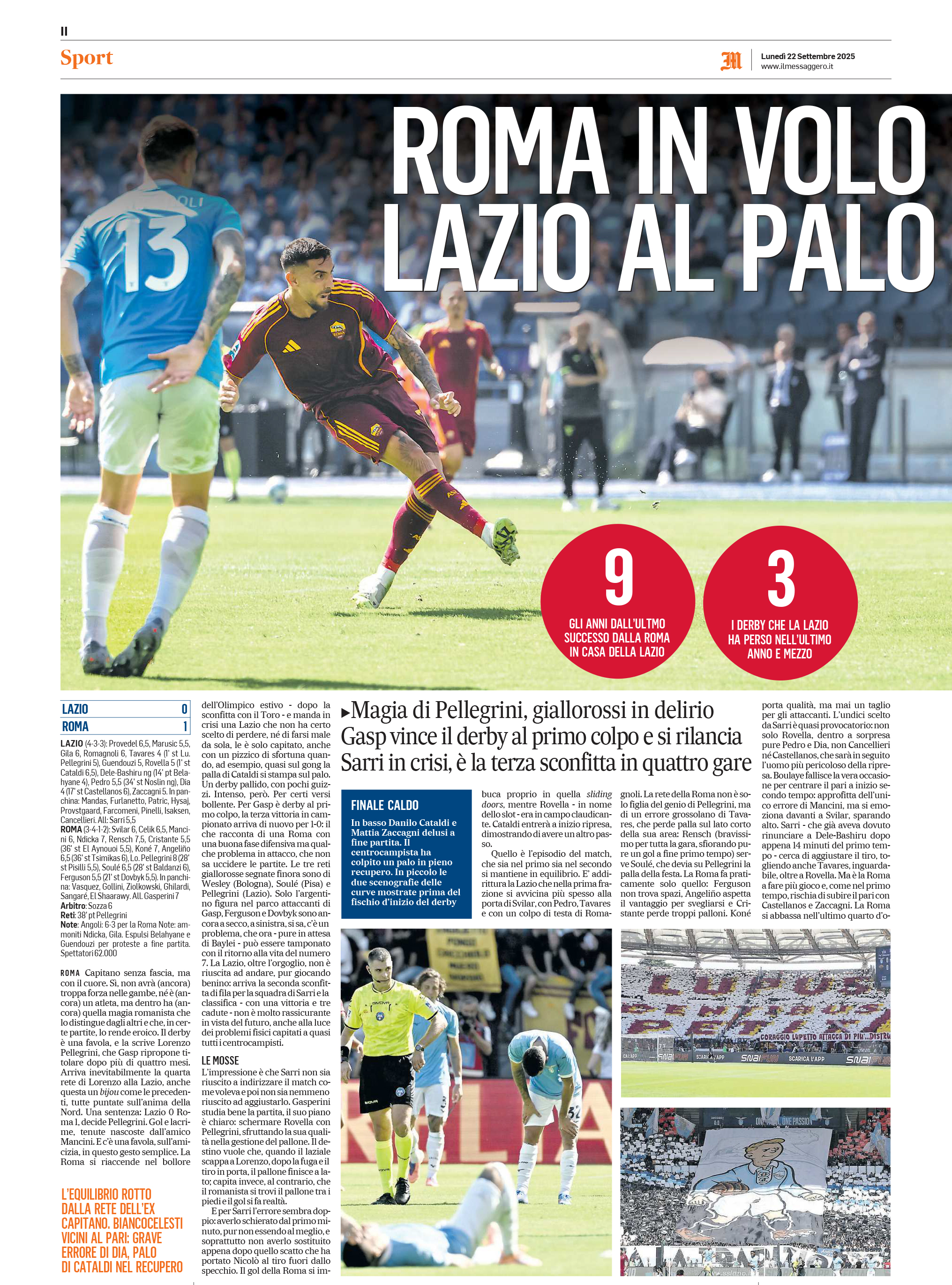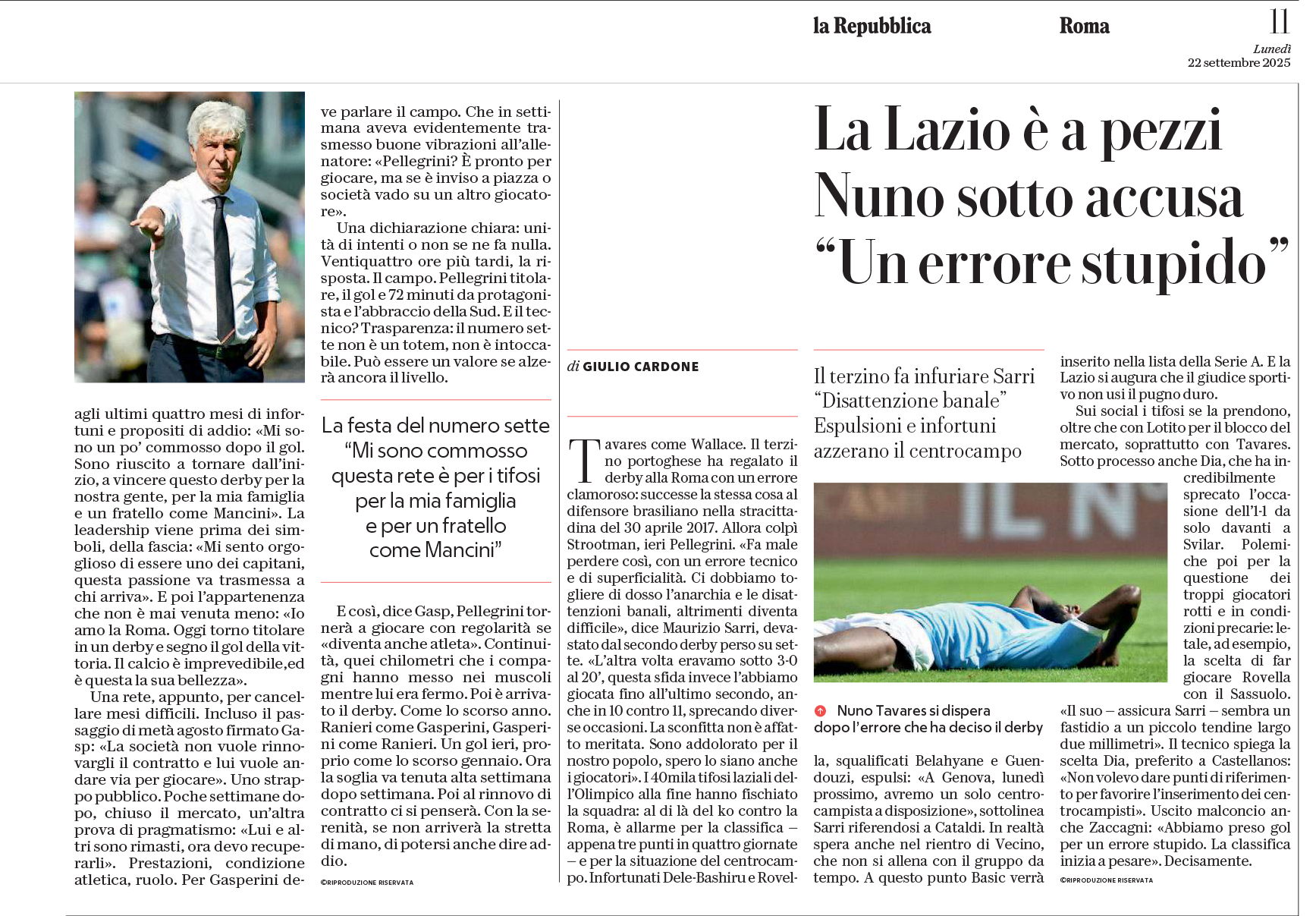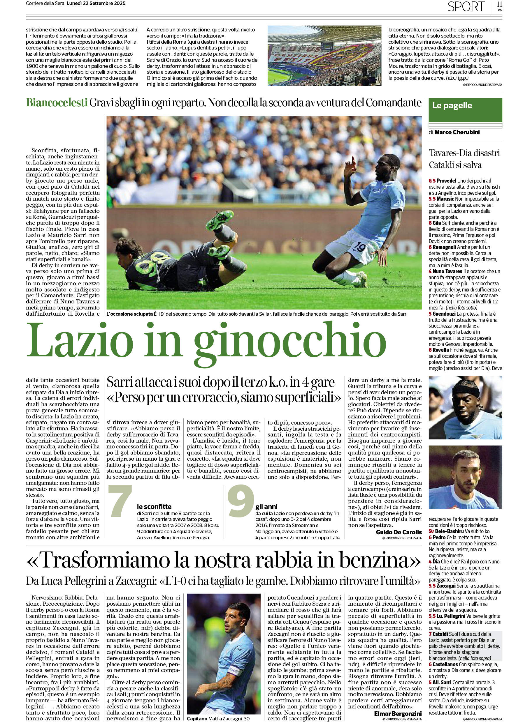 LAZIO (4-3-3): Provedel 6; Marusic 6, Gila 6, Romagnoli 5.5, Tavares 4.5 (46' Pellegrini 6); Guendouzi 5.5, Rovella 6 (46' Cataldi 6), Dele-Bashiru sv (14' Belahyane 5); Pedro 6 (79' Noslin 6), Dia 5.5 (62' Castellanos 6.5), Zaccagni 5.5. All. Sarri.